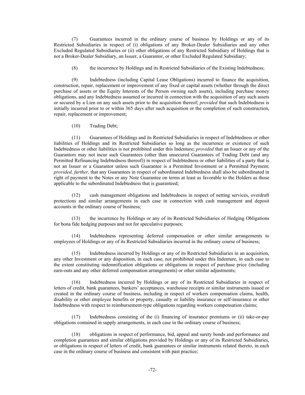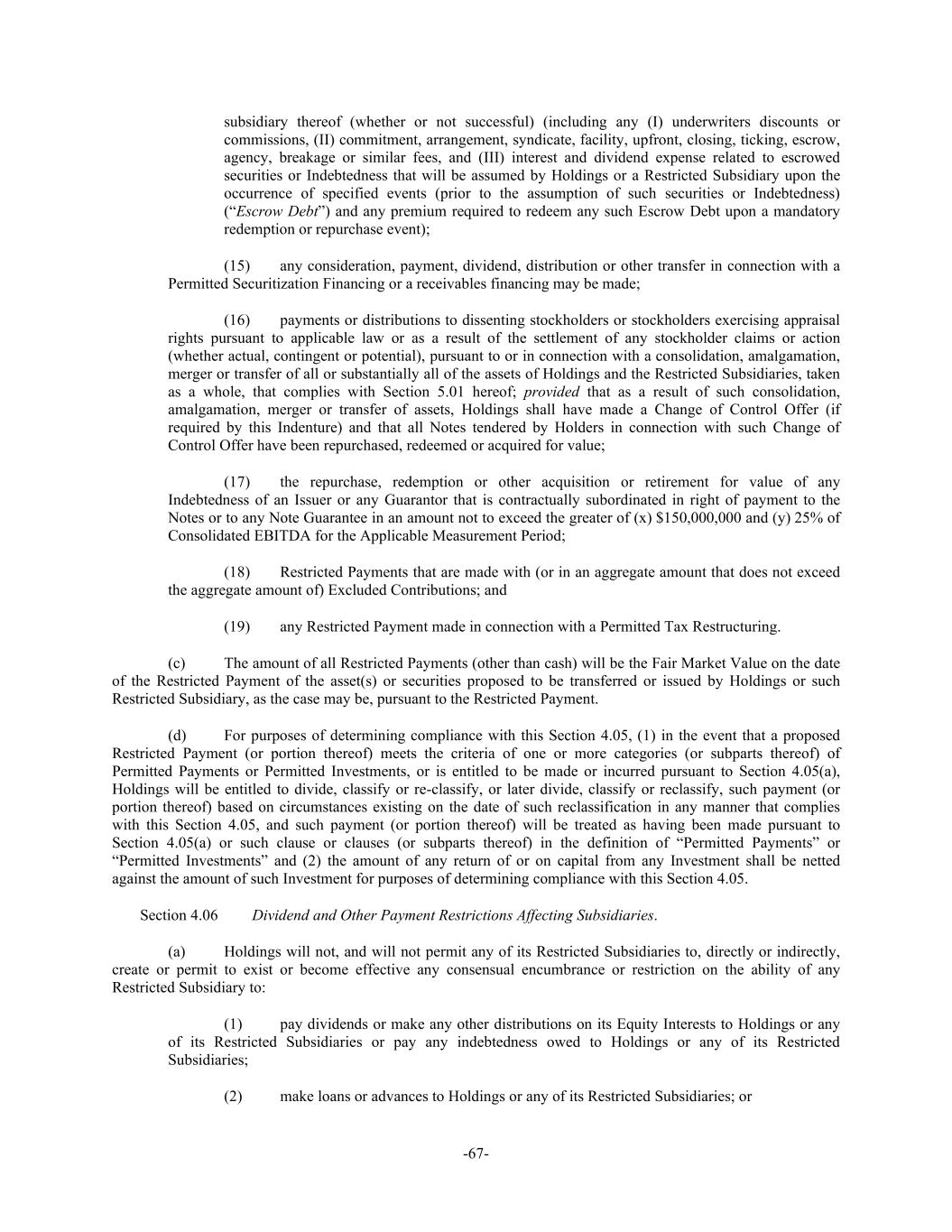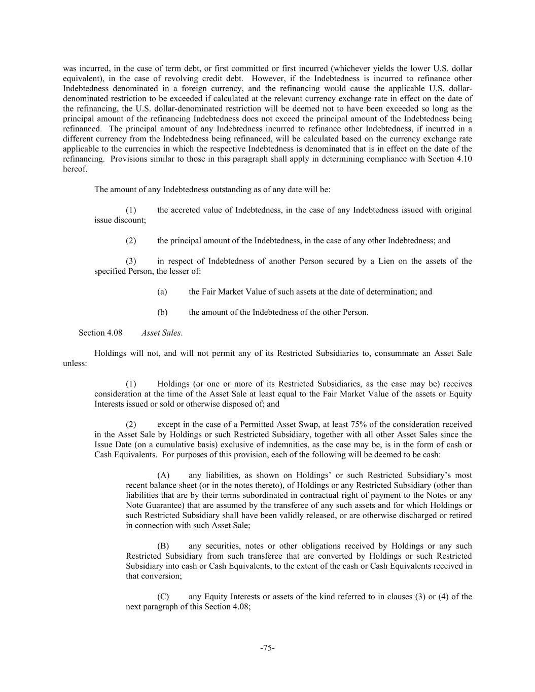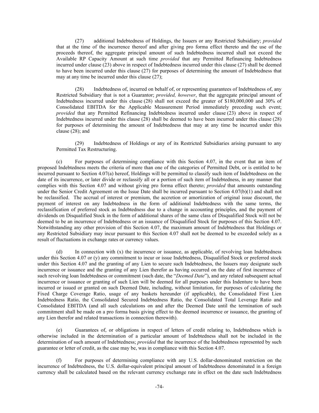 127 than provisions related to customary asset sale and change of control offers) that would result in prepayments of such Indebtedness prior to the Initial Term B-1 Loans; provided, however, that if such Indebtedness is secured on a pari passu basis with the Initial Term B-1 Loans, such Indebtedness may have mandatory prepayment provisions that provide for pro rata or less than pro rata (but not greater than pro rata) prepayments with the Initial Term B-1 Loans; provided that at the time of incurrence thereof, the aggregate outstanding principal amount of Indebtedness (other than Indebtedness constituting any revolving facility) incurred by Restricted Subsidiaries that are not Loan Parties or Regulated Subsidiaries under this Section 6.01(a)(xxii), together with the Indebtedness incurred by Restricted Subsidiaries that are not Loan Parties or Regulated Subsidiaries under clauses (x), (y) and (z) of Section 6.01(a)(viii) and clauses (x), (y) and (z) of Section 6.01(a)(viii), collectively, shall not exceed the greater of $150,000,000 and 10% of Consolidated EBITDA calculated on a Pro Forma Basis for the most recently ended Test Period for which financial statements are available, and (B) any Permitted Refinancing thereof; (xxiii) Trading Debt incurred in the ordinary course of business or in a manner consistent with past practices; (xxiv) (A) Indebtedness of Joint Ventures and/or Indebtedness incurred on behalf thereof or representing Guarantees of Indebtedness of Joint Ventures; provided that at the time of the incurrence thereof and after giving Pro Forma Effect thereto and the use of proceeds thereof, the aggregate principal amount of Indebtedness outstanding in reliance on this clause (xxiv), together with the aggregate principal amount of Indebtedness outstanding in reliance on clause (xxv) below, shall not exceed the greater of $250,000,000 and 25% of Consolidated EBITDA calculated on a Pro Forma Basis for the most recently ended Test Period for which financial statements are available and (B) any Permitted Refinancing thereof; (xxv) (A) Indebtedness of a Restricted Subsidiary that is not a Loan Party; provided that at the time of the incurrence thereof and after giving Pro Forma Effect thereto and the use of proceeds thereof, the aggregate principal amount of Indebtedness outstanding in reliance on this clause (xxv), together with the aggregate principal amount of Indebtedness outstanding in reliance on clause (xxiv) above, shall not exceed the greater of $300,000,000 and 30% of Consolidated EBITDA calculated on a Pro Forma Basis for the most recently ended Test Period for which financial statements are available and (B) any Permitted Refinancing thereof; (xxvi) additional Indebtedness of Holdings, the Borrower or any Restricted Subsidiary; provided that at the time of the incurrence thereof and after giving Pro Forma Effect thereto and the use of the proceeds thereof, the aggregate principal amount of such Indebtedness incurred shall not exceed the Available RP Capacity Amount at such time; (xxvii) Indebtedness in connection with Permitted Securitization Financings; and (xxviii) all premiums (if any), interest (including post-petition interest and capitalized or paid in kind interest), fees, expenses, charges and additional or contingent interest on obligations described in clauses (i) through (xxvii) above. (b) Neither Holdings nor the Borrower will, nor will they permit any Restricted Subsidiary to, issue any preferred Equity Interests or any Disqualified Equity Interests, except (A) in the case of Holdings, preferred Equity Interests that are Qualified Equity Interests and (B) in the case of the Borrower or any Restricted Subsidiary, preferred Equity Interests issued to and held by Holdings, the Borrower or any Restricted Subsidiary.