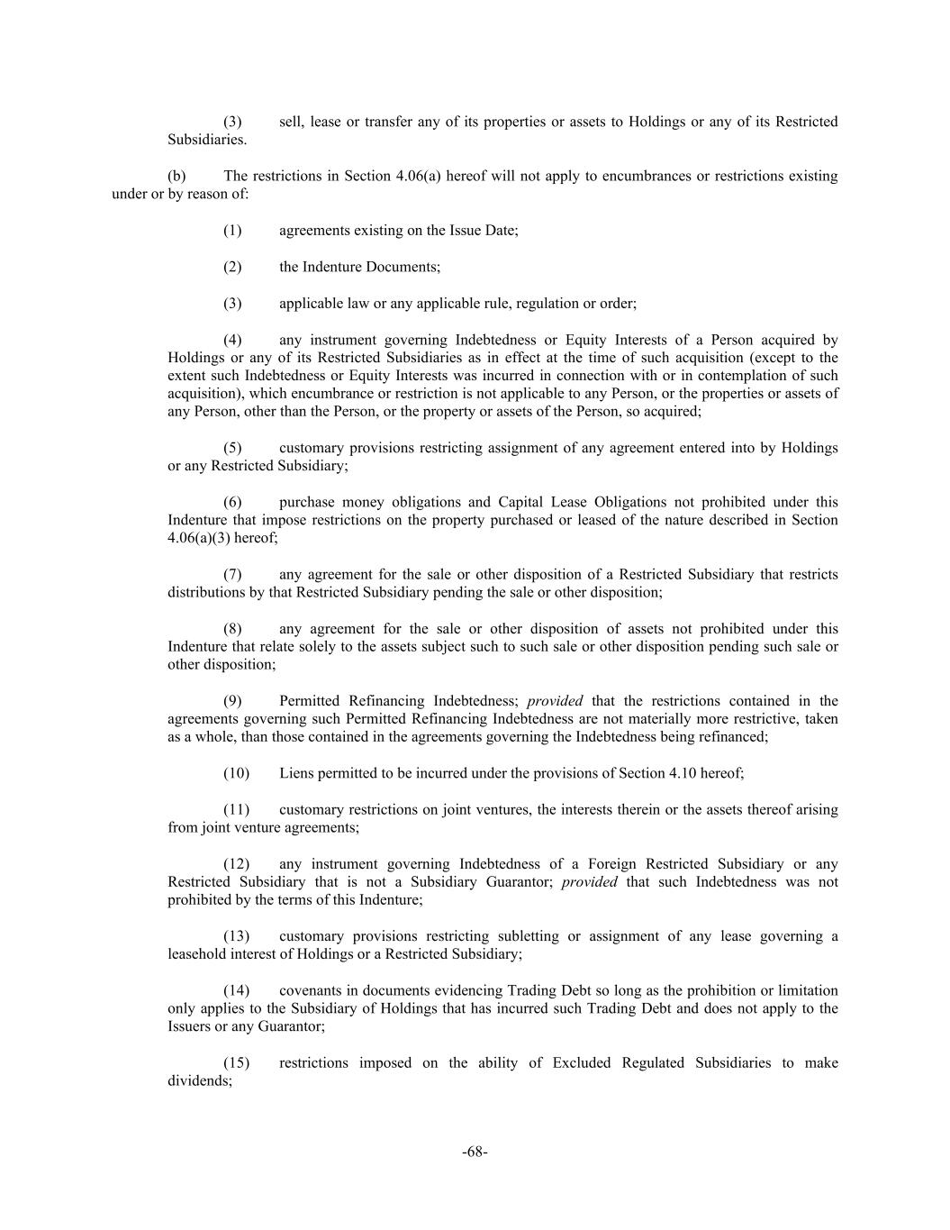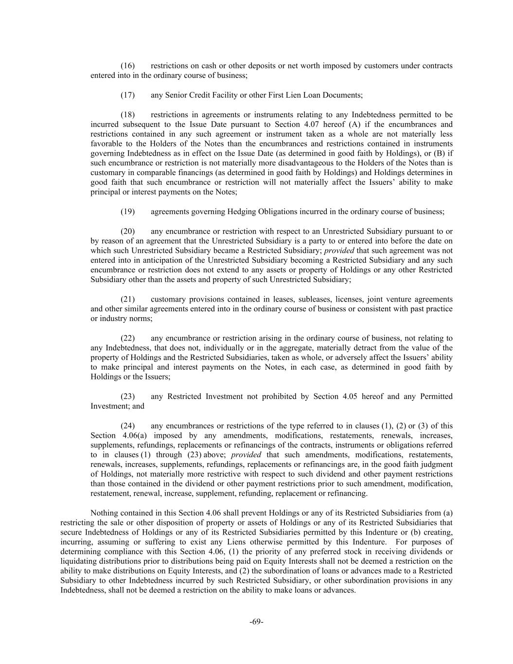 145 (v) are customary provisions in joint venture agreements and other similar agreements applicable to joint ventures permitted under Section 6.04; (vi) are negative pledges and restrictions on Liens in favor of any holder of Indebtedness permitted under Section 6.01 but solely to the extent any negative pledge relates to the property financed by or securing such Indebtedness (and excluding in any event any Indebtedness constituting any Junior Financing); (vii) are imposed by (v) Requirements of Law, (w) any Loan Document, (x) the Secured Notes Documents or any documentation governing Incremental Equivalent Debt, and any Permitted Refinancing in respect thereof, (y) any documentation governing Credit Agreement Refinancing Indebtedness and (z) any documentation governing any Permitted First Priority Refinancing Debt, andPermitted Junior Lien Refinancing Debt, Permitted Unsecured Refinancing Debt or Permitted Refinancing incurred to refinance any such Indebtedness referenced in clauses (vw) through (z) above; (viii) are customary restrictions contained in leases, subleases, licenses or asset sale agreements otherwise permitted hereby so long as such restrictions relate only to the assets subject thereto; (ix) comprise restrictions imposed by any agreement relating to secured Indebtedness permitted pursuant to Section 6.01(a)(v) to the extent that such restrictions apply only to the property or assets securing such Indebtedness; (x) are customary provisions restricting subletting or assignment of any lease governing a leasehold interest of Holdings, any Intermediate Parent, the Borrower or any Restricted Subsidiary; (xi) are customary provisions restricting assignment of any license, lease or other agreement; (xii) are restrictions on cash (or Permitted Investments) or deposits imposed by customers under contracts entered into in the ordinary course of business (or otherwise constituting Permitted Encumbrances on such cash or Permitted Investments or deposits); (xiii) are customary net worth provisions contained in real property leases or licenses of intellectual property entered into by the Borrower or its Subsidiaries, so long as the Borrower has determined in good faith that such net worth provisions could not reasonably be expected to impair the ability of the Borrower and its Restricted Subsidiaries to meet their ongoing obligations under the Loan Documents; (xv) any restriction on a Subsidiary imposed pursuant to an agreement entered into for the sale or disposition of all of the Equity Interests or all or substantially all of the assets of such Subsidiary pending the closing of such sale or disposition; (xvii) customary restrictions and conditions contained in the document relating to any Lien permitted hereunder, so long as (1) such restrictions or conditions relate only to the specific asset subject to such Lien, and (2) such restrictions and conditions are not created for the purpose of avoiding the restrictions imposed by this Section 6.10; (xviii) customary restrictions contained in leases, subleases, licenses or Equity Interests or asset sale agreements otherwise permitted hereby as long as such restrictions relate to the Equity Interests and assets subject thereto; or