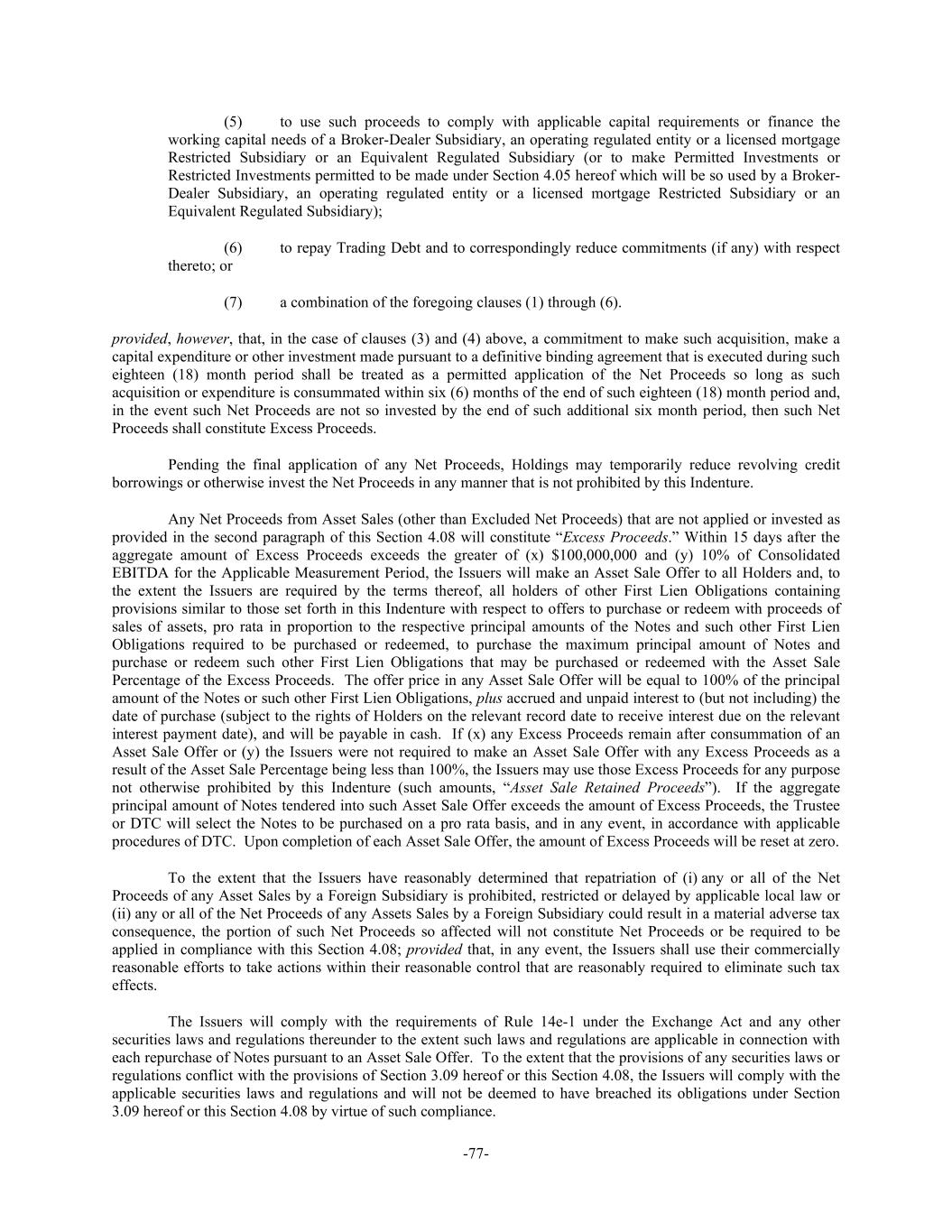 111 Section 3.18. Regulatory Status and Memberships Held. (a) Except as set forth on Schedule 3.18, each Broker-Dealer Subsidiary is duly (i) registered, licensed or qualified as a broker-dealer and is in compliance in all material respects with all Requirements of Law of all material jurisdictions in which it is required to be so registered, licensed or qualified and each such registration, license or qualification is in full force and effect and (ii) registered as a broker-dealer with the SEC under the Exchange Act and is in compliance in all material respects with the applicable provisions of the Exchange Act and all rules and regulations thereunder and applicable state securities laws, including the net capital requirements and customer protection requirements thereof. (b) Each Subsidiary of the Borrower listed on Schedule 3.18 is duly registered with, or a member of, the Regulatory Supervising Organization(s) indicated for such Subsidiary and is in compliance in all material respects with all applicable rules and regulations of such Regulatory Supervising Organization(s). Section 3.19. PATRIOT Act, OFAC and FCPA. (a) Holdings, the Borrower and the Subsidiaries will not, directly or indirectly, use the proceeds of the Loans, or lend, contribute or otherwise make available such proceeds to any Subsidiary, joint venture partner or other Person, for the purpose of funding (i) any activities of or business with any Person, or in any country or territory, that, at the time of such funding, is the subject of Sanctions, or (ii) any other transaction that will result in a violation by any Person (including any Person participating in the transaction, whether as underwriter, advisor, investor, lender or otherwise) of Sanctions. (b) Holdings, the Borrower and the Restricted Subsidiaries will not use the proceeds of the Loans directly, or, to the knowledge of Holdings, indirectly, for any payments to any governmental official or employee, political party, official of a political party, candidate for political office, or anyone else acting in an official capacity, in order to obtain, retain or direct business or obtain any improper advantage, in violation of the United States Foreign Corrupt Practices Act of 1977, as amended (the “FCPA”). (c) Except as could not, individually or in the aggregate, reasonably be expected to result in a Material Adverse Effect, none of Holdings, the Borrower or any Subsidiary has, in the past three years, committed a violation of applicable regulations of the United States Department of the Treasury’s Office of Foreign Assets Control (“OFAC”), Title III of the USA Patriot Act or the FCPA. (d) (i) None of the Loan Parties is an individual or entity currently on OFAC’s list of Specially Designated Nationals and Blocked Persons (the “SDN List”) or is owned 50% or more, directly or indirectly, by one or more parties on the SDN List and (ii) except as would not, individually or in the aggregate, reasonably be expected to result in a Material Adverse Effect, none of the Restricted Subsidiaries that are not Loan Parties or, to the knowledge of Holdings, any director, officer, employee or agent of any Loan Party or other Restricted Subsidiary, in each case, is an individual or entity currently on the SDN List or is owned 50% or more, directly or indirectly, by one or more parties on the SDN List, nor is Holdings, the Borrower or any Restricted Subsidiary located, organized or resident in a country or territory that is the subject of Sanctions. Section 3.20. EEA Financial Institutions. No Loan Party is an EEA Financial Institution.