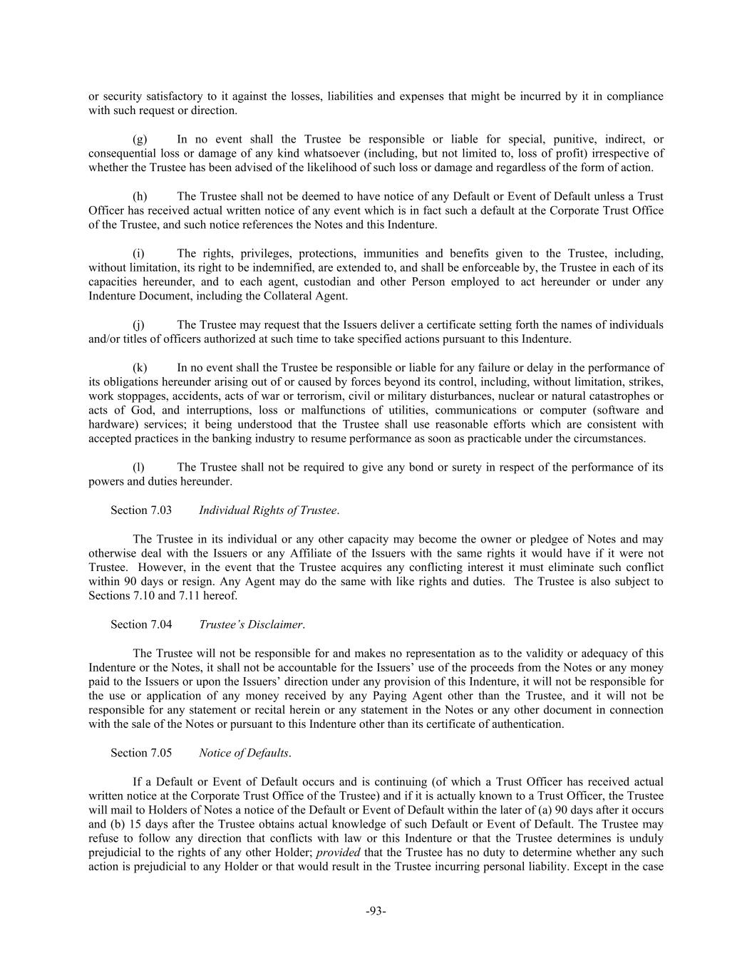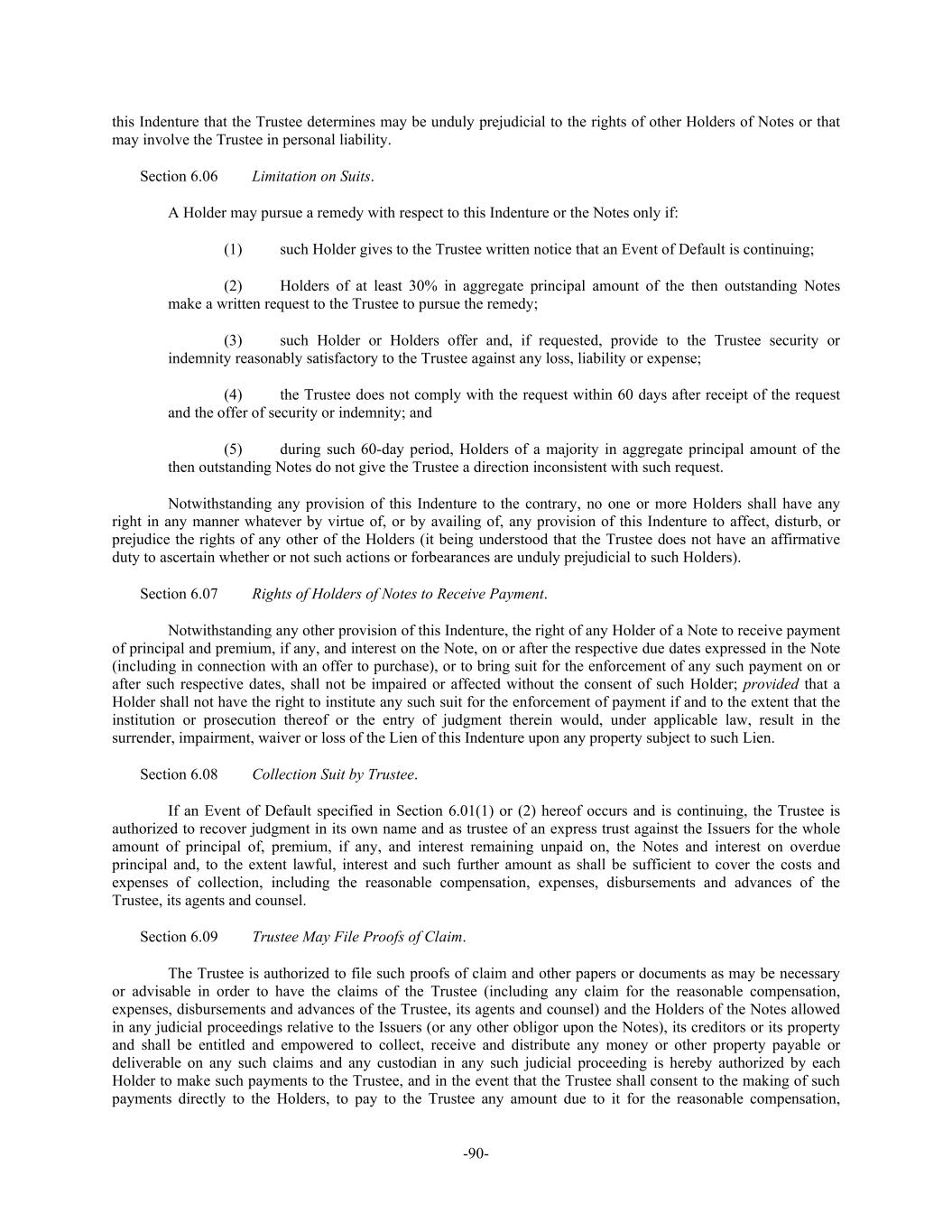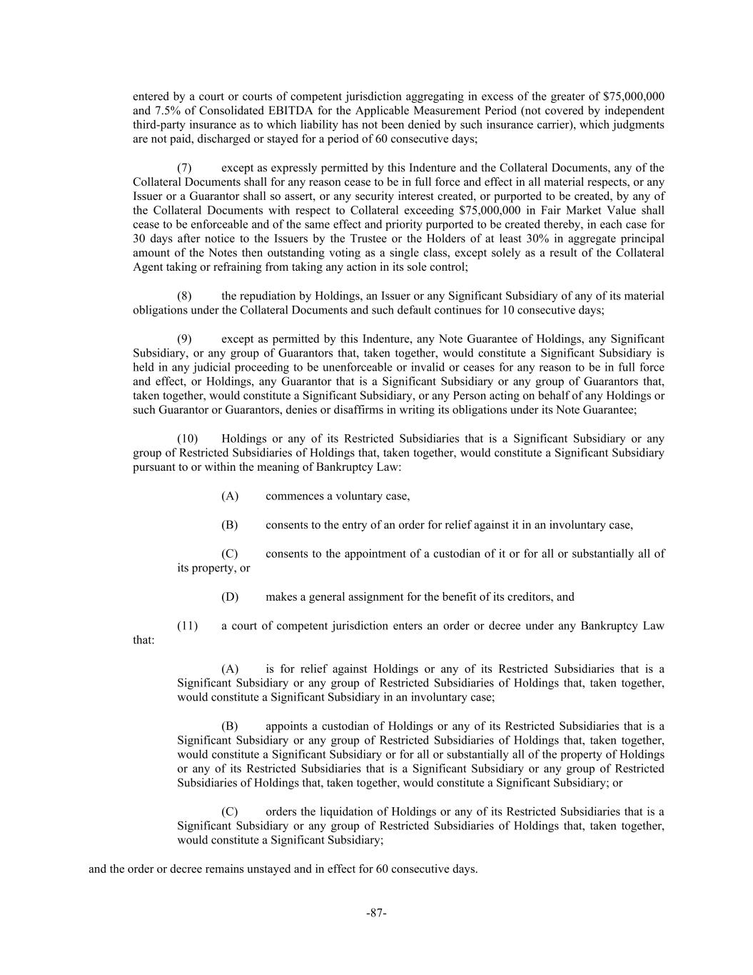 147 and Revolving Loans and have not rescinded such demand or acceleration (the “Financial Covenant Standstill”); (e) Holdings, the Borrower or any of its Restricted Subsidiaries shall fail to observe or perform any covenant, condition or agreement contained in any Loan Document (other than those specified in paragraph (a), (b) or (d) of this Section), and such failure shall continue unremedied for a period of 30 days after notice thereof from the Administrative Agent to the Borrower; (f) Holdings, the Borrower or any of its Restricted Subsidiaries shall fail to make any payment (whether of principal or interest and regardless of amount) in respect of any Material Indebtedness, when and as the same shall become due and payable (after giving effect to any applicable grace period); (g) any event or condition occurs that results in any Material Indebtedness becoming due prior to its scheduled maturity or that enables or permits (with all applicable grace periods having expired) the holder or holders of any Material Indebtedness or any trustee or agent on its or their behalf to cause any Material Indebtedness to become due, or to require the prepayment, repurchase, redemption or defeasance thereof, prior to its scheduled maturity, provided that this paragraph (g) shall not apply to (i) secured Indebtedness that becomes due as a result of the sale, transfer or other disposition (including as a result of a casualty or condemnation event) of the property or assets securing such Indebtedness (to the extent such sale, transfer or other disposition is not prohibited under this Agreement), (ii) Trading Debt (it being understood that paragraph (f) of this Section will apply to any failure to make any payment in respect of any Trading Debt), (iii) termination events or similar events occurring under any Swap Agreement that constitutes Material Indebtedness (it being understood that paragraph (f) of this Section will apply to any failure to make any payment required as a result of any such termination or similar event) or (iv) Indebtedness with respect to Permitted Securitization Financings; (h) an involuntary proceeding shall be commenced or an involuntary petition shall be filed seeking (i) liquidation, court protection, reorganization or other relief in respect of Holdings, the Borrower or any Material Subsidiary or its debts, or of a material part of its assets, under any Federal, state or foreign bankruptcy, insolvency, receivership or similar law now or hereafter in effect or (ii) the appointment of a receiver, trustee, custodian, examiner, sequestrator, conservator or similar official for Holdings, the Borrower or any Material Subsidiary or for a material part of its assets, and, in any such case, such proceeding or petition shall continue undismissed or unstayed for 60 days or an order or decree approving or ordering any of the foregoing shall be entered; (i) Holdings, the Borrower or any other Material Subsidiary shall (i) voluntarily commence any proceeding or file any petition seeking liquidation, court protection, reorganization or other relief under any Federal, state or foreign bankruptcy, insolvency, receivership or similar law now or hereafter in effect, (ii) consent to the institution of, or fail to contest in a timely and appropriate manner, any proceeding or petition described in paragraph (h) of this Section, (iii) apply for or consent to the appointment of a receiver, trustee, examiner, custodian, sequestrator, conservator or similar official for Holdings, the Borrower or any Material Subsidiary or for a material part of its assets, (iv) file an answer admitting the material allegations of a petition filed against it in any such proceeding or (v) make a general assignment for the benefit of creditors; (j) one or more enforceable judgments for the payment of money in an aggregate amount in excess of $50,000,000 (to the extent not covered by insurance as to which the insurer has been notified of such judgment or order and has not denied coverage) shall be rendered against Holdings, the Borrower and any of its Restricted Subsidiaries or any combination thereof and the same shall remain undischarged for a period of 60 consecutive days during which execution shall not be effectively stayed, or any judgment creditor shall legally attach or levy upon assets of any such Loan Party that are material to the businesses