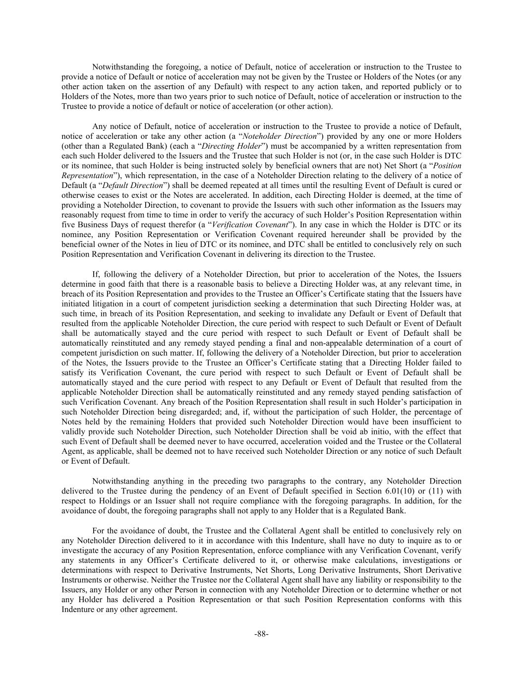 163 Commitments and shall be deemed to have voted its interest as a Lender without discretion in the same proportion as the allocation of voting with respect to such matter by Lenders who are not Net Short Lenders (in each case unless otherwise agreed to by the Borrower). In connection with any such determination, each Lender (other than (any Lender that is a Regulated Bank) shall promptly notify the Administrative Agent in writing that it is a Net Short Lender, or shall otherwise be deemed to have represented and warranted to the Borrower and the Administrative Agent that it is not a Net Short Lender (it being understood and agreed that (i) the Borrower and the Administrative Agent shall be entitled to rely on each such representation and deemed representation and (ii) the Administrative Agent shall be entitled to the exculpatory provisions of Section 8.01 with respect to each such representation and deemed representation). In respect of any notice of Default, such representation shall be deemed repeated at all times until the resulting Event of Default is cured or otherwise ceases to exist or the Loans are accelerated. For purposes of determining whether a Lender (alone or together with its Affiliates (other than Ethically Screened Affiliates), but subject to clause (vi) below)) has a “net short position” on any date of determination: (i) derivative contracts with respect to the Loans and/or Commitments and such contracts that are the functional equivalent thereof shall be counted at the notional amount thereof in dollars, (ii) notional amounts in other currencies shall be converted to the dollar equivalent thereof by such Lender in a commercially reasonable manner consistent with generally accepted financial practices and based on the prevailing conversion rate (determined on a mid-market basis) on the date of determination, (iii) derivative contracts in respect of an index that includes any of the Borrower or other Loan Parties or any instrument issued or guaranteed by any of the Borrower or other Loan Parties shall not be deemed to create a short position with respect to the Loans and/or Commitments, so long as (x) such index is not created, designed, administered or requested by such Lender or its Affiliates (other than its Excluded Affiliates or Ethically Screened Affiliates) and (y) the Borrower and other Loan Parties and any instrument issued or guaranteed by any of the Borrower or other Loan Parties, collectively, shall represent less than 5% of the components of such index, (iv) derivative transactions that are documented using the ISDA Definitions shall be deemed to create a short position with respect to the Loans and/or Commitments if such Lender (or any of its Affiliates (other than its Excluded Affiliates or Ethically Screened Affiliates) is a protection buyer or the equivalent thereof for such derivative transaction and (x) the Loans and/or the Commitments are a “Reference Obligation” under the terms of such derivative transaction (whether specified by name in the related documentation, included as a “Standard Reference Obligation” on the most recent list published by Markit, if “Standard Reference Obligation” is specified as applicable in the relevant documentation or in any other manner), (y) the Loans and/or the Commitments would be a “Deliverable Obligation” under the terms of such derivative transaction or (z) any of the Borrower or other Loan Parties (or any of their successors) is designated as a “Reference Entity” under the terms of such derivative transactions, (v) credit derivative transactions or other derivatives transactions not documented using the ISDA Definitions shall be deemed to create a short position with respect to the Loans and/or Commitments if such transactions are functionally equivalent to a transaction that offers the Lender or its Affiliates (other than Ethically Screened Affiliates) protection in respect of either (1) the Loans and/or the Commitments, or as to the credit quality of any of the Borrower or other Loan Parties other than, in each case, as part of an index so long as (x) such index is not created, designed, administered or requested by such Lender or its Affiliates (other than its Excluded Affiliates and Ethically Screened Affiliates) and (y) the Borrower and other Loan Parties and any instrument issued or guaranteed by any of the Borrower or other Loan Parties, collectively, shall represent less than 5% of the components of such index and (vi) in connection with any such determination, each Lender shall provide a certification or deemed certification to the Administrative Agent and the Borrower that such Lender is not coordinating or acting in concert with any of its Affiliates (other than any Ethically Screened Affiliates or any other Affiliates designated in writing by such Lender whose interests in the Loans and/or Commitments and/or any applicable total return swap, total rate of return swap, credit default swap or other derivative contract shall be included in determining whether such Lender is a Net Short Lender (each, a “Designated Affiliate”)) with respect to its interest in the Loans and/or Commitments and/or any applicable total return swap, total rate of return swap, credit default swap or other derivative contract, in which case the interests of the Affiliates (other than any Designated Affiliates) of such Lender in any Loans and/or Commitments