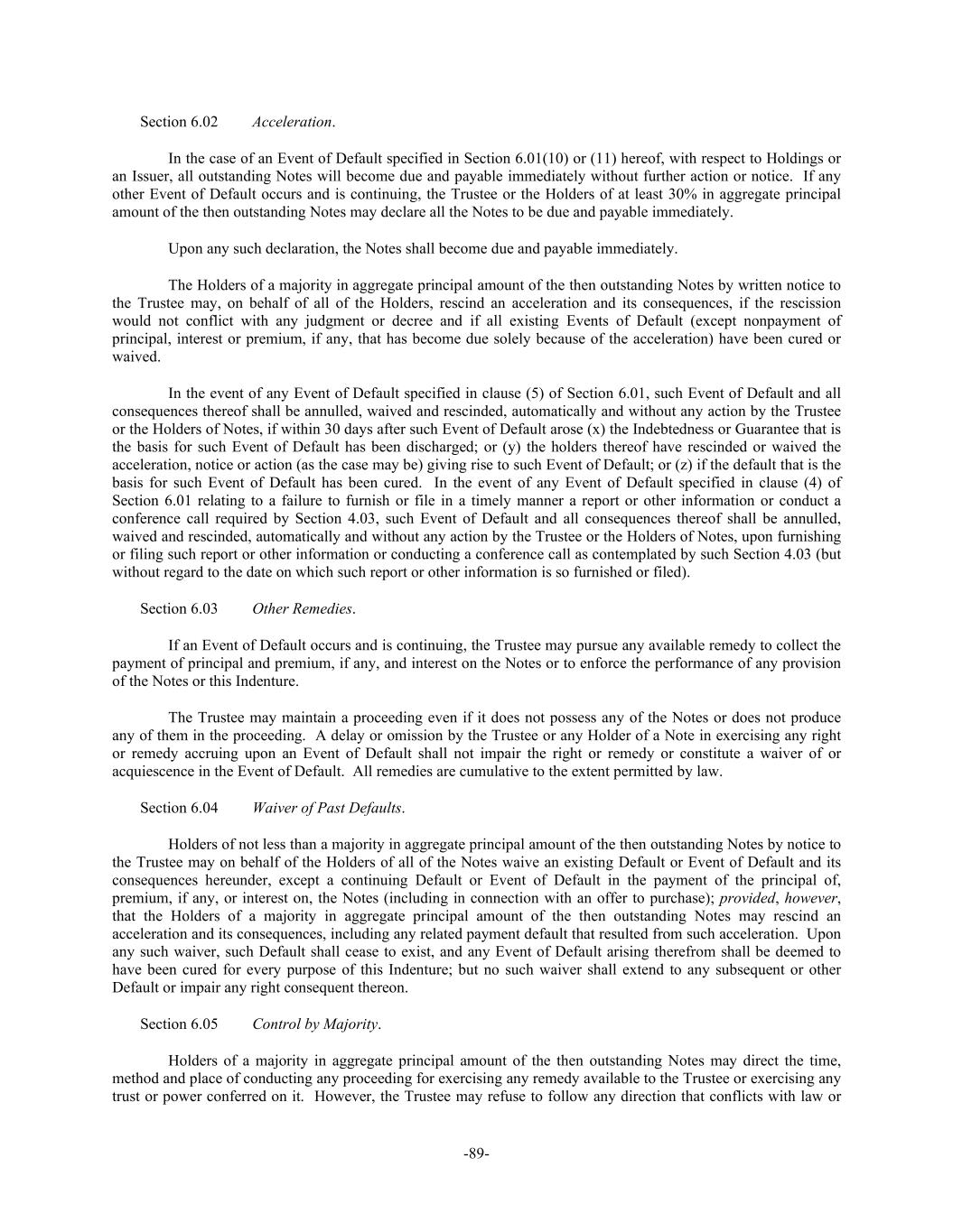 149 Document Obligations of the Borrower accrued hereunder, shall become due and payable immediately, without presentment, demand, protest or other notice of any kind, all of which are hereby waived by the Borrower and (iii) require that the Borrower deposit in the LC Cash Collateral Account an additional amount in cash as reasonably requested by the Issuing Banks (not to exceed 105% of the relevant face amount) of the then outstanding LC Exposure (minus the amount then on deposit in the LC Cash Collateral Account); and (A) in the case of any event with respect to Holdings or the Borrower described in paragraph (h) or (i) of this Section 7.01, the Commitments shall automatically terminate and the principal of the Loans then outstanding, together with accrued interest thereon and all fees and other Loan Document Obligations of the Borrower accrued hereunder, shall automatically become due and payable, without presentment, demand, protest or other notice of any kind, all of which are hereby waived by the Borrower, and the obligation of the Borrower to cash collateralize the outstanding Letters of Credit as aforesaid shall automatically become effective, in each case without further action of the Administrative Agent or any Lender and (B) during the continuance of any Event of Default arising out of a failure to observe or perform the Financial Performance Covenant, (X) upon the request of the Required Revolving Lenders (but not the Required Lenders or any other Lender or group of Lenders), the Administrative Agent shall, by notice to the Borrower, (1) terminate the Revolving Commitments, and thereupon such Revolving Commitments shall terminate immediately, (2) declare the Revolving Loans then outstanding to be due and payable in whole (or in part, in which case any principal not so declared to be due and payable may thereafter be declared to be due and payable), and thereupon the principal of the Revolving Loans so declared to be due and payable, together with accrued interest thereon and all fees and other Loan Document Obligations of the Borrower accrued hereunder, shall become due and payable immediately, without presentment, demand, protest or other notice of any kind, all of which are hereby waived by the Borrower and (3) require that the Borrower deposit in the LC Cash Collateral Account an additional amount in cash as reasonably requested by the Issuing Banks (not to exceed 105% of the relevant face amount) of the then outstanding LC Exposure (minus the amount then on deposit in the LC Cash Collateral Account) and (Y) subject to the Financial Covenant Standstill, the Administrative Agent may, and at the request of the Required Lenders shall, by notice to the Borrower, declare the Loans then outstanding to be due and payable in whole (or in part, in which case any principal not so declared to be due and payable may thereafter be declared to be due and payable), and thereupon the principal of the Loans so declared to be due and payable, together with accrued interest thereon and all fees and other obligations of the Borrower accrued hereunder, shall become due and payable immediately, without presentment, demand, protest or other notice of any kind, all of which are hereby waived by the Borrower. Upon the occurrence and during the continuance of an Event of Default, the Administrative Agent may, and at the request of the Required Lenders shall, exercise any rights and remedies provided to the Administrative Agent under the Loan Documents or at law or equity, including all remedies provided under the UCC. Section 7.02. Right to Cure. (a) Notwithstanding anything to the contrary contained in Section 7.01, in the event that the Borrower and the Restricted Subsidiaries fail to comply with the requirements of the Financial Performance Covenant as of the last day of any Financial Performance Covenant Test Period, then at any time after the beginning of such fiscal quarter until the expiration of the 10th day subsequent to the earlier of (i) the date on which a Compliance Certificate with respect to such fiscal quarter (or the fiscal year ended on the last day of such fiscal quarter) is delivered in accordance with Section 5.01(d) and (ii) the date on which the financial statements with respect to such fiscal quarter (or the fiscal year ended on the last day of such fiscal quarter) are required to be delivered pursuant to Section 5.01(a) or (b) (the “Cure Deadline”), as applicable, Holdings shall have the right to issue Qualified Equity Interests for cash or otherwise receive cash contributions to the capital of Holdings as cash common equity or other Qualified Equity Interests (which Holdings shall contribute through its Subsidiaries of which the Borrower is a Subsidiary to the Borrower as cash common equity) (collectively, the “Cure Right”), and upon the receipt by the Borrower of the Net Proceeds of such issuance (which Net Proceeds may not be included in the calculation of the Cumulative