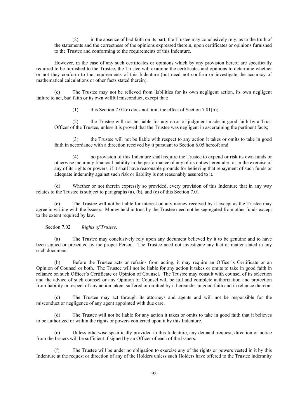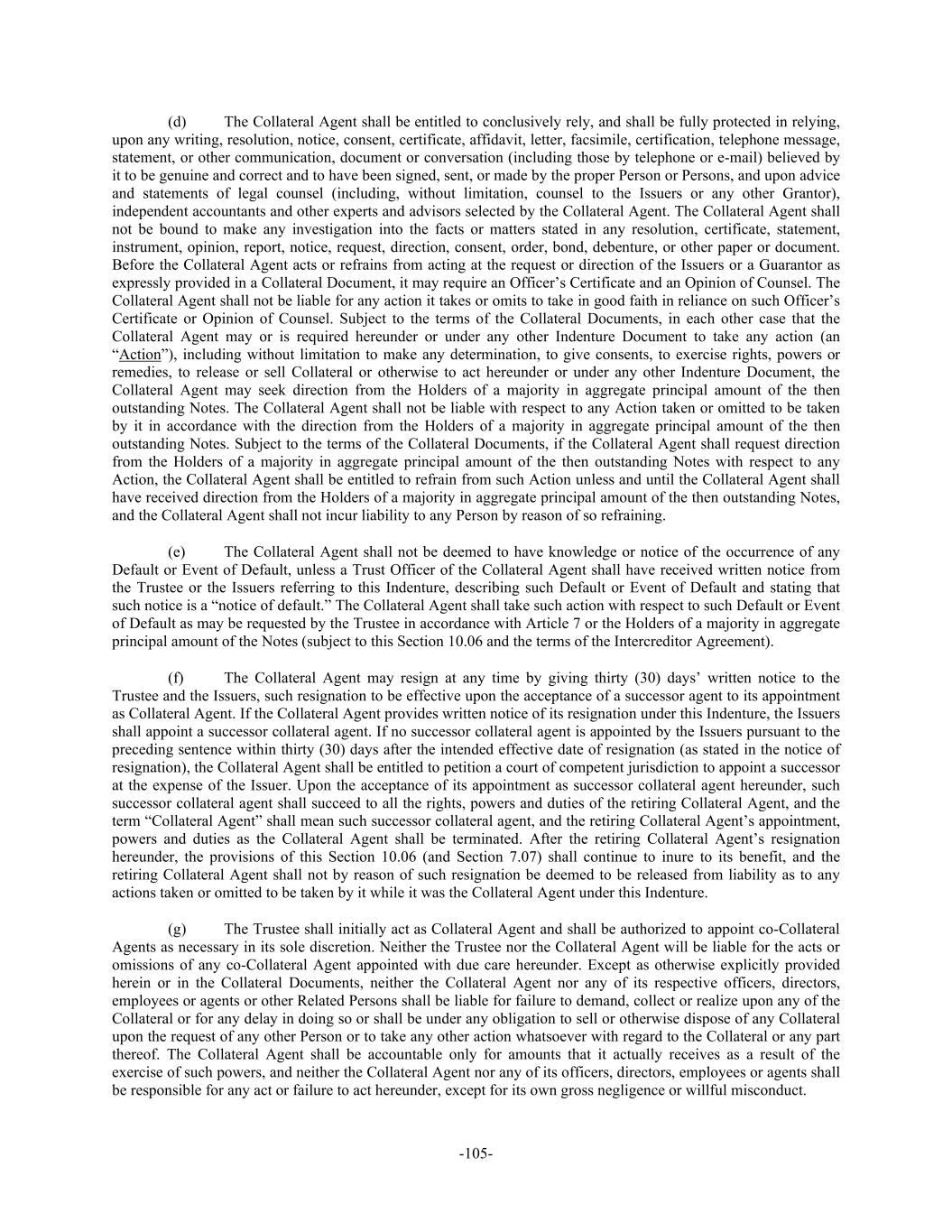 152 ascertain or inquire into (i) any statement, warranty or representation made in or in connection with any Loan Document, (ii) the contents of any certificate, report or other document delivered thereunder or in connection therewith, (iii) the performance or observance of any of the covenants, agreements or other terms or conditions set forth in any Loan Document, (iv) the validity, enforceability, effectiveness or genuineness of any Loan Document or any other agreement, instrument or document, (v) the creation, perfection or priority of any Lien purported to be created by the Security Documents, (vi) the value or the sufficiency of any Collateral, (vii) the financial condition or business affairs of any Loan Party or any other Person liable for the payment of any Secured Obligations or as to the use of the proceeds of the Loans, (viii) the properties, books or records of any Loan Party, (ix) the existence or possible existence of any Event of Default or Default or (x) the satisfaction of any condition set forth in Article 4 or elsewhere in any Loan Document, other than to confirm receipt of items expressly required to be delivered to such Agent. Each Agent shall be entitled to rely upon, and shall not incur any liability for relying upon, any notice, request, certificate, consent, statement, instrument, document or other writing (including any electronic message, Internet or intranet website posting or other distribution) believed by it to be genuine and to have been signed, sent or otherwise authenticated by the proper Person. Each Agent may also rely upon any statement made to it orally or by telephone and believed by it to have been made by the proper Person, and shall not incur any liability for relying thereon. In determining compliance with any condition hereunder to the making of a Loan, or the issuance of a Letter of Credit, that by its terms must be fulfilled to the satisfaction of a Lender or an Issuing Bank, the Administrative Agent may presume that such condition is satisfactory to such Lender or such Issuing Bank unless the Administrative Agent shall have received notice to the contrary from such Lender or such Issuing Bank prior to the making of such Loan or the issuance of such Letter of Credit. Each Agent may consult with legal counsel (who may be counsel for the Borrower), independent accountants and other experts selected by it, and shall not be liable for any action taken or not taken by it in accordance with the advice of any such counsel, accountants or experts. Each Agent may perform any and all its duties and exercise its rights and powers by or through any one or more sub-agents appointed by it. Each Agent and any such sub-agent may perform any and all its duties and exercise its rights and powers by or through their respective Related Parties. The exculpatory provisions of the preceding paragraphs shall apply to any such sub-agent and to the Related Parties of each Agent and any such sub-agent, and shall apply to their respective activities in connection with the syndication of the credit facilities provided for herein as well as activities as Agent. The Administrative Agent may resign at any time by giving 30 days’ prior written notice thereof to the Lenders, the Issuing Banks and the Borrower, whether or not a successor Administrative Agent has been appointed. If the Administrative Agent becomes the subject of a bankruptcy or insolvency proceeding, or has had a receiver, conservator, trustee or custodian appointed for it, or has consented to, approved of or acquiesced in any such proceeding or appointment or has a parent company that has become the subject of a bankruptcy or insolvency proceeding, or has had a receiver, conservator, trustee or custodian appointed for it, or has consented to, approved of or acquiesced in any such proceeding or appointment and the Administrative Agent is not performing its role hereunder as Administrative Agent, then the Administrative Agent may be removed as the Administrative Agent hereunder at the request of the Borrower and the Required Lenders. Upon receipt of any such notice of resignation or upon such removal, the Required Lenders shall have the right to appoint a successor Administrative Agent. If no successor Administrative Agent shall have been so appointed by the Required Lenders, and shall have accepted such appointment, within 30 days after the retiring Administrative Agent’s giving of notice of resignation, then the retiring Administrative Agent may, on behalf of the Lenders and the Issuing Banks, appoint a successor Administrative Agent, which shall be a bank with an office in New York, New York or an Affiliate of any such bank. In either case, such appointment shall be subject to the prior written approval of the Borrower (which approval may not be unreasonably withheld or delayed) (provided that no consent of the Borrower shall be required if an Event of Default under Section 7.01(a), (b), (h) or (i) has occurred and is continuing).