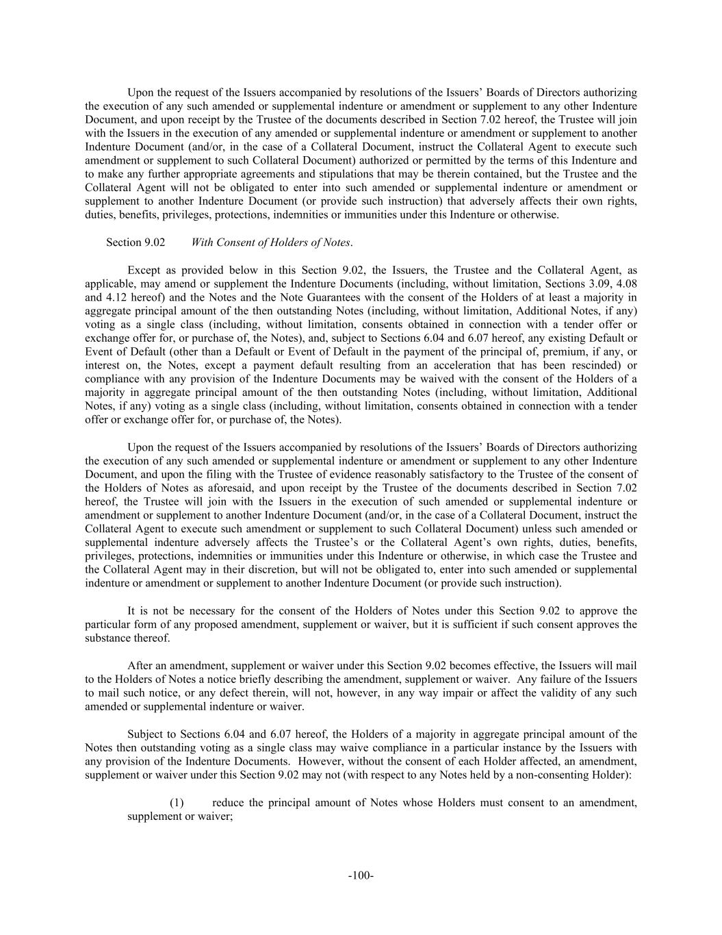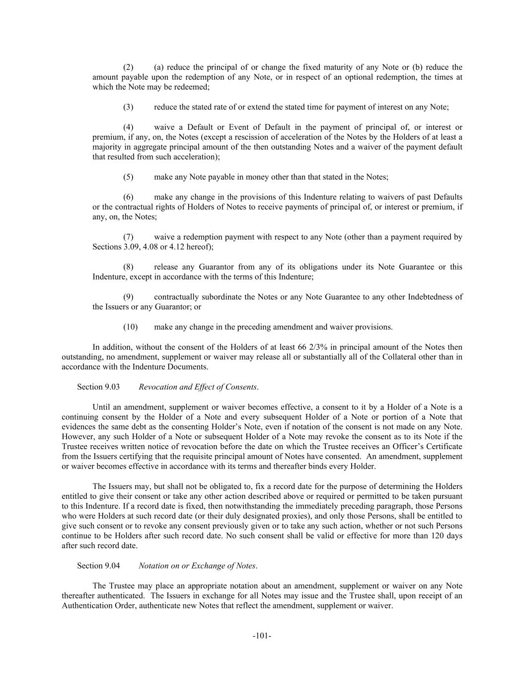 161 of each Lender (other than a Defaulting Lender), (ix) change any provisions of any Loan Document in a manner that by its terms adversely affects the rights in respect of payments due to Lenders holding Loans of any Class differently than those holding Loans of any other Class, without the written consent of Lenders (other than a Defaulting Lender) holding a Majority in Interest of the outstanding Loans and unused Commitments of each affected Class, or (x) change the rights of the Term Lenders to decline mandatory prepayments as provided in Section 2.09 or the rights of any Additional Lenders of any Class to decline mandatory prepayments of Term Loans of such Class as provided in the applicable Refinancing Amendment, without the written consent of a Majority in Interest of the Term Lenders or Additional Lenders of such Class, as applicable or (xi) contractually subordinate the Obligations in right of payment, or contractually subordinate the Liens granted on all or substantially all of the Collateral, in each case to any other Indebtedness for borrowed money, except (A) any “debtor in-possession” facility or use of cash collateral in any insolvency proceeding or (B) any other Indebtedness so long as such Indebtedness is offered ratably (based on the amount of obligations that are adversely affected thereby held by each Lender) to all adversely affected Lenders on the same terms (other than bona fide backstop, agency or arrangement fees and reimbursement of counsel fees and other expenses in connection with the negotiation of the terms of such transaction) as offered to all other providers (or their affiliates) of such other Indebtedness for borrowed money, in each case, without the written consent of each Lender directly and adversely affected thereby; provided, further, that (A) no such agreement shall amend, modify or otherwise affect the rights or duties of the Administrative Agent, the Swingline Lender or any Issuing Bank without the prior written consent of the Administrative Agent, the Swingline Lender or such Issuing Bank, as the case may be, and (B) any provision of this Agreement or any other Loan Document may be amended by an agreement in writing entered into by Holdings, the Borrower and the Administrative Agent to cure any ambiguity, omission, defect or inconsistency so long as, in each case, the Lenders shall have received at least five Business Days’ prior written notice thereof and the Administrative Agent shall not have received, within five Business Days of the date of such notice to the Lenders, a written notice from the Required Lenders stating that the Required Lenders object to such amendment. Notwithstanding the foregoing, (a) this Agreement may be amended (or amended and restated) with the written consent of the Required Lenders, the Administrative Agent, Holdings and the Borrower (i) to add one or more additional credit facilities to this Agreement and to permit the extensions of credit from time to time outstanding thereunder and the accrued interest and fees in respect thereof to share ratably in the benefits of this Agreement and the other Loan Documents and (ii) to include appropriately the Lenders holding such credit facilities in any determination of the Required Lenders on substantially the same basis as the Lenders prior to such inclusion and (b) guarantees, collateral security documents and related documents executed by Foreign Subsidiaries in connection with this Agreement may be in a form reasonably determined by the Administrative Agent and may be, together with this Agreement, amended and waived with the consent of the Administrative Agent at the request of the Borrower without the need to obtain the consent of any other Lender if such amendment or waiver is delivered in order (i) to comply with local law or advice of local counsel, (ii) to cure ambiguities or defects or (iii) to cause such guarantee, collateral security document or other document to be consistent with this Agreement and the other Loan Documents. Notwithstanding anything to the contrary, only the consent of the Required Revolving Lenders shall be necessary to (1) waive or consent to a waiver of an Event of Default with respect to the Financial Performance Covenant or waive or amend the conditions set forth in Section 4.02 (and Section 4.02 may not be waived or amended in a manner that affects the making of any Revolving Borrowing without the consent of the Required Revolving Lenders) or (2) modify or amend the Financial Performance Covenant (and the Financial Performance Covenant may not be modified or amended without the consent of the Required Revolving Lenders) or Section 7.02 (including, in each case, the related definitions, solely to the extent such definitions are used in such Sections (but not otherwise)) or this sentence. (c) In connection with any proposed amendment, modification, waiver or termination (a “Proposed Change”) requiring the consent of all Lenders or all directly and adversely affected Lenders, if the consent of the Required Lenders (and, to the extent any Proposed Change requires the consent of