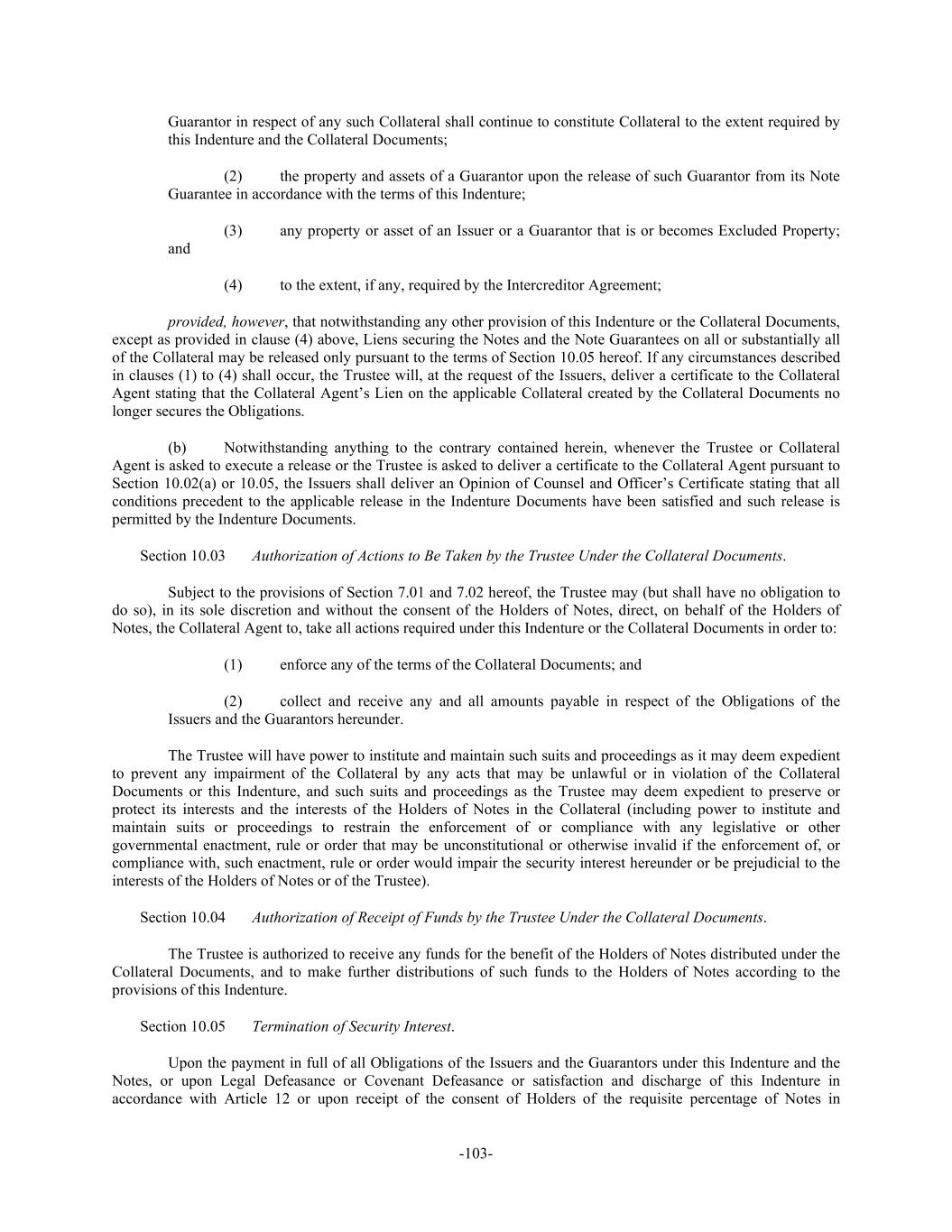 30 default under, or creates a right of termination in favor of any party (other than Holdings or any Restricted Subsidiary) to, any agreement pursuant to which such Lien has been created (but only to the extent any of the foregoing is not rendered ineffective by, or is otherwise unenforceable under, the Uniform Commercial Code or any Requirements of Law), (g) any intent-to-use trademark applications filed in the United States Patent and Trademark Office prior to the filing and acceptance of a “Statement of Use” or “Amendment to Allege Use” with respect thereto, to the extent, if any, that, and solely during the period, if any, in which the grant or a security interest therein would impair the validity or enforceability of such intent-to-use trademark application under applicable federal law, (h) any asset with respect to which Holdings with the written consent of the Administrative Agent (not to be unreasonably withheld or delayed) shall have provided to the Administrative Agent a certificate of a Financial Officer to the effect that, based on the advice of outside counsel or tax advisors of national recognition, the grant of a Lien thereon to secure the Secured Obligations would result in adverse tax consequences (including as a result of the operation of Section 956 of the Code or any similar law or regulation in any applicable jurisdiction) to Holdings and its Restricted Subsidiaries (other than on account of any Taxes payable in connection with filings, recordings, registrations, stampings and any similar acts in connection with the creation or perfection of Liens) that shall have been reasonably determined by Holdings to be material to Holdings and its Restricted Subsidiaries, (i) any asset if, to the extent and for so long as the grant of a Lien thereon to secure the Secured Obligations is prohibited by any Requirements of Law (other than to the extent that any such prohibition would be rendered ineffective pursuant to the Uniform Commercial Code or any other applicable Requirements of Law), (j) any cash and cash equivalents only to the extent, and for so long as, such cash and cash equivalents are subject to a Lien permitted by Section 6.02(xv)(y) and (k) Securitization Assets sold to any Special Purpose Securitization Subsidiary, or otherwise pledged, factored, transferred or sold, in connection with any Permitted Securitization Financing, and any other related assets subject to Liens securing Permitted Securitization Financings. “Excluded Domestic Subsidiary” means: (i) any direct or indirect Domestic Subsidiary of a direct or indirect Foreign Subsidiary of the Borrower that is a “controlled foreign corporation” within the meaning of Section 957 of the Code (a “CFC”) and (ii) any direct or indirect U.S. subsidiary of the Borrower that has no material assets other than equity of one or more direct or indirect non-U.S. subsidiaries that are CFCs (a “FSHCO”). “Excluded Securities” shall mean any of the following: (a) any Equity Interests or Indebtedness with respect to which the Administrative Agent and the Borrower reasonably agree that the cost or other consequences of pledging such Equity Interests or Indebtedness to secure the Secured Obligations would be excessive in relation to the value to be afforded thereby; (b) in the case of any pledge of voting Equity Interests of any Foreign Subsidiary (in each case, that is owned directly by the Borrower or a Subsidiary Loan Party) to secure the Secured Obligations, any voting Equity Interest of such Foreign Subsidiary in excess of 65% of such outstanding voting Equity Interests; (c) in the case of any pledge of voting Equity Interests of any FSHCO (in each case, that is owned directly by the Borrower or a Subsidiary Loan Party) to secure the Secured Obligations, any voting Equity Interest of such FSHCO in excess of 65% of such outstanding voting Equity Interests; (d) any Equity Interests or Indebtedness to the extent the pledge thereof would be prohibited by any Requirement of Law after giving effect to the anti-assignment provisions of the Uniform Commercial Code of any applicable jurisdiction; (e) any Equity Interests of any Person that is not a Wholly Owned Subsidiary of the Borrower to the extent (A) that a pledge thereof to secure the Secured Obligations is prohibited by (i) any applicable organizational documents, joint venture agreement or shareholder agreement or (ii) any other contractual obligation with an unaffiliated third party not in violation of clause (a) of Section 6.10 binding on such Equity Interests to the extent in existence on the Closing Date or on the date of acquisition thereof and not entered into in contemplation thereof (other than, in this subclause (A)(ii), customary non-assignment provisions which are ineffective under the Uniform Commercial Code or other applicable Requirements of Law), (B) any organizational documents, joint venture agreement or shareholder agreement (or other contractual obligation referred to in subclause