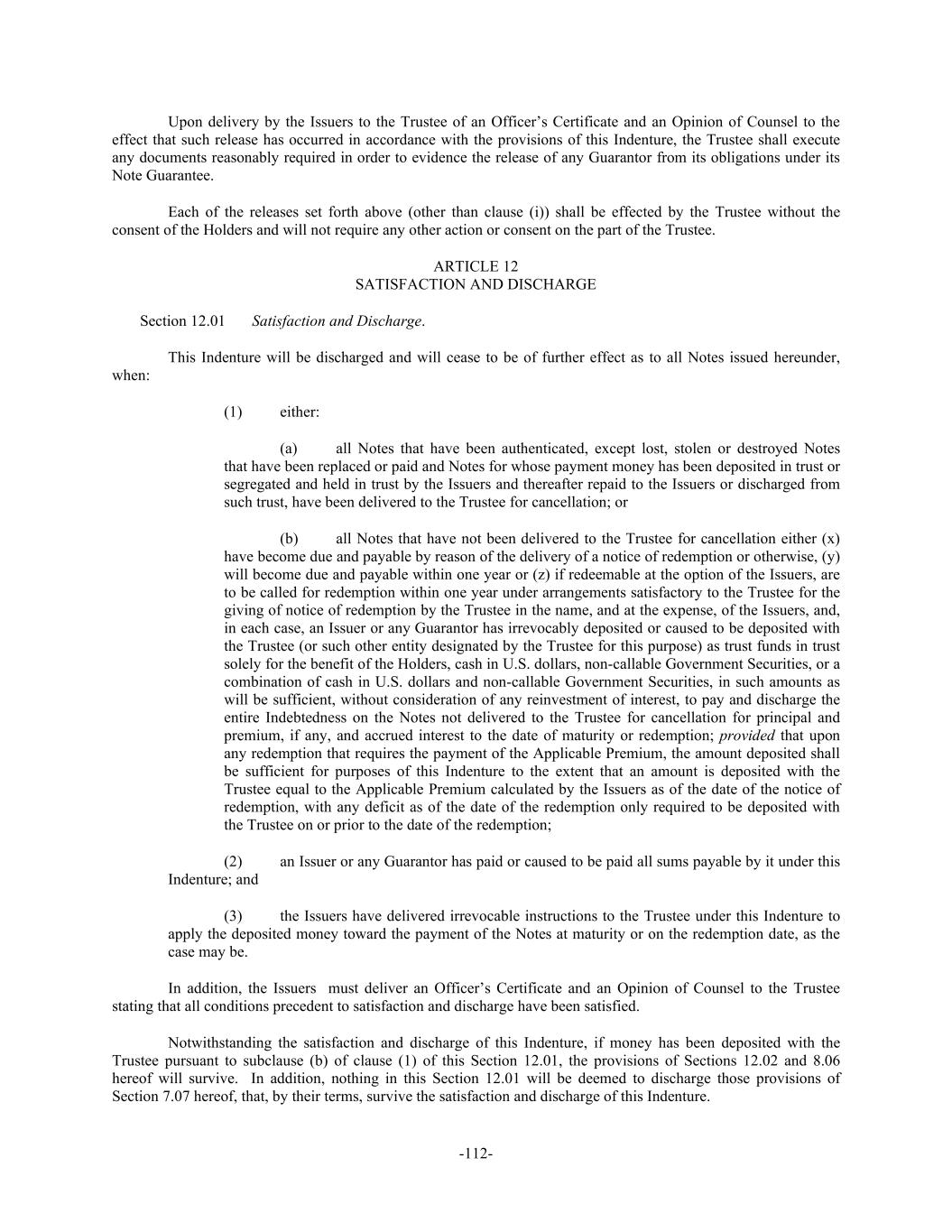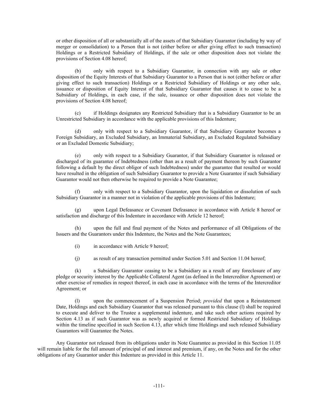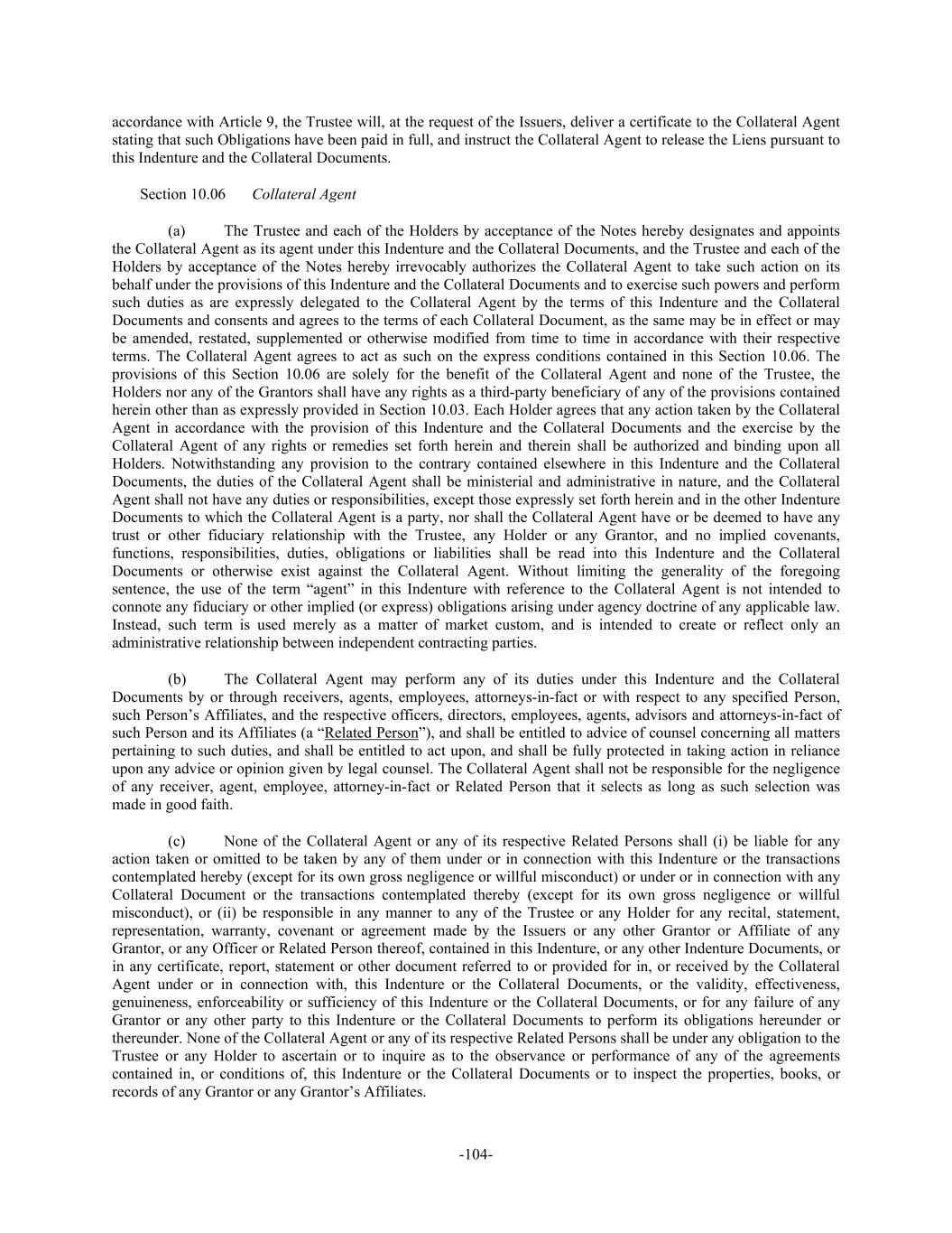 176 to any Loan Party all documents and take such other actions that such Loan Party shall reasonably request, to evidence such termination, release or confirmation so long as the Borrower or applicable Loan Party shall have provided the Administrative Agent such certifications or documents as the Administrative Agent shall reasonably request in order to demonstrate compliance with this Agreement or that such assets constitute Excluded Assets. (b) Holdings may notify the Administrative Agent that it wishes to obtain the release of the Guarantee of, and grants of Liens by, any Subsidiary Loan Party under the Security Documents (any Subsidiary in respect of which such a release is given, a “Released Subsidiary”), and the Administrative Agent will, and is hereby authorized to, promptly release such Guarantee and grants of Liens of such Subsidiary Loan Party pursuant to a written notification thereof given to Holdings; provided that (i) no Default has occurred or is continuing on the date of such request or would result immediately after giving effect to such release, and the Administrative Agent has been furnished with a certificate of a Financial Officer confirming satisfaction of such condition, (ii) after such release is effected, such Restricted Subsidiary shall thereafter be treated as a Restricted Subsidiary that is not a Loan Party for purposes of this Agreement, (iii) the fair market value of such Released Subsidiary immediately after the release of such Guarantee, as reasonably determined by a Financial Officer, is deemed to be an Investment by a Loan Party on the date of such release in a Subsidiary that is not a Loan Party for purposes of Section 6.04(c) or Section 6.04(m), as designated by Holdings to the Administrative Agent prior to such release, (iv) such Investment is permitted under Section 6.04(c) or Section 6.04(m), (v) after giving effect to such transaction on a Pro Forma Basis, not more than 10% of Consolidated EBITDA for the most recently ended Test Period shall be attributable to such Restricted Subsidiary together with all other Restricted Subsidiaries (or any successors thereto) that were released from being Loan Parties pursuant to the provisions of this Section 9.14 and (vi) the Borrower shall have provided the Administrative Agent such certifications or documents as the Administrative Agent shall reasonably request in order to demonstrate compliance with this Agreement. (c) The Administrative Agent will, at the Borrower’s expense, execute and deliver to the applicable Loan Party such documents as such Loan Party may reasonably request to subordinate its Lien on any property granted to or held by the Administrative Agent under any Loan Document to the holder of any Lien on such property that is of the type permitted by Section 6.02(iv). (d) Each of the Lenders and the Issuing Banks irrevocably authorizes the Administrative Agent to provide any release or evidence of release, termination or subordination contemplated by this Section 9.14. Upon request by the Administrative Agent at any time, the Required Lenders will confirm in writing the Administrative Agent’s authority to release or subordinate its interest in particular types or items of property, or to release any Loan Party from its obligations under any Loan Document, in each case in accordance with the terms of the Loan Document and this Section 9.14. Section 9.15. No Advisory or Fiduciary Responsibility. In connection with all aspects of each transaction contemplated hereby (including in connection with any amendment, waiver or other modification hereof or of any other Loan Document), each of the Borrower and Holdings acknowledges and agrees that (i) (A) the arranging and other services regarding this Agreement provided by the Administrative Agent, the Lenders and the Lead Arrangers are arm’s-length commercial transactions between the Borrower, Holdings and their respective Affiliates, on the one hand, and the Administrative Agent, the Lenders and the Lead Arrangers, on the other hand, (B) each of the Borrower and Holdings has consulted its own legal, accounting, regulatory and tax advisors to the extent it has deemed appropriate, and (C) each of the Borrower and Holdings is capable of evaluating, and understands and accepts, the terms, risks and conditions of the transactions contemplated hereby and by the other Loan Documents; (ii) (A) each of the Administrative Agent, the Lenders and the Lead Arrangers is and has been acting solely as a principal and, except as expressly agreed in writing by the relevant parties, has not been, is not and will not