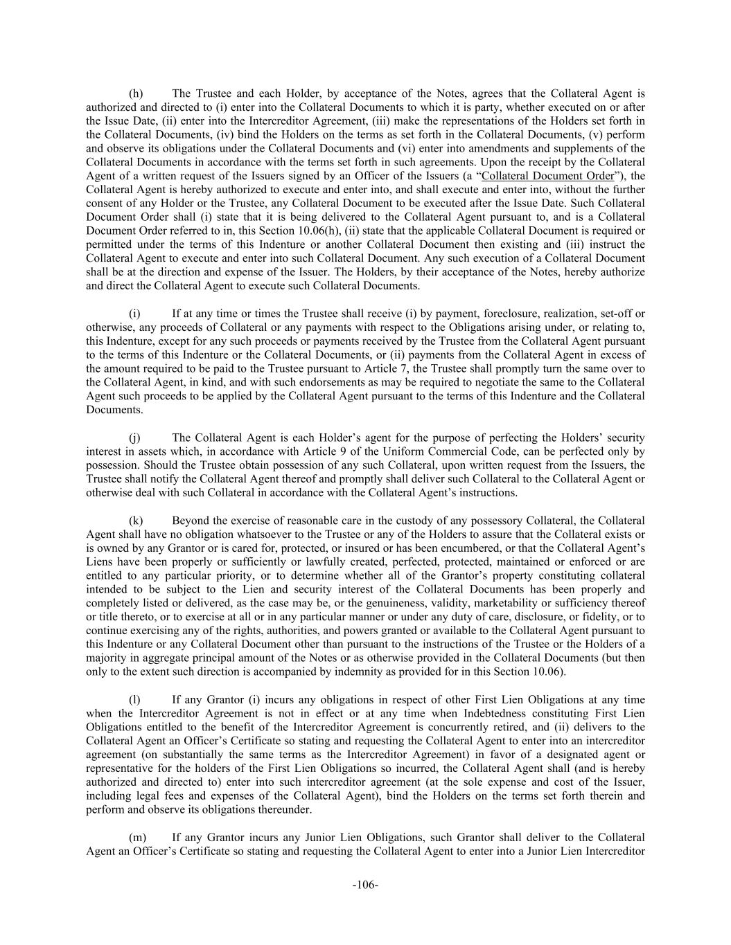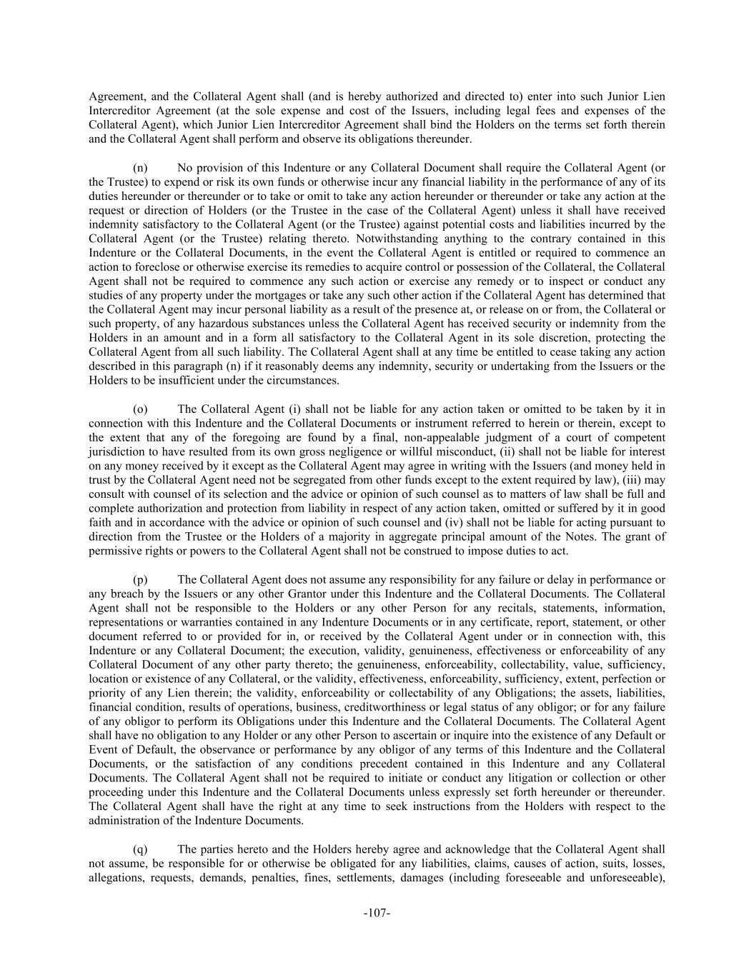 151 thereto. The Administrative Agent shall also act as the “collateral agent” under the Loan Documents (and for purposes of this Article 8, the Administrative Agent acting in its capacity as such and acting in its capacity as collateral agent shall be referred to collectively as the “Agent” or the “Agents”), and each of the Lenders hereby irrevocably appoints and authorizes the Administrative Agent to act as the agent of such Lender for purposes of acquiring, holding and enforcing any and all Liens on Collateral granted by any of the Loan Parties to secure any of the Secured Obligations, together with such powers and discretion as are reasonably incidental thereto. In this connection, the Administrative Agent, as “collateral agent” and any co-agents, sub-agents and attorneys-in-fact appointed by the Administrative Agent hereunder for purposes of holding or enforcing any Lien on the Collateral (or any portion thereof) granted under the Security Documents, or for exercising any rights and remedies thereunder at the direction of the Administrative Agent, shall be entitled to the benefits of all provisions of this Article 8 and Article 9 (including Section 9.03 as though such co-agents, sub-agents and attorneys-in-fact were the “collateral agent” under the Loan Documents) as if set forth in full herein with respect thereto. Without limiting the generality of the foregoing, the Agents are hereby expressly authorized to (i) execute any and all documents (including releases) with respect to the Collateral and the rights of the Secured Parties with respect thereto, as contemplated by and in accordance with the provisions of this Agreement and the Security Documents and (ii) negotiate, enforce or settle any claim, action or proceeding affecting the Lenders in their capacity as such, at the direction of the Required Lenders, which negotiation, enforcement or settlement will be binding upon each Lender. In the event that any obligations (other than the Secured Obligations) are permitted to be incurred hereunder and secured by Liens permitted to be incurred hereunder on all or a portion of the Collateral, each Lender authorizes each Agent to enter into intercreditor agreements, subordination agreements and amendments to the Security Documents to reflect such arrangements on terms acceptable to such Agent. The institution serving as the Administrative Agent hereunder shall have the same rights and powers in its capacity as a Lender as any other Lender and may exercise the same as though it were not an Agent, and the term “Lender” or “Lenders” shall, unless otherwise expressly indicated or unless the context otherwise requires, include the Person serving as the Agent hereunder in its individual capacity. Such bank and its Affiliates may accept deposits from, lend money to and generally engage in any kind of business with Holdings, the Borrower or any Subsidiary or other Affiliate thereof as if it were not an Agent hereunder. Neither Agent shall have any duties or obligations except those expressly set forth in the Loan Documents. Without limiting the generality of the foregoing, (a) neither Agent shall be subject to any fiduciary or other implied duties, regardless of whether a Default has occurred and is continuing, (b) neither Agent shall have any duty to take any discretionary action or exercise any discretionary powers, except discretionary rights and powers expressly contemplated hereby that such Agent is instructed in writing to exercise by the Required Lenders (or such other number or percentage of the Lenders as shall be necessary under the circumstances as provided in Section 9.02); provided that neither Agent shall be required to take any action that, in its opinion or the opinion of its counsel, may expose such Agent to liability or that is contrary to any Loan Document or applicable law, and (c) except as expressly set forth in the Loan Documents, neither Agent shall have any duty to disclose, nor shall it be liable for the failure to disclose, any information relating to Holdings, the Borrower or any of the Subsidiaries that is communicated to or obtained by the bank serving as Administrative Agent or any of its Affiliates in any capacity. Neither Agent shall be liable for any action taken or not taken by it with the consent or at the request of the Required Lenders (or such other number or percentage of the Lenders as shall be necessary under the circumstances as provided in Section 9.02) or in the absence of its own gross negligence or willful misconduct as determined by a court of competent jurisdiction in a final and non-appealable judgment. Neither Agent shall be deemed to have knowledge of any Default unless and until written notice thereof is given to such Agent by Holdings, the Borrower or a Lender and neither Agent shall be responsible for or have any duty to