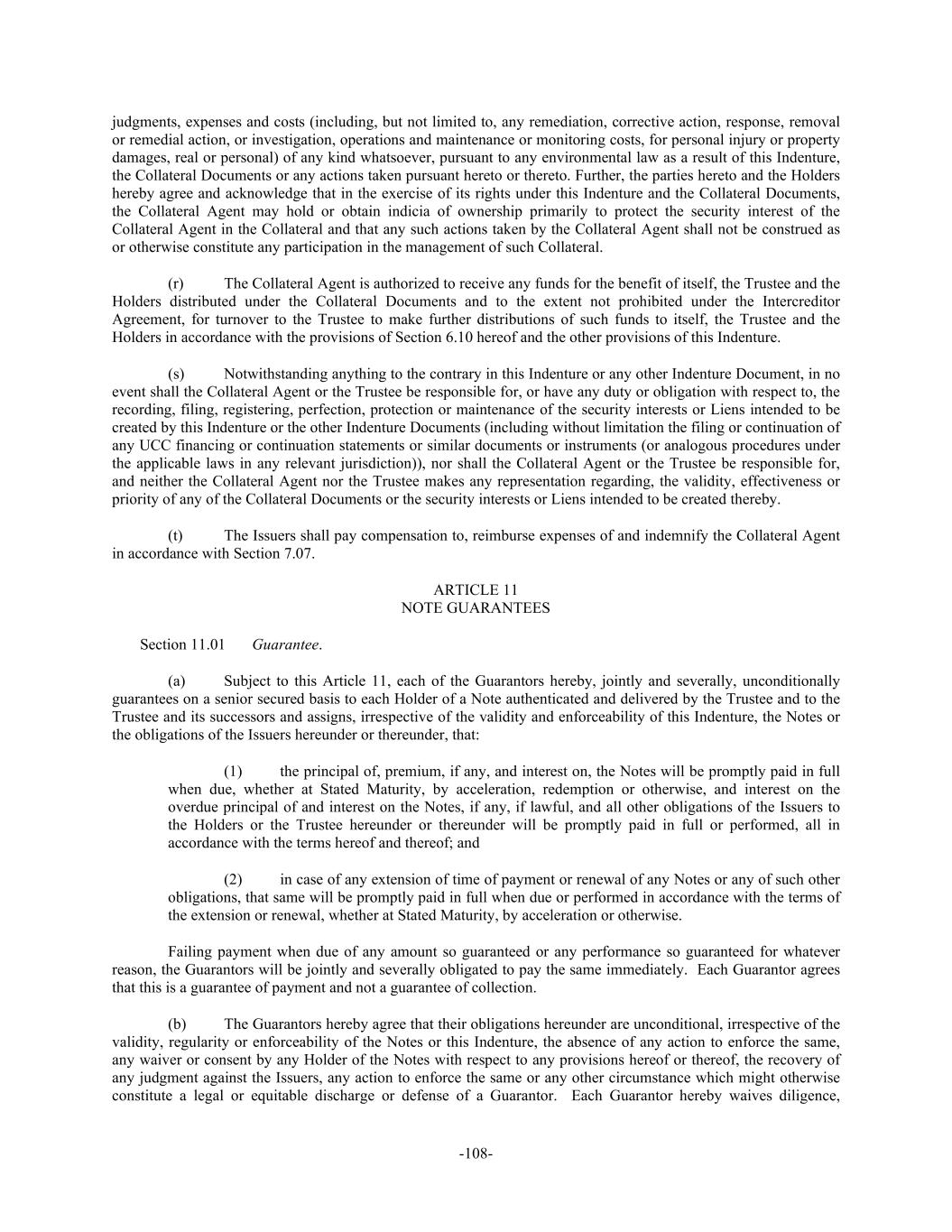 155 by the Administrative Agent from the Borrower or any other Loan Party for the purpose of making such Payment. Each party’s obligations under this Section 8.01 shall survive the resignation or replacement of the Administrative Agent or any transfer of rights or obligations by, or the replacement of, a Lender, the termination of the Commitments or the repayment, satisfaction or discharge of all Secured Obligations under any Loan Document. In case of the pendency of any proceeding under any Debtor Relief Law or any other judicial proceeding relative to any Loan Party, the Administrative Agent (irrespective of whether the principal of any Loan or outstanding Letter of Credit shall then be due and payable as herein expressed or by declaration or otherwise and irrespective of whether the Administrative Agent shall have made any demand on the Borrower) shall be entitled and empowered, by intervention in such proceeding or otherwise: (a) to file and prove a claim for the whole amount of the principal and interest owing and unpaid in respect of the Loans, outstanding Letters of Credit and all other Secured Obligations that are owing and unpaid and to file such other documents as may be necessary or advisable in order to have the claims of the Lenders and the Agents (including any claim for the reasonable compensation, expenses, disbursements and advances of the Lenders and the Agents and their respective agents and counsel and all other amounts due the Lenders and the Agents under Sections 2.12 and 9.03) allowed in such judicial proceeding; and (b) to collect and receive any monies or other property payable or deliverable on any such claims and to distribute the same; and any custodian, receiver, assignee, trustee, liquidator, sequestrator or other similar official in any such judicial proceeding is hereby authorized by each Lender to make such payments to the Administrative Agent and, if the Administrative Agent shall consent to the making of such payments directly to the Lenders to pay to each Agent any amount due for the reasonable compensation, expenses, disbursements and advances of such Agent and its agents and counsel, and any other amounts due such Agent under Sections 2.12 and 9.03. Nothing contained herein shall be deemed to authorize the Administrative Agent to authorize or consent to or accept or adopt on behalf of any Lender any plan of reorganization, arrangement, adjustment or composition affecting the Secured Obligations or the rights of any Lender to authorize the Administrative Agent to vote in respect of the claim of any Lender in any such proceeding. To the extent required by any applicable law, the Administrative Agent may deduct or withhold from any payment to any Lender an amount equivalent to any applicable withholding Tax. If the Internal Revenue Service or any other authority of the United States or other jurisdiction asserts a claim that the Administrative Agent did not properly withhold Tax from amounts paid to or for the account of any Lender for any reason (including, without limitation, because the appropriate form was not delivered or not property executed, or because such Lender failed to notify the Administrative Agent of a change in circumstance that rendered the exemption from, or reduction of withholding Tax ineffective, or for any other reason), such Lender shall indemnify and hold harmless the Administrative Agent (to the extent that the Administrative Agent has not already been reimbursed by the Borrower pursuant to Section 2.15 and without limiting any obligation of the Borrower to do so pursuant to such Section) fully for all amounts paid, directly or indirectly, by the Administrative Agent as Taxes or otherwise, together with all expenses incurred, including legal expenses and any other out-of-pocket expenses, whether or not such Tax was correctly or legally imposed or asserted by the relevant Governmental Authority. A certificate as to the amount of such payment or liability delivered to any Lender by the Administrative Agent shall be