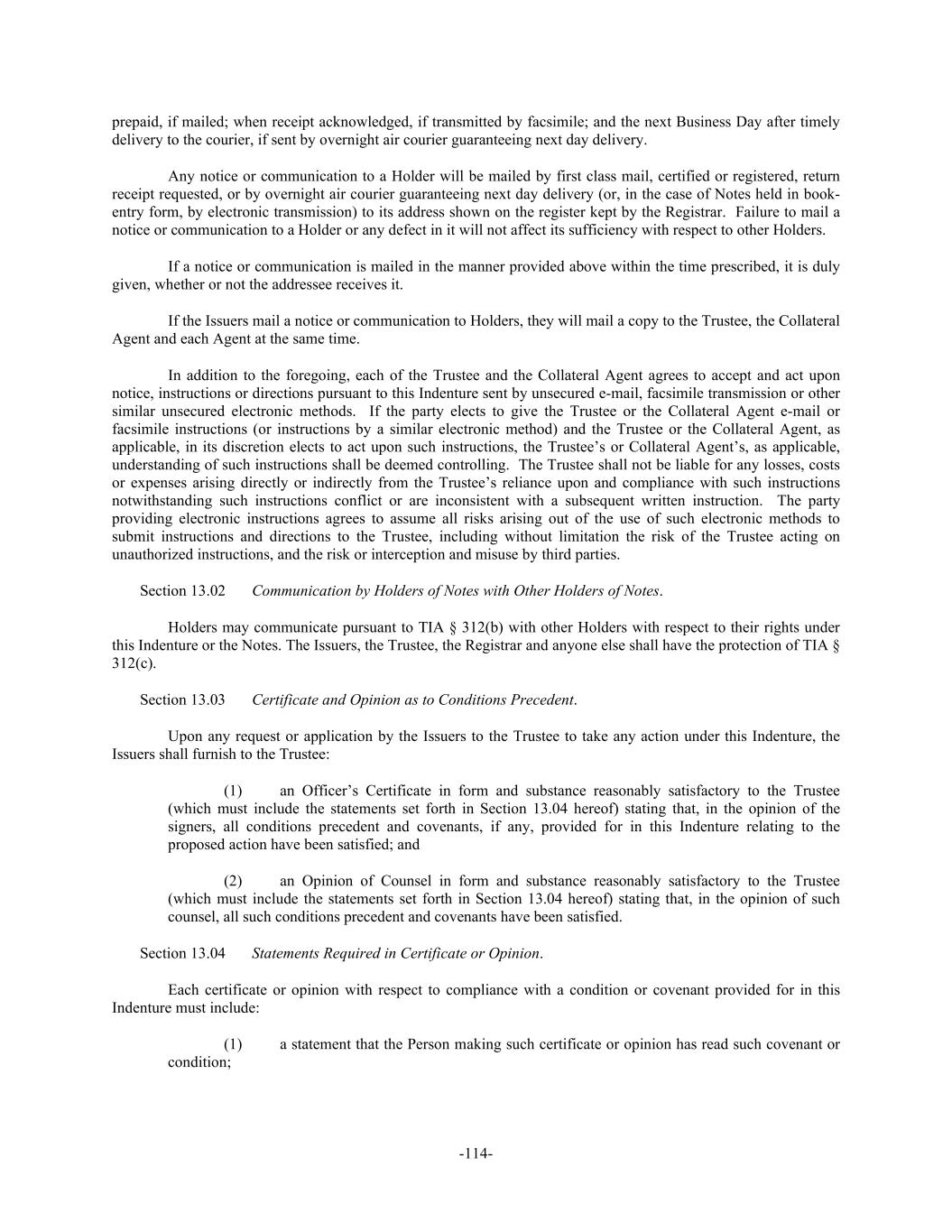 158 pursuant to procedures approved by it; provided that approval of such procedures may be limited to particular notices or communications. Unless the Administrative Agent otherwise prescribes (with the Borrower’s consent), (i) notices and other communications sent to an e-mail address shall be deemed received upon the sender’s receipt of an acknowledgement from the intended recipient (such as by the “return receipt requested” function, as available, return e-mail or other written acknowledgement), provided that if such notice or other communication is not sent during the normal business hours of the recipient, such notice or communication shall be deemed to have been sent at the opening of business on the next Business Day for the recipient, and (ii) notices or communications posted to an Internet or intranet website shall be deemed received upon the deemed receipt by the intended recipient at its e-mail address as described in the foregoing clause (i) of notification that such notice or communication is available and identifying the website address therefor. (c) The Platform. (i) The Borrower agrees that the Administrative Agent may, but shall not be obligated to, make any Communications available to the Lenders and the Issuing Banks by posting the Communications on IntraLinks™, DebtDomain, SyndTrak, ClearPar or any other electronic platform chosen by the Administrative Agent to be its electronic transmission system (the “Approved Electronic Platform”). (ii) Although the Approved Electronic Platform and its primary web portal are secured with generally-applicable security procedures and policies implemented or modified by the Administrative Agent from time to time (including, as of the Closing Date, a user ID/password authorization system) and the Approved Electronic Platform is secured through a per-deal authorization method whereby each user may access the Approved Electronic Platform only on a deal- by-deal basis, each of the Lenders, each of the Issuing Banks and the Borrower acknowledges and agrees that the distribution of material through an electronic medium is not necessarily secure, that the Administrative Agent is not responsible for approving or vetting the representatives or contacts of any Lender that are added to the Approved Electronic Platform, and that there may be confidentiality and other risks associated with such distribution. Each of the Lenders, each of the Issuing Banks and the Borrower hereby approves distribution of the Communications through the Approved Electronic Platform and understands and assumes the risks of such distribution. (iii) THE APPROVED ELECTRONIC PLATFORM AND THE COMMUNICATIONS ARE PROVIDED “AS IS” AND “AS AVAILABLE”. THE APPLICABLE PARTIES (AS DEFINED BELOW) DO NOT WARRANT THE ACCURACY OR COMPLETENESS OF THE COMMUNICATIONS, OR THE ADEQUACY OF THE APPROVED ELECTRONIC PLATFORM AND EXPRESSLY DISCLAIM LIABILITY FOR ERRORS OR OMISSIONS IN THE APPROVED ELECTRONIC PLATFORM AND THE COMMUNICATIONS. NO WARRANTY OF ANY KIND, EXPRESS, IMPLIED OR STATUTORY, INCLUDING ANY WARRANTY OF MERCHANTABILITY, FITNESS FOR A PARTICULAR PURPOSE, NON- INFRINGEMENT OF THIRD PARTY RIGHTS OR FREEDOM FROM VIRUSES OR OTHER CODE DEFECTS, IS MADE BY THE APPLICABLE PARTIES IN CONNECTION WITH THE COMMUNICATIONS OR THE APPROVED ELECTRONIC PLATFORM. IN NO EVENT SHALL THE ADMINISTRATIVE AGENT, ANY ARRANGER OR ANY OF THEIR RESPECTIVE RELATED PARTIES (COLLECTIVELY, “APPLICABLE PARTIES”) HAVE ANY LIABILITY TO ANY LOAN PARTY, ANY LENDER, ANY ISSUING BANK OR ANY OTHER PERSON OR ENTITY FOR DAMAGES OF ANY KIND, INCLUDING DIRECT OR INDIRECT, SPECIAL, INCIDENTAL OR CONSEQUENTIAL DAMAGES, LOSSES OR EXPENSES (WHETHER IN TORT, CONTRACT OR OTHERWISE) ARISING OUT OF ANY LOAN PARTY’S OR THE ADMINISTRATIVE AGENT’S TRANSMISSION OF COMMUNICATIONS THROUGH THE INTERNET OR THE APPROVED ELECTRONIC PLATFORM.
