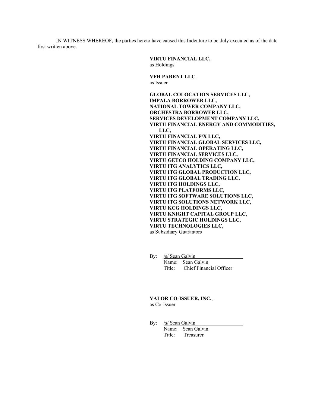[Signature Page to Amendment No. 1] GLOBAL COLOCATION SERVICES LLC IMPALA BORROWER LLC NATIONAL TOWER COMPANY LLC ORCHESTRA BORROWER LLC SERVICES DEVELOPMENT COMPANY LLC VIRTU FINANCIAL ENERGY AND COMMODITIES, LLC VIRTU FINANCIAL F/X LLC VIRTU FINANCIAL GLOBAL SERVICES LLC VIRTU FINANCIAL OPERATING LLC VIRTU FINANCIAL SERVICES LLC VIRTU GETCO HOLDING COMPANY LLC VIRTU ITG ANALYTICS LLC VIRTU ITG GLOBAL PRODUCTION LLC VIRTU ITG GLOBAL TRADING LLC VIRTU ITG HOLDINGS LLC VIRTU ITG PLATFORMS LLC VIRTU ITG SOFTWARE SOLUTIONS LLC VIRTU ITG SOLUTIONS NETWORK LLC VIRTU KCG HOLDINGS LLC VIRTU KNIGHT CAPITAL GROUP LLC VIRTU STRATEGIC HOLDINGS LLC VIRTU TECHNOLOGIES LLC, as a Subsidiary Loan Party By: /s/ Sean Galvin Name: Sean Galvin Title: Executive Vice President, Chief Financial Officer and Treasurer VALOR CO-ISSUER, INC., as a Subsidiary Loan Party By: /s/ Sean Galvin Name: Sean Galvin Title: Treasurer