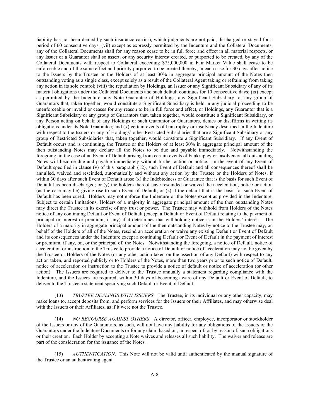 148 and operations of Holdings, the Borrower and its Restricted Subsidiaries, taken as a whole, to enforce any such judgment; (k) (i) an ERISA Event occurs that has resulted or could reasonably be expected to result in liability of any Loan Party in an aggregate amount that could reasonably be expected to result in a Material Adverse Effect, or (ii) any Loan Party or any ERISA Affiliate fails to pay when due, after the expiration of any applicable grace period, any installment payment with respect to its withdrawal liability under Section 4201 of ERISA under a Multiemployer Plan that has resulted or could reasonably be expected to result in liability of any Loan Party in an aggregate amount that could reasonably be expected to result in a Material Adverse Effect; (l) any Lien purported to be created under any Security Document shall cease to be, or shall be asserted by any Loan Party not to be, a valid and perfected Lien on any material portion of the Collateral, with the priority required by the applicable Security Document, except (i) as a result of the sale or other disposition of the applicable Collateral in a transaction permitted under the Loan Documents, (ii) as a result of (A) the Administrative Agent no longer having possession of any stock certificates, promissory notes or other instruments delivered to it under the Security Documents or (B) as a result of a Uniform Commercial Code filing having lapsed because a Uniform Commercial Code continuation statement was not filed in a timely manner, (iii) as to Collateral consisting of real property to the extent that such losses are covered by a lender’s title insurance policy and such insurer has not denied coverage or (iv) as the direct exclusive result of acts or omissions of the Administrative Agent or any Lender within its sole control; (m) any material provision of any Loan Document or any Guarantee of the Loan Document Obligations shall for any reason be asserted by any Loan Party not to be a legal, valid and binding obligation of any Loan Party party thereto or subject thereto other than as expressly permitted hereunder or thereunder; (n) any Guarantee of the Loan Document Obligations by any Loan Party pursuant to the Guarantee Agreement shall cease to be in full force and effect (in each case, other than in accordance with the terms of the Loan Documents); (o) a Change in Control shall occur; (p) one or more Regulated Subsidiaries shall become subject to regulatory restrictions on its business as a result of falling below capital early warning levels and such restrictions are material and adverse to the business of Holdings, the Borrower and the Restricted Subsidiaries, taken as a whole; or (q) any disqualification of the Borrower or Holdings from owning any Regulated Subsidiary which disqualification remains in effect and unwaived for a period of 30 days from receipt of notification thereof by the Borrower or Holdings; provided, however, that if the Borrower or Holdings becomes the subject of a waiver application within such 30 day period, then such disqualification shall not constitute an Event Of Default for so long as such waiver application has not been denied; then, and in every such event (other than (x) an event with respect to Holdings or the Borrower described in paragraph (h) or (i) of this Section 7.01 or (y) any Event of Default arising out of a failure to observe or perform the Financial Performance Covenant), and at any time thereafter during the continuance of such event, the Administrative Agent may, and at the request of the Required Lenders shall, by notice to the Borrower, take any of the following actions, at the same or different times: (i) terminate the Revolving Commitments, and thereupon such Commitments shall terminate immediately, (ii) declare the Loans then outstanding to be due and payable in whole (or in part, in which case any principal not so declared to be due and payable may thereafter be declared to be due and payable), and thereupon the principal of the Loans so declared to be due and payable, together with accrued interest thereon and all fees and other Loan