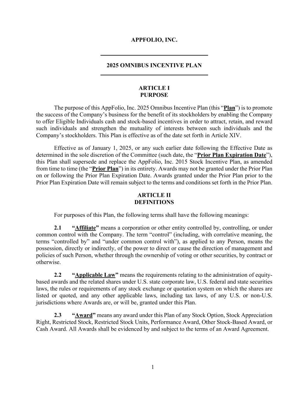 1 APPFOLIO, INC. 2025 OMNIBUS INCENTIVE PLAN ARTICLE I PURPOSE The purpose of this AppFolio, Inc. 2025 Omnibus Incentive Plan (this “Plan”) is to promote the success of the Company’s business for the benefit of its stockholders by enabling the Company to offer Eligible Individuals cash and stock-based incentives in order to attract, retain, and reward such individuals and strengthen the mutuality of interests between such individuals and the Company’s stockholders. This Plan is effective as of the date set forth in Article XIV. Effective as of January 1, 2025, or any such earlier date following the Effective Date as determined in the sole discretion of the Committee (such date, the “Prior Plan Expiration Date”), this Plan shall supersede and replace the AppFolio, Inc. 2015 Stock Incentive Plan, as amended from time to time (the “Prior Plan”) in its entirety. Awards may not be granted under the Prior Plan on or following the Prior Plan Expiration Date. Awards granted under the Prior Plan prior to the Prior Plan Expiration Date will remain subject to the terms and conditions set forth in the Prior Plan. ARTICLE II DEFINITIONS For purposes of this Plan, the following terms shall have the following meanings: 2.1 “Affiliate” means a corporation or other entity controlled by, controlling, or under common control with the Company. The term “control” (including, with correlative meaning, the terms “controlled by” and “under common control with”), as applied to any Person, means the possession, directly or indirectly, of the power to direct or cause the direction of management and policies of such Person, whether through the ownership of voting or other securities, by contract or otherwise. 2.2 “Applicable Law” means the requirements relating to the administration of equity- based awards and the related shares under U.S. state corporate law, U.S. federal and state securities laws, the rules or requirements of any stock exchange or quotation system on which the shares are listed or quoted, and any other applicable laws, including tax laws, of any U.S. or non-U.S. jurisdictions where Awards are, or will be, granted under this Plan. 2.3 “Award” means any award under this Plan of any Stock Option, Stock Appreciation Right, Restricted Stock, Restricted Stock Units, Performance Award, Other Stock-Based Award, or Cash Award. All Awards shall be evidenced by and subject to the terms of an Award Agreement.