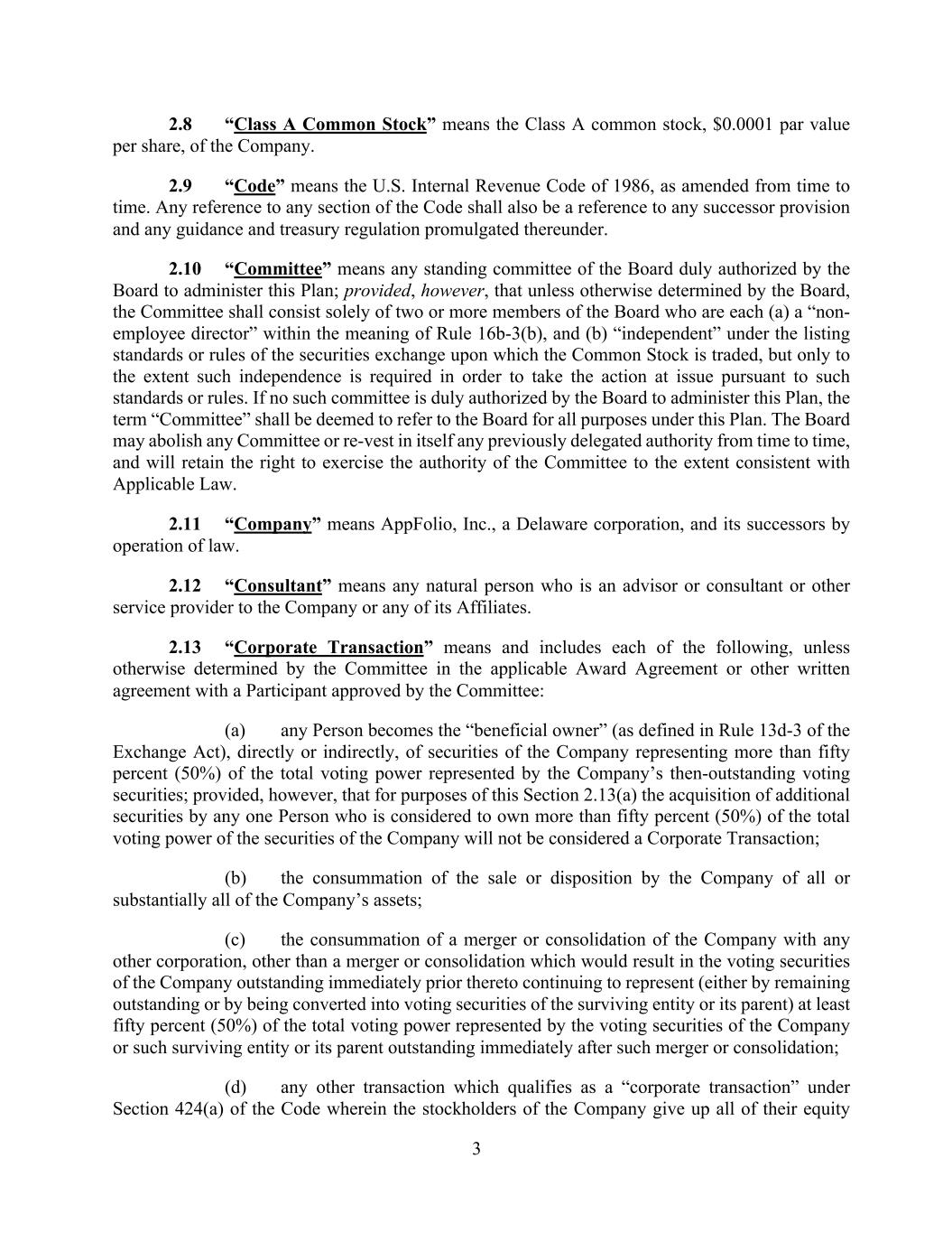 3 2.8 “Class A Common Stock” means the Class A common stock, $0.0001 par value per share, of the Company. 2.9 “Code” means the U.S. Internal Revenue Code of 1986, as amended from time to time. Any reference to any section of the Code shall also be a reference to any successor provision and any guidance and treasury regulation promulgated thereunder. 2.10 “Committee” means any standing committee of the Board duly authorized by the Board to administer this Plan; provided, however, that unless otherwise determined by the Board, the Committee shall consist solely of two or more members of the Board who are each (a) a “non- employee director” within the meaning of Rule 16b-3(b), and (b) “independent” under the listing standards or rules of the securities exchange upon which the Common Stock is traded, but only to the extent such independence is required in order to take the action at issue pursuant to such standards or rules. If no such committee is duly authorized by the Board to administer this Plan, the term “Committee” shall be deemed to refer to the Board for all purposes under this Plan. The Board may abolish any Committee or re-vest in itself any previously delegated authority from time to time, and will retain the right to exercise the authority of the Committee to the extent consistent with Applicable Law. 2.11 “Company” means AppFolio, Inc., a Delaware corporation, and its successors by operation of law. 2.12 “Consultant” means any natural person who is an advisor or consultant or other service provider to the Company or any of its Affiliates. 2.13 “Corporate Transaction” means and includes each of the following, unless otherwise determined by the Committee in the applicable Award Agreement or other written agreement with a Participant approved by the Committee: (a) any Person becomes the “beneficial owner” (as defined in Rule 13d-3 of the Exchange Act), directly or indirectly, of securities of the Company representing more than fifty percent (50%) of the total voting power represented by the Company’s then-outstanding voting securities; provided, however, that for purposes of this Section 2.13(a) the acquisition of additional securities by any one Person who is considered to own more than fifty percent (50%) of the total voting power of the securities of the Company will not be considered a Corporate Transaction; (b) the consummation of the sale or disposition by the Company of all or substantially all of the Company’s assets; (c) the consummation of a merger or consolidation of the Company with any other corporation, other than a merger or consolidation which would result in the voting securities of the Company outstanding immediately prior thereto continuing to represent (either by remaining outstanding or by being converted into voting securities of the surviving entity or its parent) at least fifty percent (50%) of the total voting power represented by the voting securities of the Company or such surviving entity or its parent outstanding immediately after such merger or consolidation; (d) any other transaction which qualifies as a “corporate transaction” under Section 424(a) of the Code wherein the stockholders of the Company give up all of their equity