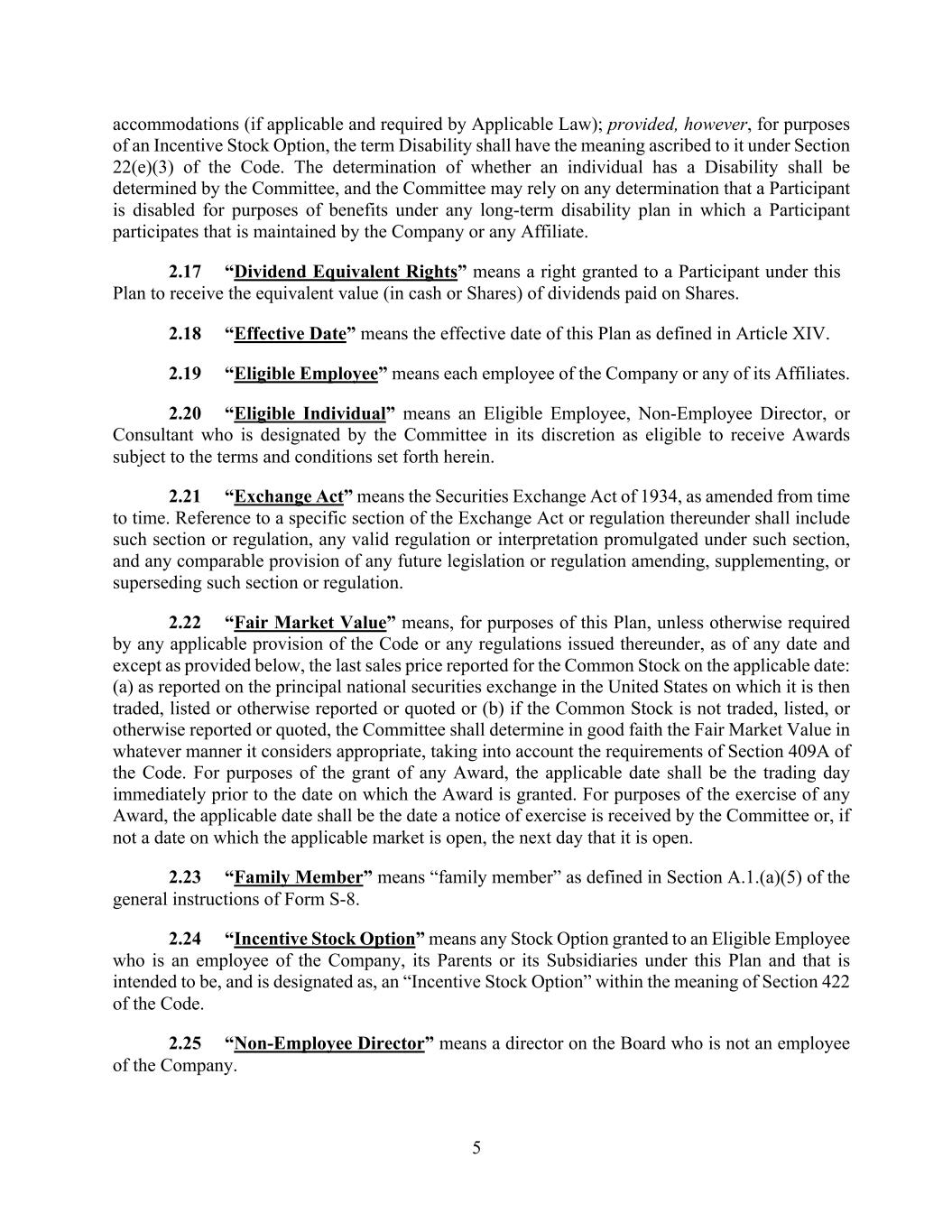 5 accommodations (if applicable and required by Applicable Law); provided, however, for purposes of an Incentive Stock Option, the term Disability shall have the meaning ascribed to it under Section 22(e)(3) of the Code. The determination of whether an individual has a Disability shall be determined by the Committee, and the Committee may rely on any determination that a Participant is disabled for purposes of benefits under any long-term disability plan in which a Participant participates that is maintained by the Company or any Affiliate. 2.17 “Dividend Equivalent Rights” means a right granted to a Participant under this Plan to receive the equivalent value (in cash or Shares) of dividends paid on Shares. 2.18 “Effective Date” means the effective date of this Plan as defined in Article XIV. 2.19 “Eligible Employee” means each employee of the Company or any of its Affiliates. 2.20 “Eligible Individual” means an Eligible Employee, Non-Employee Director, or Consultant who is designated by the Committee in its discretion as eligible to receive Awards subject to the terms and conditions set forth herein. 2.21 “Exchange Act” means the Securities Exchange Act of 1934, as amended from time to time. Reference to a specific section of the Exchange Act or regulation thereunder shall include such section or regulation, any valid regulation or interpretation promulgated under such section, and any comparable provision of any future legislation or regulation amending, supplementing, or superseding such section or regulation. 2.22 “Fair Market Value” means, for purposes of this Plan, unless otherwise required by any applicable provision of the Code or any regulations issued thereunder, as of any date and except as provided below, the last sales price reported for the Common Stock on the applicable date: (a) as reported on the principal national securities exchange in the United States on which it is then traded, listed or otherwise reported or quoted or (b) if the Common Stock is not traded, listed, or otherwise reported or quoted, the Committee shall determine in good faith the Fair Market Value in whatever manner it considers appropriate, taking into account the requirements of Section 409A of the Code. For purposes of the grant of any Award, the applicable date shall be the trading day immediately prior to the date on which the Award is granted. For purposes of the exercise of any Award, the applicable date shall be the date a notice of exercise is received by the Committee or, if not a date on which the applicable market is open, the next day that it is open. 2.23 “Family Member” means “family member” as defined in Section A.1.(a)(5) of the general instructions of Form S-8. 2.24 “Incentive Stock Option” means any Stock Option granted to an Eligible Employee who is an employee of the Company, its Parents or its Subsidiaries under this Plan and that is intended to be, and is designated as, an “Incentive Stock Option” within the meaning of Section 422 of the Code. 2.25 “Non-Employee Director” means a director on the Board who is not an employee of the Company.