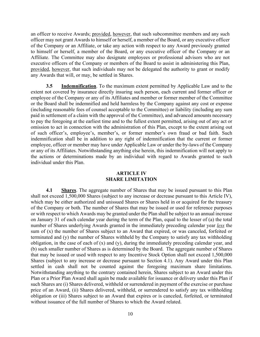 10 an officer to receive Awards; provided, however, that such subcommittee members and any such officer may not grant Awards to himself or herself, a member of the Board, or any executive officer of the Company or an Affiliate, or take any action with respect to any Award previously granted to himself or herself, a member of the Board, or any executive officer of the Company or an Affiliate. The Committee may also designate employees or professional advisors who are not executive officers of the Company or members of the Board to assist in administering this Plan, provided, however, that such individuals may not be delegated the authority to grant or modify any Awards that will, or may, be settled in Shares. 3.5 Indemnification. To the maximum extent permitted by Applicable Law and to the extent not covered by insurance directly insuring such person, each current and former officer or employee of the Company or any of its Affiliates and member or former member of the Committee or the Board shall be indemnified and held harmless by the Company against any cost or expense (including reasonable fees of counsel acceptable to the Committee) or liability (including any sum paid in settlement of a claim with the approval of the Committee), and advanced amounts necessary to pay the foregoing at the earliest time and to the fullest extent permitted, arising out of any act or omission to act in connection with the administration of this Plan, except to the extent arising out of such officer’s, employee’s, member’s, or former member’s own fraud or bad faith. Such indemnification shall be in addition to any right of indemnification that the current or former employee, officer or member may have under Applicable Law or under the by-laws of the Company or any of its Affiliates. Notwithstanding anything else herein, this indemnification will not apply to the actions or determinations made by an individual with regard to Awards granted to such individual under this Plan. ARTICLE IV SHARE LIMITATION 4.1 Shares. The aggregate number of Shares that may be issued pursuant to this Plan shall not exceed 1,500,000 Shares (subject to any increase or decrease pursuant to this Article IV), which may be either authorized and unissued Shares or Shares held in or acquired for the treasury of the Company or both. The number of Shares that may be issued or used for reference purposes or with respect to which Awards may be granted under the Plan shall be subject to an annual increase on January 31 of each calendar year during the term of the Plan, equal to the lesser of (a) the total number of Shares underlying Awards granted in the immediately preceding calendar year less the sum of (x) the number of Shares subject to an Award that expired, or was canceled, forfeited or terminated and (y) the number of Shares withheld by the Company to satisfy any tax withholding obligation, in the case of each of (x) and (y), during the immediately preceding calendar year, and (b) such smaller number of Shares as is determined by the Board. The aggregate number of Shares that may be issued or used with respect to any Incentive Stock Option shall not exceed 1,500,000 Shares (subject to any increase or decrease pursuant to Section 4.1). Any Award under this Plan settled in cash shall not be counted against the foregoing maximum share limitations. Notwithstanding anything to the contrary contained herein, Shares subject to an Award under this Plan or a Prior Plan Award shall again be made available for issuance or delivery under this Plan if such Shares are (i) Shares delivered, withheld or surrendered in payment of the exercise or purchase price of an Award, (ii) Shares delivered, withheld, or surrendered to satisfy any tax withholding obligation or (iii) Shares subject to an Award that expires or is canceled, forfeited, or terminated without issuance of the full number of Shares to which the Award related.