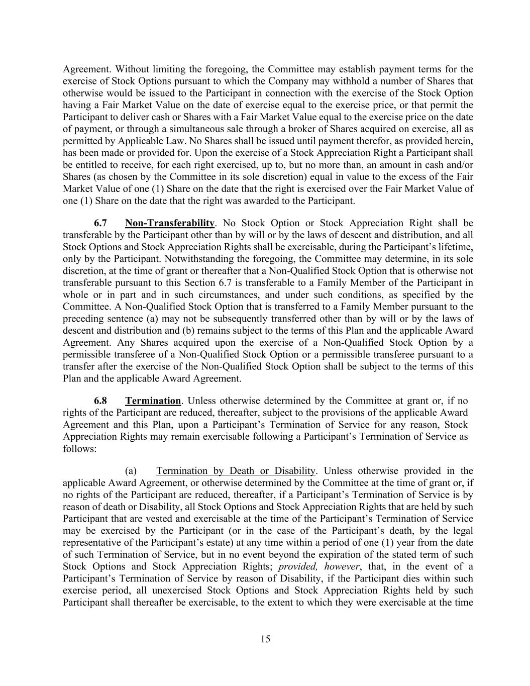 15 Agreement. Without limiting the foregoing, the Committee may establish payment terms for the exercise of Stock Options pursuant to which the Company may withhold a number of Shares that otherwise would be issued to the Participant in connection with the exercise of the Stock Option having a Fair Market Value on the date of exercise equal to the exercise price, or that permit the Participant to deliver cash or Shares with a Fair Market Value equal to the exercise price on the date of payment, or through a simultaneous sale through a broker of Shares acquired on exercise, all as permitted by Applicable Law. No Shares shall be issued until payment therefor, as provided herein, has been made or provided for. Upon the exercise of a Stock Appreciation Right a Participant shall be entitled to receive, for each right exercised, up to, but no more than, an amount in cash and/or Shares (as chosen by the Committee in its sole discretion) equal in value to the excess of the Fair Market Value of one (1) Share on the date that the right is exercised over the Fair Market Value of one (1) Share on the date that the right was awarded to the Participant. 6.7 Non-Transferability. No Stock Option or Stock Appreciation Right shall be transferable by the Participant other than by will or by the laws of descent and distribution, and all Stock Options and Stock Appreciation Rights shall be exercisable, during the Participant’s lifetime, only by the Participant. Notwithstanding the foregoing, the Committee may determine, in its sole discretion, at the time of grant or thereafter that a Non-Qualified Stock Option that is otherwise not transferable pursuant to this Section 6.7 is transferable to a Family Member of the Participant in whole or in part and in such circumstances, and under such conditions, as specified by the Committee. A Non-Qualified Stock Option that is transferred to a Family Member pursuant to the preceding sentence (a) may not be subsequently transferred other than by will or by the laws of descent and distribution and (b) remains subject to the terms of this Plan and the applicable Award Agreement. Any Shares acquired upon the exercise of a Non-Qualified Stock Option by a permissible transferee of a Non-Qualified Stock Option or a permissible transferee pursuant to a transfer after the exercise of the Non-Qualified Stock Option shall be subject to the terms of this Plan and the applicable Award Agreement. 6.8 Termination. Unless otherwise determined by the Committee at grant or, if no rights of the Participant are reduced, thereafter, subject to the provisions of the applicable Award Agreement and this Plan, upon a Participant’s Termination of Service for any reason, Stock Appreciation Rights may remain exercisable following a Participant’s Termination of Service as follows: (a) Termination by Death or Disability. Unless otherwise provided in the applicable Award Agreement, or otherwise determined by the Committee at the time of grant or, if no rights of the Participant are reduced, thereafter, if a Participant’s Termination of Service is by reason of death or Disability, all Stock Options and Stock Appreciation Rights that are held by such Participant that are vested and exercisable at the time of the Participant’s Termination of Service may be exercised by the Participant (or in the case of the Participant’s death, by the legal representative of the Participant’s estate) at any time within a period of one (1) year from the date of such Termination of Service, but in no event beyond the expiration of the stated term of such Stock Options and Stock Appreciation Rights; provided, however, that, in the event of a Participant’s Termination of Service by reason of Disability, if the Participant dies within such exercise period, all unexercised Stock Options and Stock Appreciation Rights held by such Participant shall thereafter be exercisable, to the extent to which they were exercisable at the time