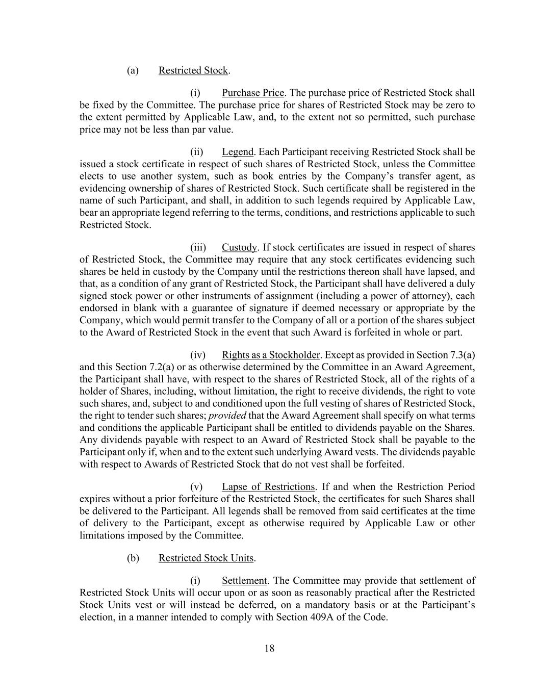 18 (a) Restricted Stock. (i) Purchase Price. The purchase price of Restricted Stock shall be fixed by the Committee. The purchase price for shares of Restricted Stock may be zero to the extent permitted by Applicable Law, and, to the extent not so permitted, such purchase price may not be less than par value. (ii) Legend. Each Participant receiving Restricted Stock shall be issued a stock certificate in respect of such shares of Restricted Stock, unless the Committee elects to use another system, such as book entries by the Company’s transfer agent, as evidencing ownership of shares of Restricted Stock. Such certificate shall be registered in the name of such Participant, and shall, in addition to such legends required by Applicable Law, bear an appropriate legend referring to the terms, conditions, and restrictions applicable to such Restricted Stock. (iii) Custody. If stock certificates are issued in respect of shares of Restricted Stock, the Committee may require that any stock certificates evidencing such shares be held in custody by the Company until the restrictions thereon shall have lapsed, and that, as a condition of any grant of Restricted Stock, the Participant shall have delivered a duly signed stock power or other instruments of assignment (including a power of attorney), each endorsed in blank with a guarantee of signature if deemed necessary or appropriate by the Company, which would permit transfer to the Company of all or a portion of the shares subject to the Award of Restricted Stock in the event that such Award is forfeited in whole or part. (iv) Rights as a Stockholder. Except as provided in Section 7.3(a) and this Section 7.2(a) or as otherwise determined by the Committee in an Award Agreement, the Participant shall have, with respect to the shares of Restricted Stock, all of the rights of a holder of Shares, including, without limitation, the right to receive dividends, the right to vote such shares, and, subject to and conditioned upon the full vesting of shares of Restricted Stock, the right to tender such shares; provided that the Award Agreement shall specify on what terms and conditions the applicable Participant shall be entitled to dividends payable on the Shares. Any dividends payable with respect to an Award of Restricted Stock shall be payable to the Participant only if, when and to the extent such underlying Award vests. The dividends payable with respect to Awards of Restricted Stock that do not vest shall be forfeited. (v) Lapse of Restrictions. If and when the Restriction Period expires without a prior forfeiture of the Restricted Stock, the certificates for such Shares shall be delivered to the Participant. All legends shall be removed from said certificates at the time of delivery to the Participant, except as otherwise required by Applicable Law or other limitations imposed by the Committee. (b) Restricted Stock Units. (i) Settlement. The Committee may provide that settlement of Restricted Stock Units will occur upon or as soon as reasonably practical after the Restricted Stock Units vest or will instead be deferred, on a mandatory basis or at the Participant’s election, in a manner intended to comply with Section 409A of the Code.