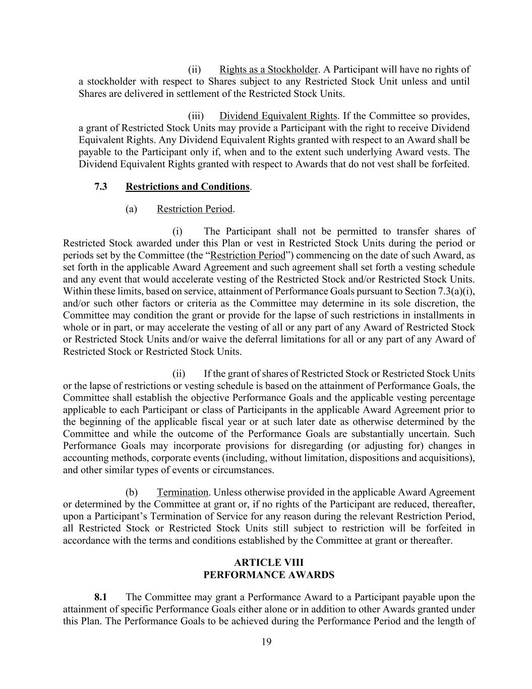 19 (ii) Rights as a Stockholder. A Participant will have no rights of a stockholder with respect to Shares subject to any Restricted Stock Unit unless and until Shares are delivered in settlement of the Restricted Stock Units. (iii) Dividend Equivalent Rights. If the Committee so provides, a grant of Restricted Stock Units may provide a Participant with the right to receive Dividend Equivalent Rights. Any Dividend Equivalent Rights granted with respect to an Award shall be payable to the Participant only if, when and to the extent such underlying Award vests. The Dividend Equivalent Rights granted with respect to Awards that do not vest shall be forfeited. 7.3 Restrictions and Conditions. (a) Restriction Period. (i) The Participant shall not be permitted to transfer shares of Restricted Stock awarded under this Plan or vest in Restricted Stock Units during the period or periods set by the Committee (the “Restriction Period”) commencing on the date of such Award, as set forth in the applicable Award Agreement and such agreement shall set forth a vesting schedule and any event that would accelerate vesting of the Restricted Stock and/or Restricted Stock Units. Within these limits, based on service, attainment of Performance Goals pursuant to Section 7.3(a)(i), and/or such other factors or criteria as the Committee may determine in its sole discretion, the Committee may condition the grant or provide for the lapse of such restrictions in installments in whole or in part, or may accelerate the vesting of all or any part of any Award of Restricted Stock or Restricted Stock Units and/or waive the deferral limitations for all or any part of any Award of Restricted Stock or Restricted Stock Units. (ii) If the grant of shares of Restricted Stock or Restricted Stock Units or the lapse of restrictions or vesting schedule is based on the attainment of Performance Goals, the Committee shall establish the objective Performance Goals and the applicable vesting percentage applicable to each Participant or class of Participants in the applicable Award Agreement prior to the beginning of the applicable fiscal year or at such later date as otherwise determined by the Committee and while the outcome of the Performance Goals are substantially uncertain. Such Performance Goals may incorporate provisions for disregarding (or adjusting for) changes in accounting methods, corporate events (including, without limitation, dispositions and acquisitions), and other similar types of events or circumstances. (b) Termination. Unless otherwise provided in the applicable Award Agreement or determined by the Committee at grant or, if no rights of the Participant are reduced, thereafter, upon a Participant’s Termination of Service for any reason during the relevant Restriction Period, all Restricted Stock or Restricted Stock Units still subject to restriction will be forfeited in accordance with the terms and conditions established by the Committee at grant or thereafter. ARTICLE VIII PERFORMANCE AWARDS 8.1 The Committee may grant a Performance Award to a Participant payable upon the attainment of specific Performance Goals either alone or in addition to other Awards granted under this Plan. The Performance Goals to be achieved during the Performance Period and the length of