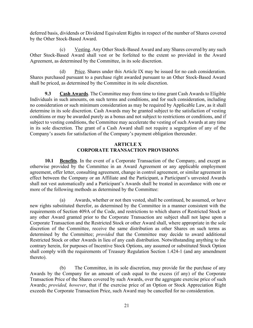 21 deferred basis, dividends or Dividend Equivalent Rights in respect of the number of Shares covered by the Other Stock-Based Award. (c) Vesting. Any Other Stock-Based Award and any Shares covered by any such Other Stock-Based Award shall vest or be forfeited to the extent so provided in the Award Agreement, as determined by the Committee, in its sole discretion. (d) Price. Shares under this Article IX may be issued for no cash consideration. Shares purchased pursuant to a purchase right awarded pursuant to an Other Stock-Based Award shall be priced, as determined by the Committee in its sole discretion. 9.3 Cash Awards. The Committee may from time to time grant Cash Awards to Eligible Individuals in such amounts, on such terms and conditions, and for such consideration, including no consideration or such minimum consideration as may be required by Applicable Law, as it shall determine in its sole discretion. Cash Awards may be granted subject to the satisfaction of vesting conditions or may be awarded purely as a bonus and not subject to restrictions or conditions, and if subject to vesting conditions, the Committee may accelerate the vesting of such Awards at any time in its sole discretion. The grant of a Cash Award shall not require a segregation of any of the Company’s assets for satisfaction of the Company’s payment obligation thereunder. ARTICLE X CORPORATE TRANSACTION PROVISIONS 10.1 Benefits. In the event of a Corporate Transaction of the Company, and except as otherwise provided by the Committee in an Award Agreement or any applicable employment agreement, offer letter, consulting agreement, change in control agreement, or similar agreement in effect between the Company or an Affiliate and the Participant, a Participant’s unvested Awards shall not vest automatically and a Participant’s Awards shall be treated in accordance with one or more of the following methods as determined by the Committee: (a) Awards, whether or not then vested, shall be continued, be assumed, or have new rights substituted therefor, as determined by the Committee in a manner consistent with the requirements of Section 409A of the Code, and restrictions to which shares of Restricted Stock or any other Award granted prior to the Corporate Transaction are subject shall not lapse upon a Corporate Transaction and the Restricted Stock or other Award shall, where appropriate in the sole discretion of the Committee, receive the same distribution as other Shares on such terms as determined by the Committee; provided that the Committee may decide to award additional Restricted Stock or other Awards in lieu of any cash distribution. Notwithstanding anything to the contrary herein, for purposes of Incentive Stock Options, any assumed or substituted Stock Option shall comply with the requirements of Treasury Regulation Section 1.424-1 (and any amendment thereto). (b) The Committee, in its sole discretion, may provide for the purchase of any Awards by the Company for an amount of cash equal to the excess (if any) of the Corporate Transaction Price of the Shares covered by such Awards, over the aggregate exercise price of such Awards; provided, however, that if the exercise price of an Option or Stock Appreciation Right exceeds the Corporate Transaction Price, such Award may be cancelled for no consideration.