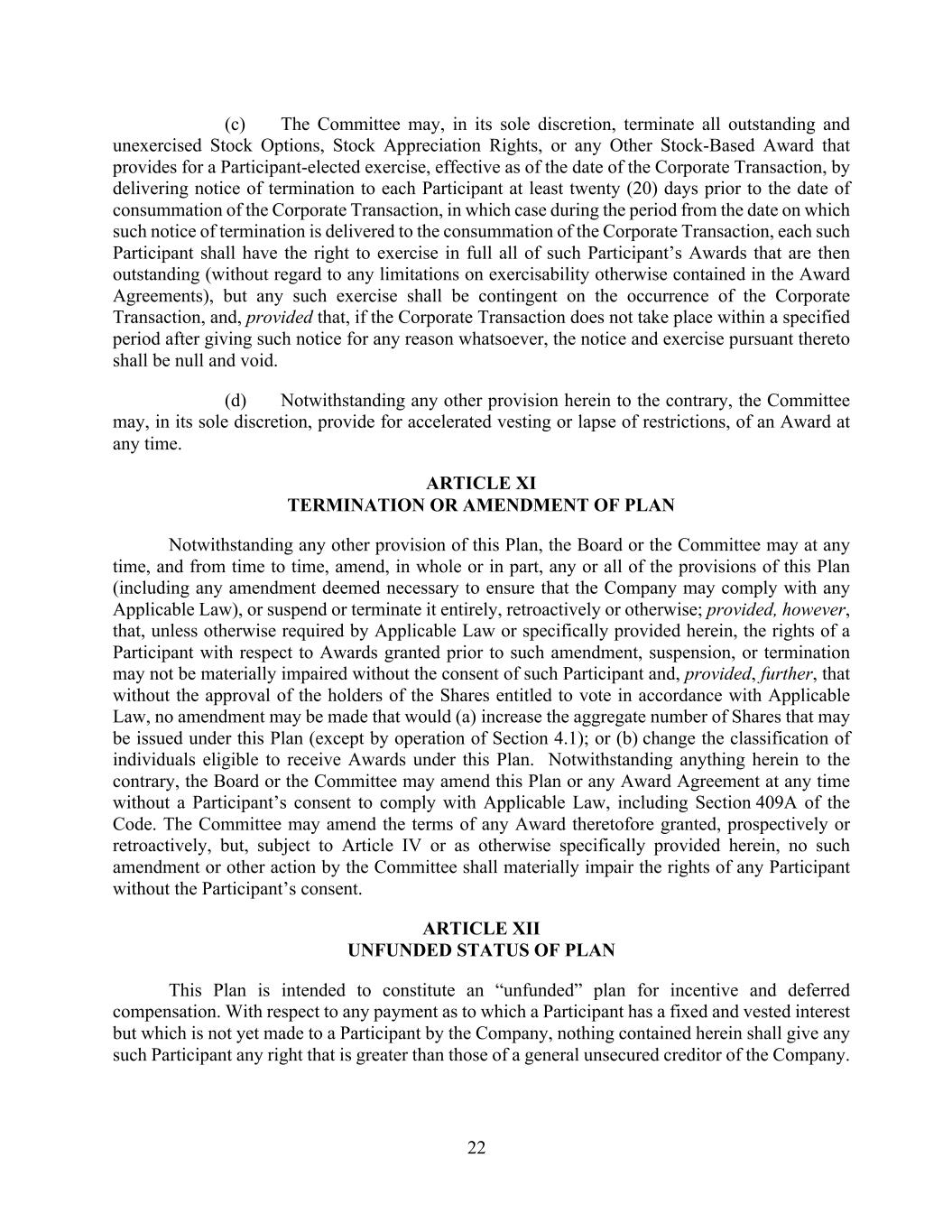 22 (c) The Committee may, in its sole discretion, terminate all outstanding and unexercised Stock Options, Stock Appreciation Rights, or any Other Stock-Based Award that provides for a Participant-elected exercise, effective as of the date of the Corporate Transaction, by delivering notice of termination to each Participant at least twenty (20) days prior to the date of consummation of the Corporate Transaction, in which case during the period from the date on which such notice of termination is delivered to the consummation of the Corporate Transaction, each such Participant shall have the right to exercise in full all of such Participant’s Awards that are then outstanding (without regard to any limitations on exercisability otherwise contained in the Award Agreements), but any such exercise shall be contingent on the occurrence of the Corporate Transaction, and, provided that, if the Corporate Transaction does not take place within a specified period after giving such notice for any reason whatsoever, the notice and exercise pursuant thereto shall be null and void. (d) Notwithstanding any other provision herein to the contrary, the Committee may, in its sole discretion, provide for accelerated vesting or lapse of restrictions, of an Award at any time. ARTICLE XI TERMINATION OR AMENDMENT OF PLAN Notwithstanding any other provision of this Plan, the Board or the Committee may at any time, and from time to time, amend, in whole or in part, any or all of the provisions of this Plan (including any amendment deemed necessary to ensure that the Company may comply with any Applicable Law), or suspend or terminate it entirely, retroactively or otherwise; provided, however, that, unless otherwise required by Applicable Law or specifically provided herein, the rights of a Participant with respect to Awards granted prior to such amendment, suspension, or termination may not be materially impaired without the consent of such Participant and, provided, further, that without the approval of the holders of the Shares entitled to vote in accordance with Applicable Law, no amendment may be made that would (a) increase the aggregate number of Shares that may be issued under this Plan (except by operation of Section 4.1); or (b) change the classification of individuals eligible to receive Awards under this Plan. Notwithstanding anything herein to the contrary, the Board or the Committee may amend this Plan or any Award Agreement at any time without a Participant’s consent to comply with Applicable Law, including Section 409A of the Code. The Committee may amend the terms of any Award theretofore granted, prospectively or retroactively, but, subject to Article IV or as otherwise specifically provided herein, no such amendment or other action by the Committee shall materially impair the rights of any Participant without the Participant’s consent. ARTICLE XII UNFUNDED STATUS OF PLAN This Plan is intended to constitute an “unfunded” plan for incentive and deferred compensation. With respect to any payment as to which a Participant has a fixed and vested interest but which is not yet made to a Participant by the Company, nothing contained herein shall give any such Participant any right that is greater than those of a general unsecured creditor of the Company.