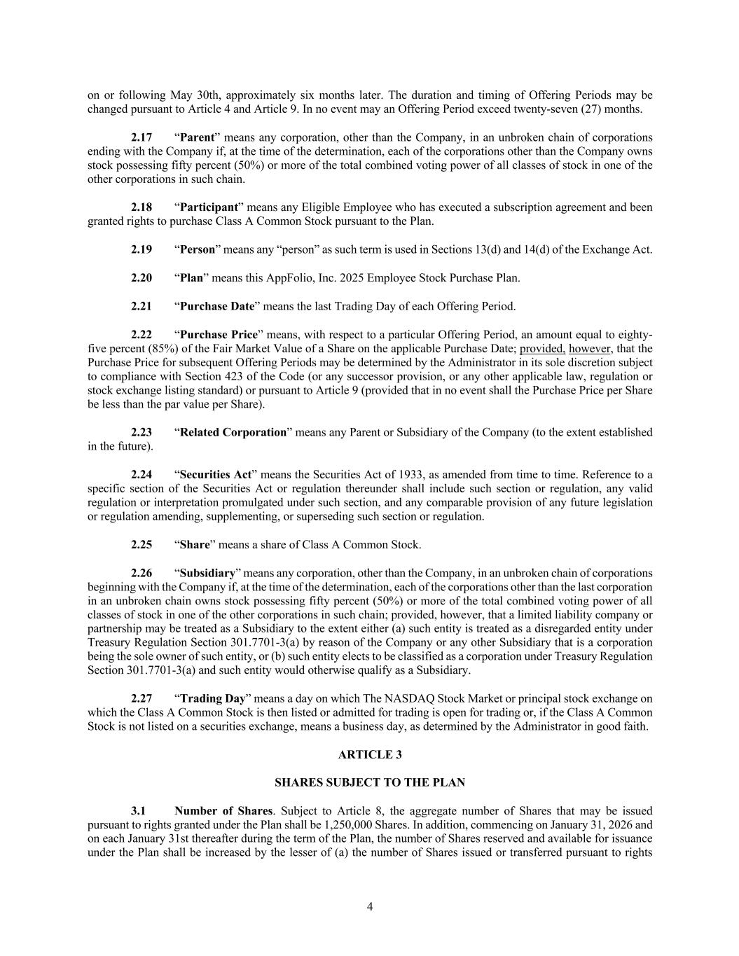 4 on or following May 30th, approximately six months later. The duration and timing of Offering Periods may be changed pursuant to Article 4 and Article 9. In no event may an Offering Period exceed twenty-seven (27) months. 2.17 “Parent” means any corporation, other than the Company, in an unbroken chain of corporations ending with the Company if, at the time of the determination, each of the corporations other than the Company owns stock possessing fifty percent (50%) or more of the total combined voting power of all classes of stock in one of the other corporations in such chain. 2.18 “Participant” means any Eligible Employee who has executed a subscription agreement and been granted rights to purchase Class A Common Stock pursuant to the Plan. 2.19 “Person” means any “person” as such term is used in Sections 13(d) and 14(d) of the Exchange Act. 2.20 “Plan” means this AppFolio, Inc. 2025 Employee Stock Purchase Plan. 2.21 “Purchase Date” means the last Trading Day of each Offering Period. 2.22 “Purchase Price” means, with respect to a particular Offering Period, an amount equal to eighty- five percent (85%) of the Fair Market Value of a Share on the applicable Purchase Date; provided, however, that the Purchase Price for subsequent Offering Periods may be determined by the Administrator in its sole discretion subject to compliance with Section 423 of the Code (or any successor provision, or any other applicable law, regulation or stock exchange listing standard) or pursuant to Article 9 (provided that in no event shall the Purchase Price per Share be less than the par value per Share). 2.23 “Related Corporation” means any Parent or Subsidiary of the Company (to the extent established in the future). 2.24 “Securities Act” means the Securities Act of 1933, as amended from time to time. Reference to a specific section of the Securities Act or regulation thereunder shall include such section or regulation, any valid regulation or interpretation promulgated under such section, and any comparable provision of any future legislation or regulation amending, supplementing, or superseding such section or regulation. 2.25 “Share” means a share of Class A Common Stock. 2.26 “Subsidiary” means any corporation, other than the Company, in an unbroken chain of corporations beginning with the Company if, at the time of the determination, each of the corporations other than the last corporation in an unbroken chain owns stock possessing fifty percent (50%) or more of the total combined voting power of all classes of stock in one of the other corporations in such chain; provided, however, that a limited liability company or partnership may be treated as a Subsidiary to the extent either (a) such entity is treated as a disregarded entity under Treasury Regulation Section 301.7701-3(a) by reason of the Company or any other Subsidiary that is a corporation being the sole owner of such entity, or (b) such entity elects to be classified as a corporation under Treasury Regulation Section 301.7701-3(a) and such entity would otherwise qualify as a Subsidiary. 2.27 “Trading Day” means a day on which The NASDAQ Stock Market or principal stock exchange on which the Class A Common Stock is then listed or admitted for trading is open for trading or, if the Class A Common Stock is not listed on a securities exchange, means a business day, as determined by the Administrator in good faith. ARTICLE 3 SHARES SUBJECT TO THE PLAN 3.1 Number of Shares. Subject to Article 8, the aggregate number of Shares that may be issued pursuant to rights granted under the Plan shall be 1,250,000 Shares. In addition, commencing on January 31, 2026 and on each January 31st thereafter during the term of the Plan, the number of Shares reserved and available for issuance under the Plan shall be increased by the lesser of (a) the number of Shares issued or transferred pursuant to rights