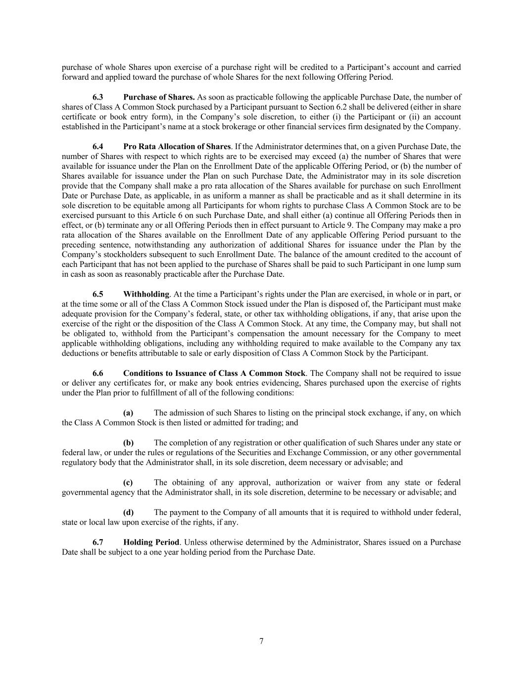 7 purchase of whole Shares upon exercise of a purchase right will be credited to a Participant’s account and carried forward and applied toward the purchase of whole Shares for the next following Offering Period. 6.3 Purchase of Shares. As soon as practicable following the applicable Purchase Date, the number of shares of Class A Common Stock purchased by a Participant pursuant to Section 6.2 shall be delivered (either in share certificate or book entry form), in the Company’s sole discretion, to either (i) the Participant or (ii) an account established in the Participant’s name at a stock brokerage or other financial services firm designated by the Company. 6.4 Pro Rata Allocation of Shares. If the Administrator determines that, on a given Purchase Date, the number of Shares with respect to which rights are to be exercised may exceed (a) the number of Shares that were available for issuance under the Plan on the Enrollment Date of the applicable Offering Period, or (b) the number of Shares available for issuance under the Plan on such Purchase Date, the Administrator may in its sole discretion provide that the Company shall make a pro rata allocation of the Shares available for purchase on such Enrollment Date or Purchase Date, as applicable, in as uniform a manner as shall be practicable and as it shall determine in its sole discretion to be equitable among all Participants for whom rights to purchase Class A Common Stock are to be exercised pursuant to this Article 6 on such Purchase Date, and shall either (a) continue all Offering Periods then in effect, or (b) terminate any or all Offering Periods then in effect pursuant to Article 9. The Company may make a pro rata allocation of the Shares available on the Enrollment Date of any applicable Offering Period pursuant to the preceding sentence, notwithstanding any authorization of additional Shares for issuance under the Plan by the Company’s stockholders subsequent to such Enrollment Date. The balance of the amount credited to the account of each Participant that has not been applied to the purchase of Shares shall be paid to such Participant in one lump sum in cash as soon as reasonably practicable after the Purchase Date. 6.5 Withholding. At the time a Participant’s rights under the Plan are exercised, in whole or in part, or at the time some or all of the Class A Common Stock issued under the Plan is disposed of, the Participant must make adequate provision for the Company’s federal, state, or other tax withholding obligations, if any, that arise upon the exercise of the right or the disposition of the Class A Common Stock. At any time, the Company may, but shall not be obligated to, withhold from the Participant’s compensation the amount necessary for the Company to meet applicable withholding obligations, including any withholding required to make available to the Company any tax deductions or benefits attributable to sale or early disposition of Class A Common Stock by the Participant. 6.6 Conditions to Issuance of Class A Common Stock. The Company shall not be required to issue or deliver any certificates for, or make any book entries evidencing, Shares purchased upon the exercise of rights under the Plan prior to fulfillment of all of the following conditions: (a) The admission of such Shares to listing on the principal stock exchange, if any, on which the Class A Common Stock is then listed or admitted for trading; and (b) The completion of any registration or other qualification of such Shares under any state or federal law, or under the rules or regulations of the Securities and Exchange Commission, or any other governmental regulatory body that the Administrator shall, in its sole discretion, deem necessary or advisable; and (c) The obtaining of any approval, authorization or waiver from any state or federal governmental agency that the Administrator shall, in its sole discretion, determine to be necessary or advisable; and (d) The payment to the Company of all amounts that it is required to withhold under federal, state or local law upon exercise of the rights, if any. 6.7 Holding Period. Unless otherwise determined by the Administrator, Shares issued on a Purchase Date shall be subject to a one year holding period from the Purchase Date.