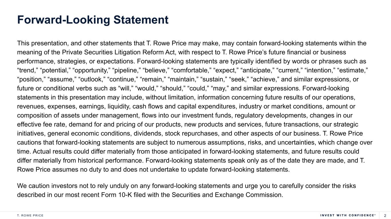 2T. R O W E P R I C E This presentation, and other statements that T. Rowe Price may make, may contain forward-looking statements within the meaning of the Private Securities Litigation Reform Act, with respect to T. Rowe Price’s future financial or business performance, strategies, or expectations. Forward-looking statements are typically identified by words or phrases such as “trend,” “potential,” “opportunity,” “pipeline,” “believe,” “comfortable,” “expect,” “anticipate,” “current,” “intention,” “estimate,” “position,” “assume,” “outlook,” “continue,” “remain,” “maintain,” “sustain,” “seek,” “achieve,” and similar expressions, or future or conditional verbs such as “will,” “would,” “should,” “could,” “may,” and similar expressions. Forward-looking statements in this presentation may include, without limitation, information concerning future results of our operations, revenues, expenses, earnings, liquidity, cash flows and capital expenditures, industry or market conditions, amount or composition of assets under management, flows into our investment funds, regulatory developments, changes in our effective fee rate, demand for and pricing of our products, new products and services, future transactions, our strategic initiatives, general economic conditions, dividends, stock repurchases, and other aspects of our business. T. Rowe Price cautions that forward-looking statements are subject to numerous assumptions, risks, and uncertainties, which change over time. Actual results could differ materially from those anticipated in forward-looking statements, and future results could differ materially from historical performance. Forward-looking statements speak only as of the date they are made, and T. Rowe Price assumes no duty to and does not undertake to update forward-looking statements. We caution investors not to rely unduly on any forward-looking statements and urge you to carefully consider the risks described in our most recent Form 10-K filed with the Securities and Exchange Commission. Forward-Looking Statement