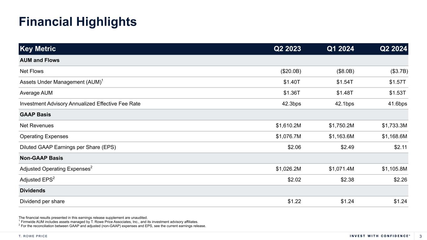 3T. R O W E P R I C E Key Metric Q2 2023 Q1 2024 Q2 2024 AUM and Flows Net Flows ($20.0B) ($8.0B) ($3.7B) Assets Under Management (AUM)1 $1.40T $1.54T $1.57T Average AUM $1.36T $1.48T $1.53T Investment Advisory Annualized Effective Fee Rate 42.3bps 42.1bps 41.6bps GAAP Basis Net Revenues $1,610.2M $1,750.2M $1,733.3M Operating Expenses $1,076.7M $1,163.6M $1,168.6M Diluted GAAP Earnings per Share (EPS) $2.06 $2.49 $2.11 Non-GAAP Basis Adjusted Operating Expenses2 $1,026.2M $1,071.4M $1,105.8M Adjusted EPS2 $2.02 $2.38 $2.26 Dividends Dividend per share $1.22 $1.24 $1.24 The financial results presented in this earnings release supplement are unaudited. 1 Firmwide AUM includes assets managed by T. Rowe Price Associates, Inc., and its investment advisory affiliates. 2 For the reconciliation between GAAP and adjusted (non-GAAP) expenses and EPS, see the current earnings release. Financial Highlights
