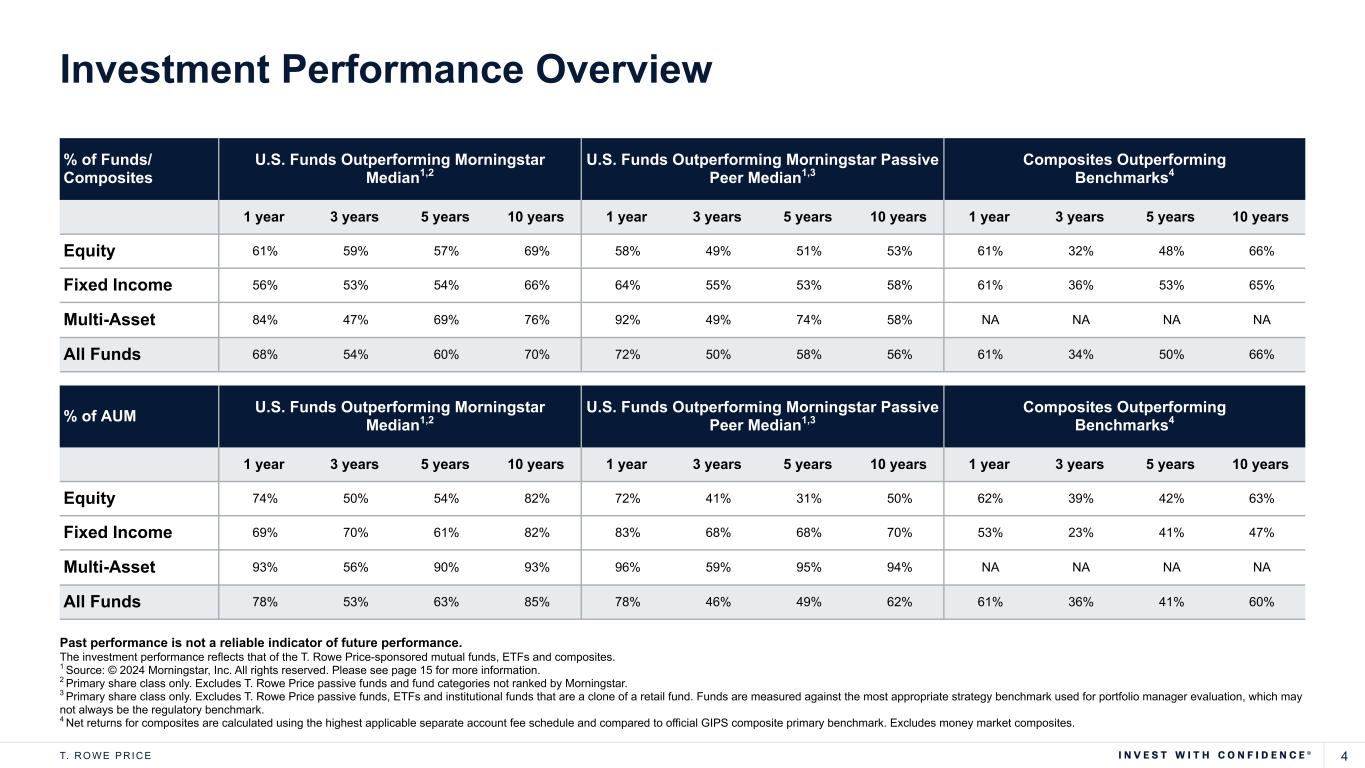 4T. R O W E P R I C E % of Funds/ Composites U.S. Funds Outperforming Morningstar Median1,2 U.S. Funds Outperforming Morningstar Passive Peer Median1,3 Composites Outperforming Benchmarks4 1 year 3 years 5 years 10 years 1 year 3 years 5 years 10 years 1 year 3 years 5 years 10 years Equity 61% 59% 57% 69% 58% 49% 51% 53% 61% 32% 48% 66% Fixed Income 56% 53% 54% 66% 64% 55% 53% 58% 61% 36% 53% 65% Multi-Asset 84% 47% 69% 76% 92% 49% 74% 58% NA NA NA NA All Funds 68% 54% 60% 70% 72% 50% 58% 56% 61% 34% 50% 66% Past performance is not a reliable indicator of future performance. The investment performance reflects that of the T. Rowe Price-sponsored mutual funds, ETFs and composites. 1 Source: © 2024 Morningstar, Inc. All rights reserved. Please see page 15 for more information. 2 Primary share class only. Excludes T. Rowe Price passive funds and fund categories not ranked by Morningstar. 3 Primary share class only. Excludes T. Rowe Price passive funds, ETFs and institutional funds that are a clone of a retail fund. Funds are measured against the most appropriate strategy benchmark used for portfolio manager evaluation, which may not always be the regulatory benchmark. 4 Net returns for composites are calculated using the highest applicable separate account fee schedule and compared to official GIPS composite primary benchmark. Excludes money market composites. % of AUM U.S. Funds Outperforming Morningstar Median1,2 U.S. Funds Outperforming Morningstar Passive Peer Median1,3 Composites Outperforming Benchmarks4 1 year 3 years 5 years 10 years 1 year 3 years 5 years 10 years 1 year 3 years 5 years 10 years Equity 74% 50% 54% 82% 72% 41% 31% 50% 62% 39% 42% 63% Fixed Income 69% 70% 61% 82% 83% 68% 68% 70% 53% 23% 41% 47% Multi-Asset 93% 56% 90% 93% 96% 59% 95% 94% NA NA NA NA All Funds 78% 53% 63% 85% 78% 46% 49% 62% 61% 36% 41% 60% Investment Performance Overview