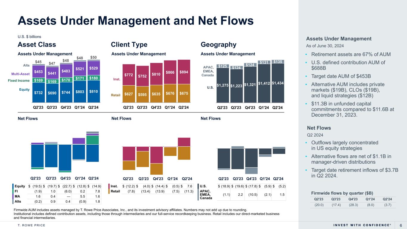5T. R O W E P R I C E Firmwide AUM includes assets managed by T. Rowe Price Associates, Inc., and its investment advisory affiliates. OHA’s fee-basis AUM of $46.9B acquired on December 29, 2021, is reflected in 2021 ending AUM. All periods after 2021 reflect the related activity. Other acquisition of AUM is detailed in our quarterly releases and 10Qs. Distributions, net of reinvestments, are included in the market change figure. Manager-driven distributions related to our alternative products by year: 2022: $2.6B, 2023: $2.6B, YTD: $2.1B U.S. $ billions Assets Under Management Market Change ($B) +92.3 +60.4 -6.6 +70.1 +127.6 +50.7 +14.7 +50.5 +166.3 -42.0 +231.3 +256.9 +198.9 -351.4 +251.7 +136.3 Net Flows ($B) +22.7 +30.3 +14.1 +17.2 -12.0 +3.7 +1.6 -2.8 +14.0 +13.2 +13.2 +5.6 -28.5 -61.7 -81.8 -11.7 En di ng A U M $391 $482 $489 $577 $692 $747 $763 $811 $991 $962 $1,207 $1,471 $1,688 $1,275 $1,445 $1,569 2009 2010 2011 2012 2013 2014 2015 2016 2017 2018 2019 2020 2021 2022 2023 June 2024