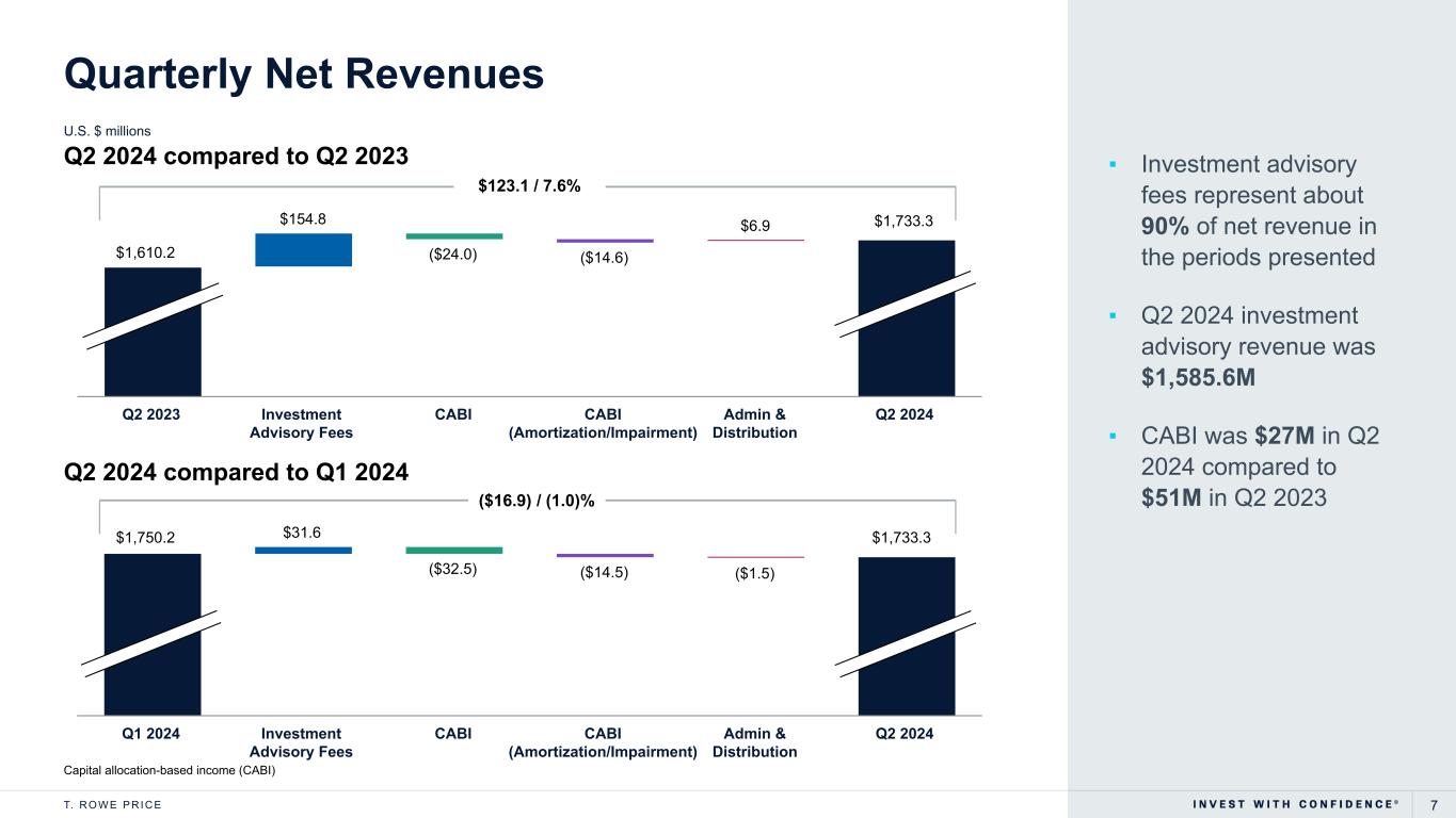 6T. R O W E P R I C E Firmwide AUM includes assets managed by T. Rowe Price Associates, Inc., and its investment advisory affiliates. Numbers may not add up due to rounding. Institutional includes defined contribution assets, including those through intermediaries and our full-service recordkeeping business. Retail includes our direct-marketed business and financial intermediaries. Assets Under Management and Net Flows U.S. $ billions ▪ Retirement assets are 67% of AUM ▪ U.S. defined contribution AUM of $688B ▪ Target date AUM of $453B ▪ Alternative AUM includes private markets ($19B), CLOs ($19B), and liquid strategies ($12B) ▪ $11.3B in unfunded capital commitments compared to $11.6B at December 31, 2023. ▪ Outflows largely concentrated in US equity strategies ▪ Alternative flows are net of $1.1B in manager-driven distributions ▪ Target date retirement inflows of $3.7B in Q2 2024. Firmwide flows by quarter ($B) Q2'23 Q3'23 Q4'23 Q1'24 Q2'24 (20.0) (17.4) (28.3) (8.0) (3.7) Net Flows Q2 2024 Assets Under Management As of June 30, 2024Asset Class Client Type Geography Equity $ (19.5) $ (19.7) $ (22.7) $ (12.8) $ (14.9) FI (1.9) 1.0 (6.0) 0.2 7.8 MA 1.6 0.4 — 5.5 1.6 Alts (0.2) 0.9 0.4 (0.9) 1.8 Inst. $ (12.2) $ (4.0) $ (14.4) $ (0.5) $ 7.6 Retail (7.8) (13.4) (13.9) (7.5) (11.3) U.S. $ (18.9) $ (19.6) $ (17.8) $ (5.9) $ (5.2) APAC, EMEA, Canada (1.1) 2.2 (10.5) (2.1) 1.5 Retail Inst. U.S. APAC, EMEA, Canada $732 $690 $744 $803 $810 $169 $169 $170 $171 $180 $453 $441 $483 $521 $529 $45 $47 $48 $48 $50 Q2'23 Q3'23 Q4'23 Q1'24 Q2'24 Fixed Income Multi-Asset Alts Equity $627 $595 $635 $676 $675 $772 $752 $810 $866 $894 Q2'23 Q3'23 Q4'23 Q1'24 Q2'24 $1,275 $1,223 $1,321 $1,412 $1,434 $125 $124 $124 $131 $135 Q2'23 Q3'23 Q4'23 Q1'24 Q2'24 Assets Under Management Assets Under Management Assets Under Management Net Flows Net Flows Net Flows Q2'23 Q3'23 Q4'23 Q1'24 Q2'24 Q2'23 Q3'23 Q4'23 Q1'24 Q2'24 Q2'23 Q3'23 Q4'23 Q1'24 Q2'24