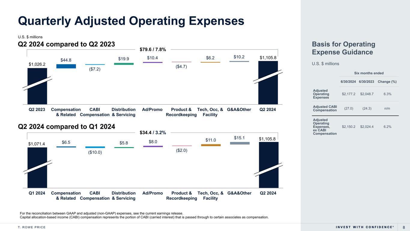 7T. R O W E P R I C E $154.8 ($24.0) ($14.6) $6.9 Q2 2023 Investment Advisory Fees CABI CABI (Amortization/Impairment) Admin & Distribution Q2 2024 Quarterly Net Revenues U.S. $ millions ▪ Investment advisory fees represent about 90% of net revenue in the periods presented ▪ Q2 2024 investment advisory revenue was $1,585.6M ▪ CABI was $27M in Q2 2024 compared to $51M in Q2 2023 Q2 2024 compared to Q1 2024 Q2 2024 compared to Q2 2023 $31.6 ($32.5) ($14.5) ($1.5) Q1 2024 Investment Advisory Fees CABI CABI (Amortization/Impairment) Admin & Distribution Q2 2024 Capital allocation-based income (CABI) $123.1 / 7.6% ($16.9) / (1.0)% $1,610.2 $1,733.3 $1,733.3$1,750.2