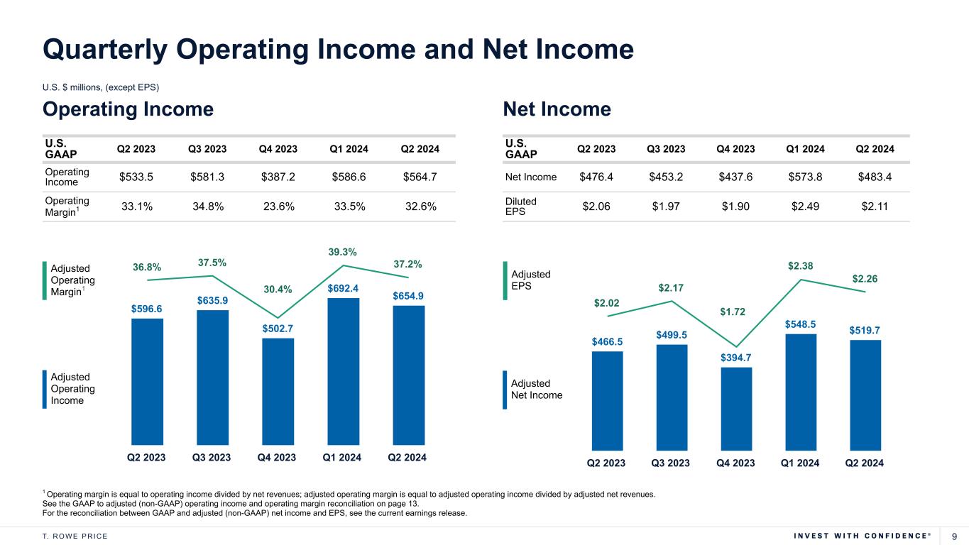 8T. R O W E P R I C E $6.5 ($10.0) $5.8 $8.0 ($2.0) $11.0 $15.1 Q1 2024 Compensation & Related CABI Compensation Distribution & Servicing Ad/Promo Product & Recordkeeping Tech, Occ, & Facility G&A&Other Q2 2024 Quarterly Adjusted Operating Expenses U.S. $ millions Q2 2024 compared to Q2 2023 $44.8 ($7.2) $19.9 $10.4 ($4.7) $6.2 $10.2 Q2 2023 Compensation & Related CABI Compensation Distribution & Servicing Ad/Promo Product & Recordkeeping Tech, Occ, & Facility G&A&Other Q2 2024 Q2 2024 compared to Q1 2024 For the reconciliation between GAAP and adjusted (non-GAAP) expenses, see the current earnings release. Capital allocation-based income (CABI) compensation represents the portion of CABI (carried interest) that is passed through to certain associates as compensation. $79.6 / 7.8% $1,026.2 $34.4 / 3.2% $1,071.4 $1,105.8 $1,105.8 Six months ended 6/30/2024 6/30/2023 Change (%) Adjusted Operating Expenses $2,177.2 $2,048.7 6.3% Adjusted CABI Compensation (27.0) (24.3) n/m Adjusted Operating Expenses, ex CABI Compensation $2,150.2 $2,024.4 6.2% Basis for Operating Expense Guidance U.S. $ millions