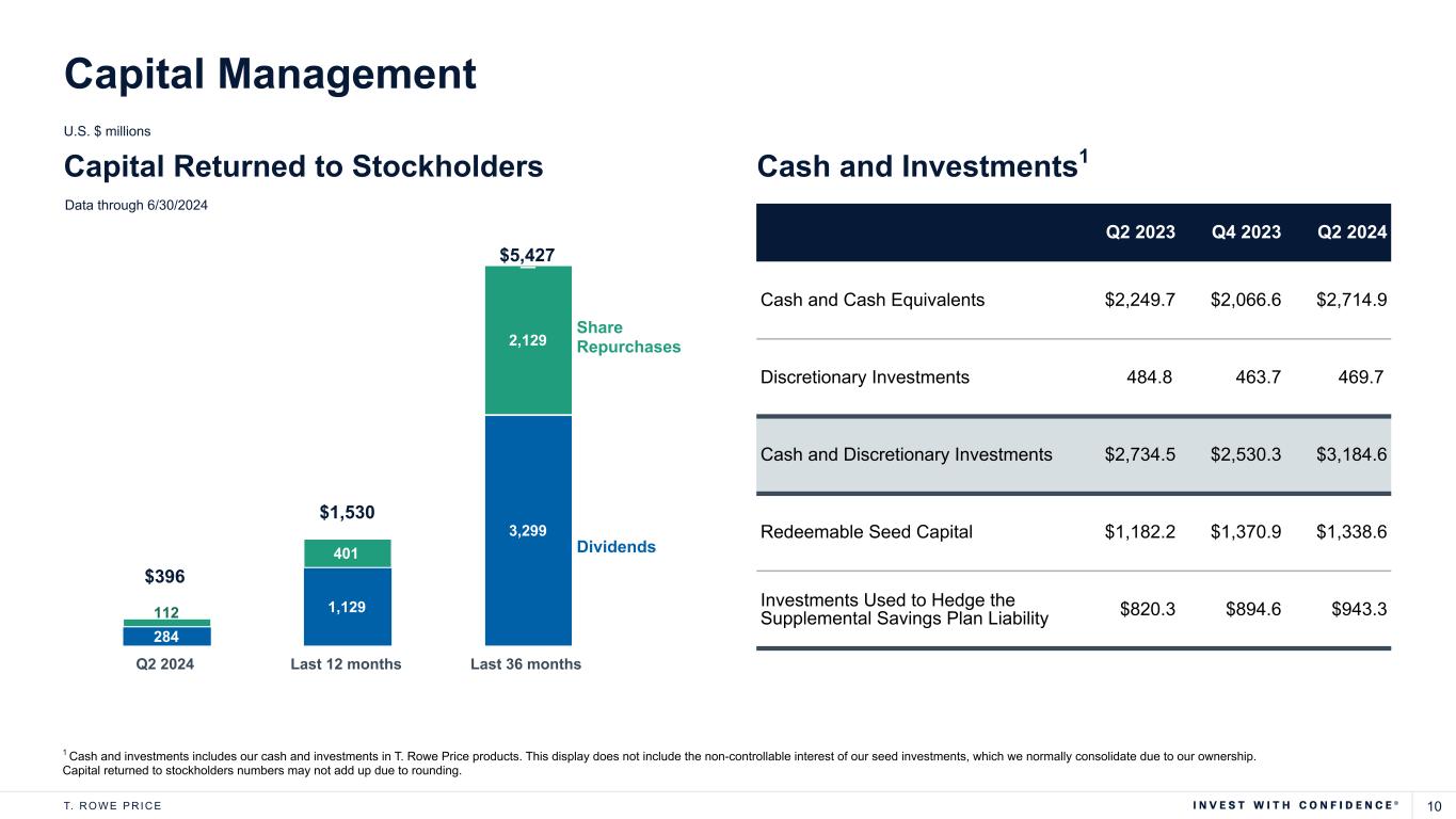 9T. R O W E P R I C E 1 Operating margin is equal to operating income divided by net revenues; adjusted operating margin is equal to adjusted operating income divided by adjusted net revenues. See the GAAP to adjusted (non-GAAP) operating income and operating margin reconciliation on page 13. For the reconciliation between GAAP and adjusted (non-GAAP) net income and EPS, see the current earnings release. Net Income U.S. $ millions, (except EPS) Quarterly Operating Income and Net Income U.S. GAAP Q2 2023 Q3 2023 Q4 2023 Q1 2024 Q2 2024 Net Income $476.4 $453.2 $437.6 $573.8 $483.4 Diluted EPS $2.06 $1.97 $1.90 $2.49 $2.11 Operating Income U.S. GAAP Q2 2023 Q3 2023 Q4 2023 Q1 2024 Q2 2024 Operating Income $533.5 $581.3 $387.2 $586.6 $564.7 Operating Margin1 33.1% 34.8% 23.6% 33.5% 32.6% Adjusted Operating Income Adjusted Operating Margin1 $596.6 $635.9 $502.7 $692.4 $654.9 36.8% 37.5% 39.3% 37.2% Q2 2023 Q3 2023 Q4 2023 Q1 2024 Q2 2024 Adjusted Net Income Adjusted EPS $466.5 $499.5 $394.7 $548.5 $519.7 $2.02 $2.17 $2.38 $2.26 Q2 2023 Q3 2023 Q4 2023 Q1 2024 Q2 2024 $1.72 30.4%