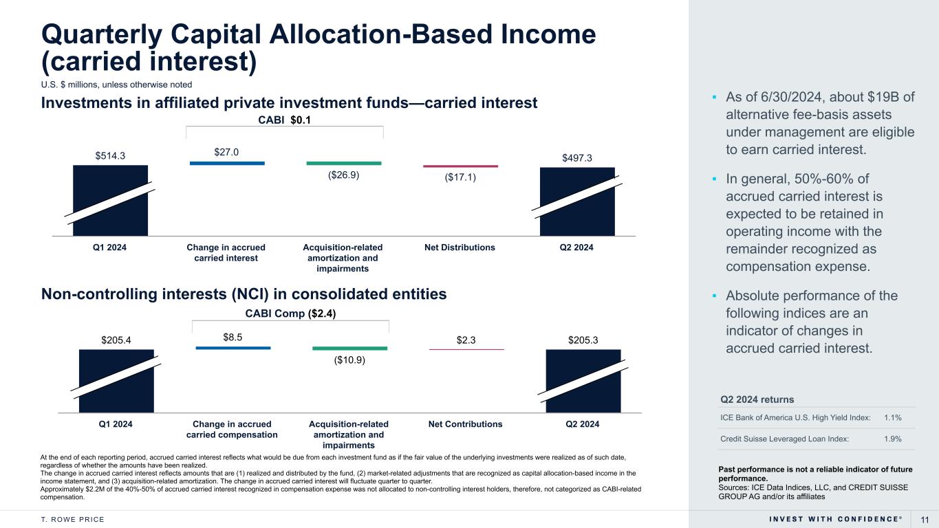 10T. R O W E P R I C E Capital Returned to Stockholders Cash and Investments1 1 Cash and investments includes our cash and investments in T. Rowe Price products. This display does not include the non-controllable interest of our seed investments, which we normally consolidate due to our ownership. Capital returned to stockholders numbers may not add up due to rounding. U.S. $ millions Capital Management Data through 6/30/2024 Q2 2023 Q4 2023 Q2 2024 Cash and Cash Equivalents $2,249.7 $2,066.6 $2,714.9 Discretionary Investments 484.8 463.7 469.7 Cash and Discretionary Investments $2,734.5 $2,530.3 $3,184.6 Redeemable Seed Capital $1,182.2 $1,370.9 $1,338.6 Investments Used to Hedge the Supplemental Savings Plan Liability $820.3 $894.6 $943.3 284 1,129 3,299 112 401 2,129 — — — Q2 2024 Last 12 months Last 36 months $5,427 $1,530 $396 Dividends Share Repurchases
