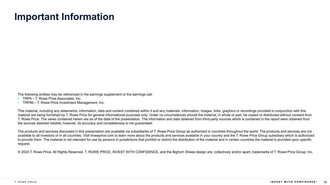 16T. R O W E P R I C E Important Information The following entities may be referenced in the earnings supplement or the earnings call: ▪ TRPA – T. Rowe Price Associates, Inc. ▪ TRPIM – T. Rowe Price Investment Management, Inc. This material, including any statements, information, data and content contained within it and any materials, information, images, links, graphics or recordings provided in conjunction with this material are being furnished by T. Rowe Price for general informational purposes only. Under no circumstances should the material, in whole or part, be copied or distributed without consent from T. Rowe Price. The views contained herein are as of the date of the presentation. The information and data obtained from third-party sources which is contained in the report were obtained from the sources deemed reliable; however, its accuracy and completeness is not guaranteed. The products and services discussed in this presentation are available via subsidiaries of T. Rowe Price Group as authorized in countries throughout the world. The products and services are not available to all investors or in all countries. Visit troweprice.com to learn more about the products and services available in your country and the T. Rowe Price Group subsidiary which is authorized to provide them. The material is not intended for use by persons in jurisdictions that prohibit or restrict the distribution of the material and in certain countries the material is provided upon specific request. © 2024 T. Rowe Price. All Rights Reserved. T. ROWE PRICE, INVEST WITH CONFIDENCE, and the Bighorn Sheep design are, collectively and/or apart, trademarks of T. Rowe Price Group, Inc.