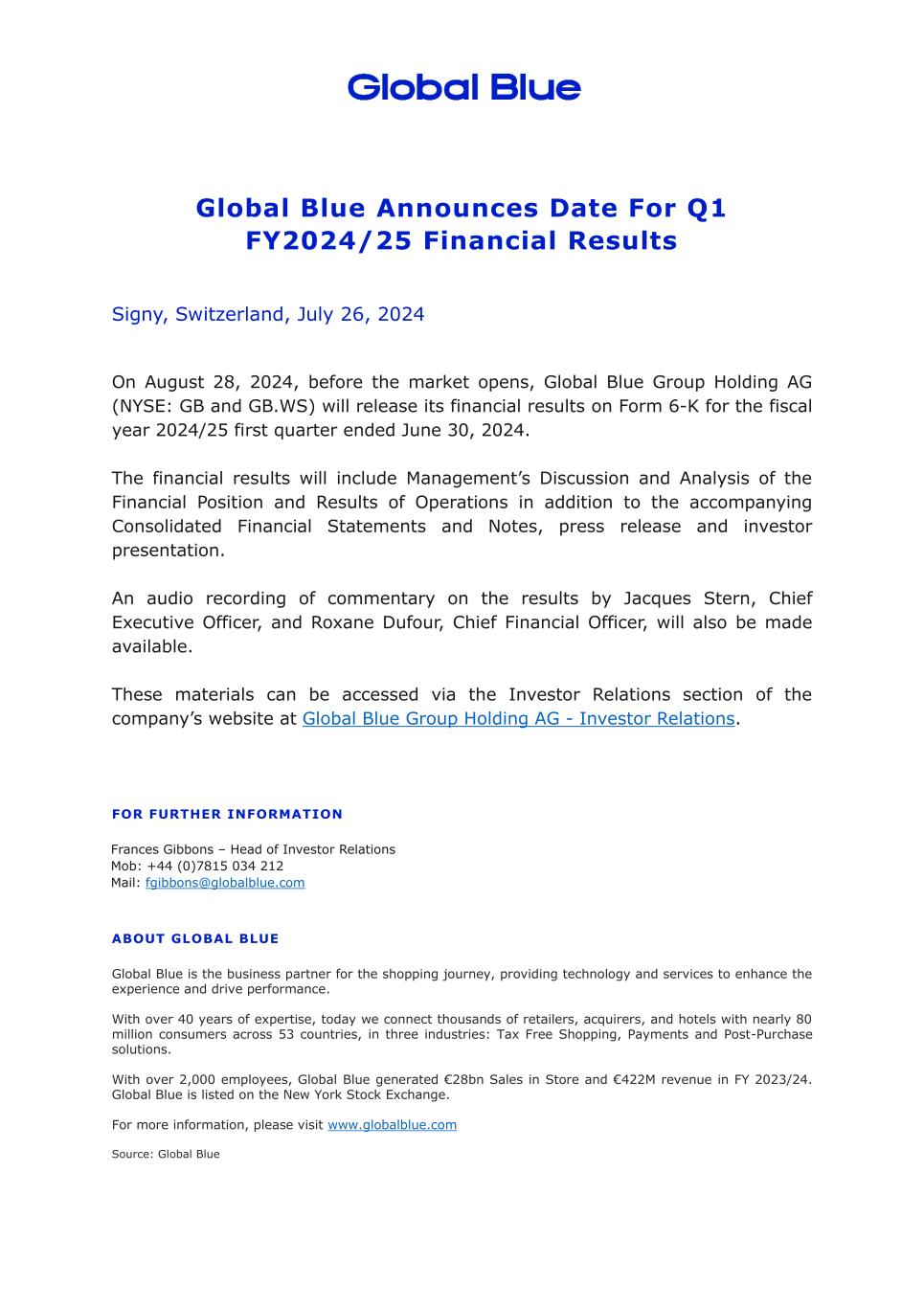 This report on Form 6-K comprises of Global Blue Group Holding AG’s (‘the Company’ or ‘Global Blue’) press release announcing the date of the release of the three-month period ended June 30, 2024 financial results of the Company, which is attached hereto as Exhibit 99.1.