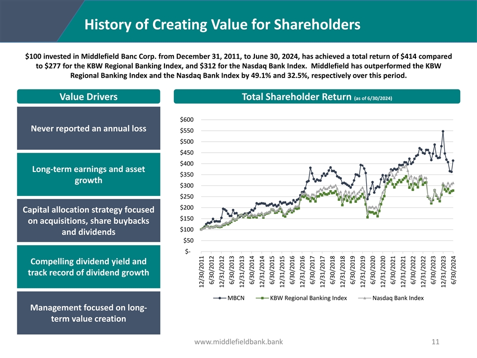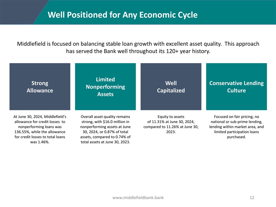 History of Creating Value for Shareholders $100 invested in Middlefield Banc Corp. from December 31, 2011, to June 30, 2024, has achieved a total return of $414 compared to $277 for the KBW Regional Banking Index, and $312 for the Nasdaq Bank Index. Middlefield has outperformed the KBW Regional Banking Index and the Nasdaq Bank Index by 49.1% and 32.5%, respectively over this period. Value Drivers Total Shareholder Return (as of 6/30/2024) $600 Never reported an annual loss $550 $500 $450 $400 Long-term earnings and asset $350 growth $300 $250 $200 Capital allocation strategy focused $150 on acquisitions, share buybacks $100 and dividends $50 $- Compelling dividend yield and track record of dividend growth MBCN KBW Regional Banking Index Nasdaq Bank Index Management focused on long- term value creation www.middlefieldbank.bank 11 12/30/2011 6/30/2012 12/31/2012 6/30/2013 12/31/2013 6/30/2014 12/31/2014 6/30/2015 12/31/2015 6/30/2016 12/31/2016 6/30/2017 12/31/2017 6/30/2018 12/31/2018 6/30/2019 12/31/2019 6/30/2020 12/31/2020 6/30/2021 12/31/2021 6/30/2022 12/31/2022 6/30/2023 12/31/2023 6/30/2024
