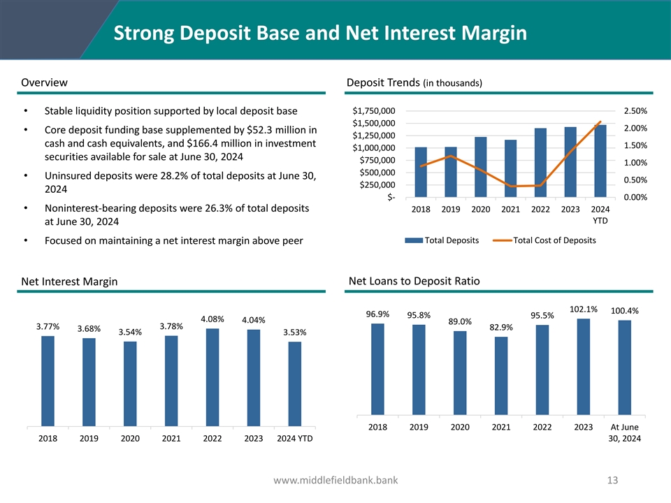 Well Positioned for Any Economic Cycle Middlefield is focused on balancing stable loan growth with excellent asset quality. This approach has served the Bank well throughout its 120+ year history. Limited Strong Well Conservative Lending Nonperforming Allowance Capitalized Culture Assets At June 30, 2024, Middlefield’s Overall asset quality remains Equity to assets Focused on fair pricing, no allowance for credit losses to strong, with $16.0 million in of 11.31% at June 30, 2024, national or sub-prime lending, nonperforming loans was nonperforming assets at June compared to 11.26% at June 30, lending within market area, and 136.55%, while the allowance 30, 2024, or 0.87% of total 2023. limited participation loans for credit losses to total loans assets, compared to 0.74% of purchased. was 1.46%. total assets at June 30, 2023. www.middlefieldbank.bank 12