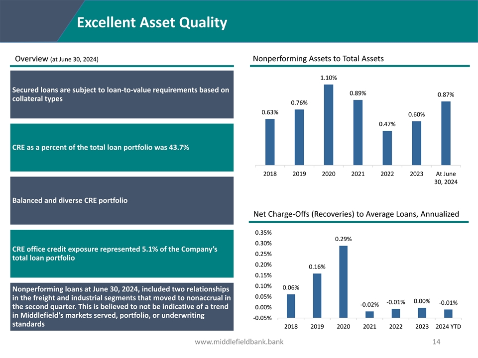 Strong Deposit Base and Net Interest Margin Overview Deposit Trends (in thousands) $1,750,000 2.50% • Stable liquidity position supported by local deposit base $1,500,000 2.00% • Core deposit funding base supplemented by $52.3 million in $1,250,000 cash and cash equivalents, and $166.4 million in investment 1.50% $1,000,000 securities available for sale at June 30, 2024 $750,000 1.00% $500,000 • Uninsured deposits were 28.2% of total deposits at June 30, 0.50% $250,000 2024 $- 0.00% • Noninterest-bearing deposits were 26.3% of total deposits 2018 2019 2020 2021 2022 2023 2024 YTD at June 30, 2024 Total Deposits Total Cost of Deposits • Focused on maintaining a net interest margin above peer Net Interest Margin Net Loans to Deposit Ratio 102.1% 100.4% 96.9% 95.8% 95.5% 4.08% 4.04% 89.0% 3.77% 3.78% 82.9% 3.68% 3.54% 3.53% 2018 2019 2020 2021 2022 2023 At June 2018 2019 2020 2021 2022 2023 2024 YTD 30, 2024 www.middlefieldbank.bank 13