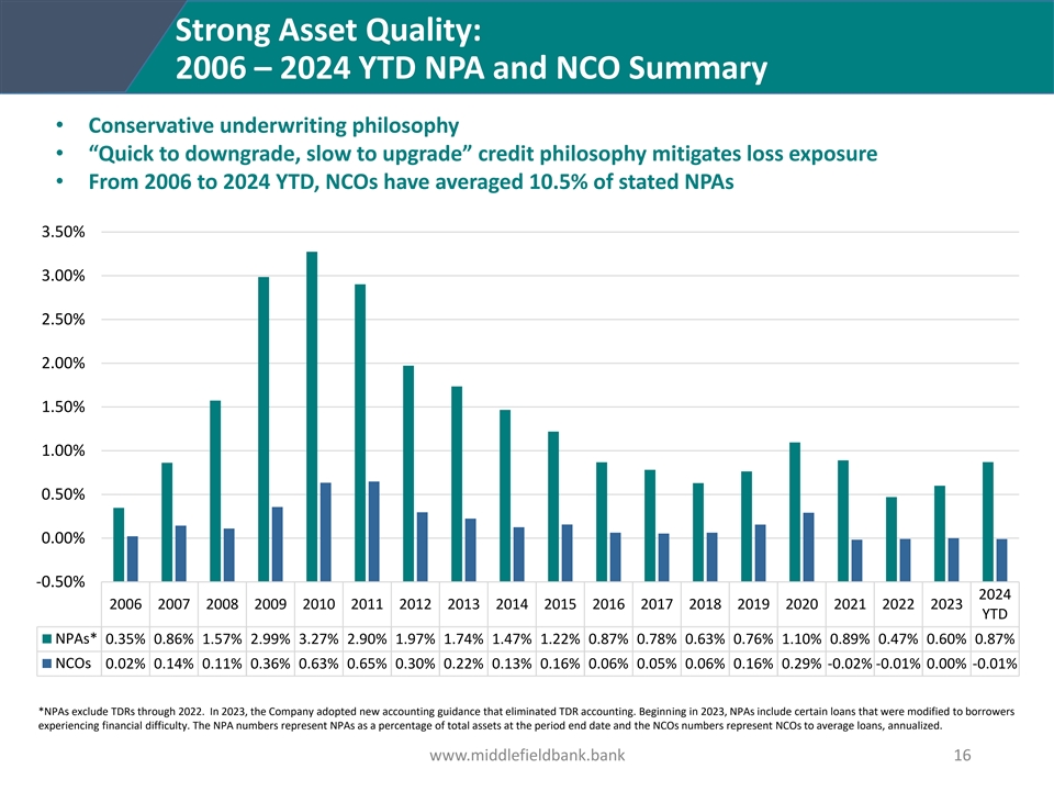 Balanced, High Performing CRE Portfolio (at June 30, 2024) Diverse CRE Portfolio CRE Loan Repricing 4.4% At June 30, 2024, 75% of the Company’s $655.4 million CRE portfolio was variable, and 14% of the total CRE portfolio is expected to reprice from Q3 2024 to Q2 2025 11.6% 13.3% 8.4% 6.0% Q3 2024 $58.9M 10.9% Q4 2024 $14.3M 45.4% Q1 2025 $9.1M Office Space Hospitality Self Storage Multifamily Q2 2025 $9.5M Shopping Plazas Senior Living Other Excellent CRE Credit Quality 13.3% 1.87% 1.73% 27.9% 58.8% 0.00% CRE ACL/CRE Loans CRE NPL/CRE Loans CRE Net Recoveries/Average CRE Owner Occupied Loans Non-Owner Occupied Multifamily www.middlefieldbank.bank 15
