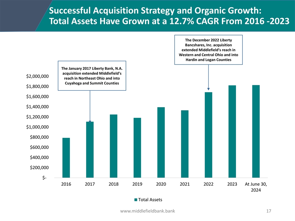 Strong Asset Quality: 2006 – 2024 YTD NPA and NCO Summary • Conservative underwriting philosophy • “Quick to downgrade, slow to upgrade” credit philosophy mitigates loss exposure • From 2006 to 2024 YTD, NCOs have averaged 10.5% of stated NPAs 3.50% 3.00% 2.50% 2.00% 1.50% 1.00% 0.50% 0.00% -0.50% 2024 2006 2007 2008 2009 2010 2011 2012 2013 2014 2015 2016 2017 2018 2019 2020 2021 2022 2023 YTD NPAs* 0.35% 0.86% 1.57% 2.99% 3.27% 2.90% 1.97% 1.74% 1.47% 1.22% 0.87% 0.78% 0.63% 0.76% 1.10% 0.89% 0.47% 0.60% 0.87% NCOs 0.02% 0.14% 0.11% 0.36% 0.63% 0.65% 0.30% 0.22% 0.13% 0.16% 0.06% 0.05% 0.06% 0.16% 0.29% -0.02% -0.01% 0.00% -0.01% *NPAs exclude TDRs through 2022. In 2023, the Company adopted new accounting guidance that eliminated TDR accounting. Beginning in 2023, NPAs include certain loans that were modified to borrowers experiencing financial difficulty. The NPA numbers represent NPAs as a percentage of total assets at the period end date and the NCOs numbers represent NCOs to average loans, annualized. www.middlefieldbank.bank 16