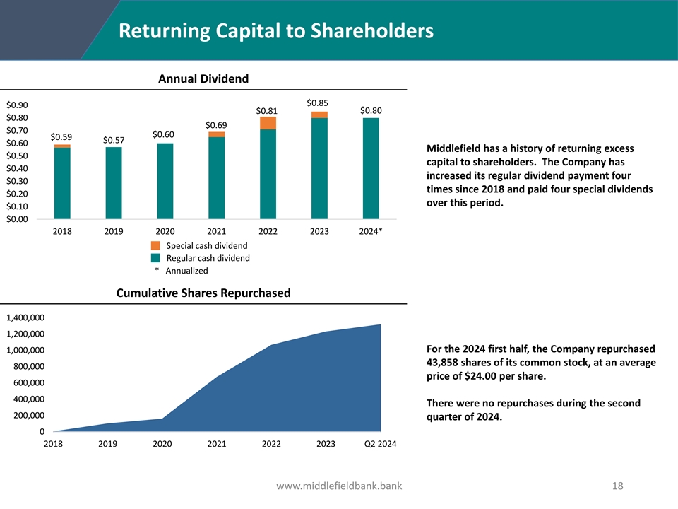 Annual Financial Summary Dollars in thousands 2023 2022 2021 2020 2019 2018 Net interest income $ 65,203 $ 50,177 $ 48,140 $ 43,388 $ 41,385 $ 40,448 Provision for loan losses 3,002 0 700 9,840 890 840 Noninterest income 6,691 6,746 7,249 5,990 4,841 3,728 Noninterest expense 48,137 38,030 31,991 29,788 30,033 28,743 Income before income taxes 20,755 18,893 22,698 9,750 15,303 14,593 Income taxes 3,387 3,220 4,065 1,401 2,592 2,162 Net income $ 17,368 $ 15,673 $ 18,633 $ 8,349 $ 12,711 $ 12,431 Net interest margin 4.04% 4.08% 3.78% 3.54% 3.68% 3.77% Total assets $1,822,883 $1,687,682 $1,331,006 $1,391,979 $1,182,475 $1,248,398 Loans outstanding, net $1,456,437 $1,338,434 $ 967,349 $1,090,626 $ 977,490 $ 984,681 Deposits $1,426,602 $1,402,019 $1,166,610 $1,225,200 $1,020,843 $1,016,067 Equity capital $ 205,681 $ 197,691 $ 145,335 $ 143,810 $ 137,775 $ 128,290 (1) Earnings per share – diluted $ 2.14 $ 2.60 $ 3.01 $ 1.31 $ 1.96 $ 1.92 (1) Cash dividend (per share) $ 0.85 $ 0.81 $ 0.69 $ 0.60 $ 0.57 $ 0.59 Dividend pay-out ratio 39.52% 37.23% 22.76% 45.92% 28.99% 30.40% Return on average assets 0.99% 1.17% 1.36% 0.64% 1.05% 1.09% Return on average equity 8.83% 11.25% 12.74% 5.87% 9.35% 9.94% (2) Return on average tangible common equity 11.20% 12.95% 14.38% 6.66% 10.72% 11.57% (1) Per share data adjusted for 2-for-1 stock split on November 8, 2019 (2) Refer to the Company’s press releases for the corresponding periods for “GAAP to Non-GAAP Reconciliations” www.middlefieldbank.bank 23