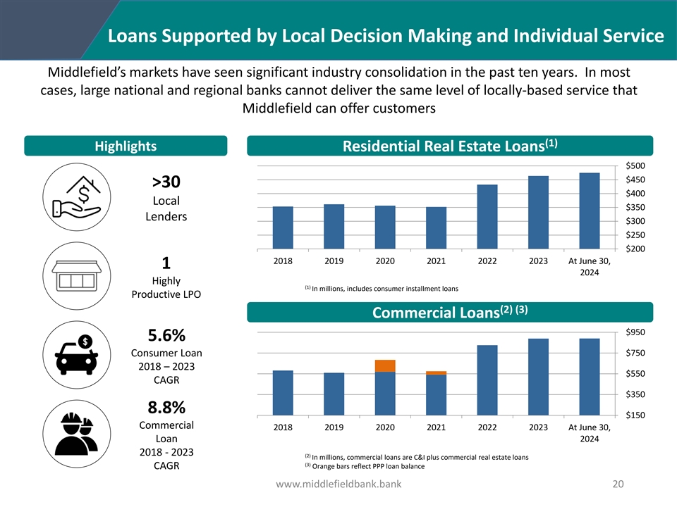 Returning Capital to Shareholders Annual Dividend $0.85 $0.90 $0.81 $0.80 $0.80 $0.69 $0.70 $0.60 $0.59 $0.57 $0.60 Middlefield has a history of returning excess $0.50 capital to shareholders. The Company has $0.40 increased its regular dividend payment four $0.30 times since 2018 and paid four special dividends $0.20 over this period. $0.10 $0.00 2018 2019 2020 2021 2022 2023 2024* Special cash dividend Regular cash dividend * Annualized Cumulative Shares Repurchased 1,400,000 1,200,000 For the 2024 first half, the Company repurchased 1,000,000 43,858 shares of its common stock, at an average 800,000 price of $24.00 per share. 600,000 400,000 There were no repurchases during the second 200,000 quarter of 2024. 0 2018 2019 2020 2021 2022 2023 Q2 2024 www.middlefieldbank.bank 18