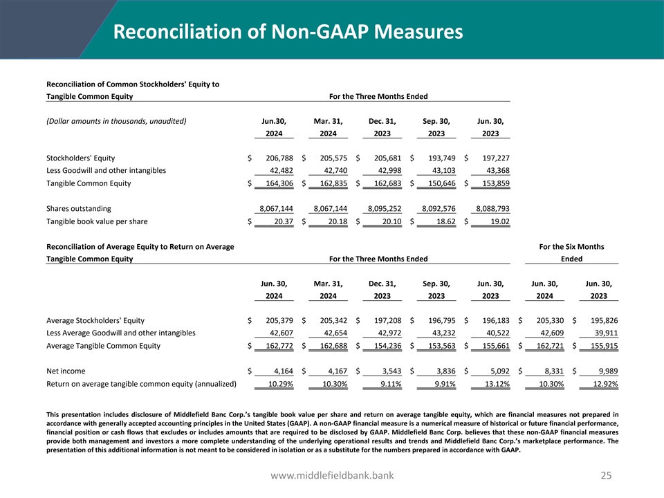 Reconciliation of Non-GAAP Measures Reconciliation of Common Stockholders' Equity to Tangible Common Equity For the Three Months Ended (Dollar amounts in thousands, unaudited) Jun.30, Mar. 31, Dec. 31, Sep. 30, Jun. 30, 2024 2024 2023 2023 2023 Stockholders' Equity $ 206,788 $ 205,575 $ 205,681 $ 193,749 $ 197,227 Less Goodwill and other intangibles 42,482 42,740 42,998 43,103 43,368 Tangible Common Equity $ 164,306 $ 162,835 $ 162,683 $ 150,646 $ 153,859 Shares outstanding 8,067,144 8,067,144 8,095,252 8,092,576 8,088,793 Tangible book value per share $ 20.37 $ 20.18 $ 20.10 $ 18.62 $ 19.02 Reconciliation of Average Equity to Return on Average For the Six Months Tangible Common Equity For the Three Months Ended Ended Jun. 30, Mar. 31, Dec. 31, Sep. 30, Jun. 30, Jun. 30, Jun. 30, 2024 2024 2023 2023 2023 2024 2023 Average Stockholders' Equity $ 205,379 $ 205,342 $ 197,208 $ 196,795 $ 196,183 $ 205,330 $ 195,826 Less Average Goodwill and other intangibles 42,607 42,654 42,972 43,232 40,522 42,609 39,911 Average Tangible Common Equity $ 162,772 $ 162,688 $ 154,236 $ 153,563 $ 155,661 $ 162,721 $ 155,915 Net income $ 4,164 $ 4,167 $ 3,543 $ 3,836 $ 5,092 $ 8,331 $ 9,989 Return on average tangible common equity (annualized) 10.29% 10.30% 9.11% 9.91% 13.12% 10.30% 12.92% This presentation includes disclosure of Middlefield Banc Corp.’s tangible book value per share and return on average tangible equity, which are financial measures not prepared in accordance with generally accepted accounting principles in the United States (GAAP). A non-GAAP financial measure is a numerical measure of historical or future financial performance, financial position or cash flows that excludes or includes amounts that are required to be disclosed by GAAP. Middlefield Banc Corp. believes that these non-GAAP financial measures provide both management and investors a more complete understanding of the underlying operational results and trends and Middlefield Banc Corp.’s marketplace performance. The presentation of this additional information is not meant to be considered in isolation or as a substitute for the numbers prepared in accordance with GAAP. www.middlefieldbank.bank 25