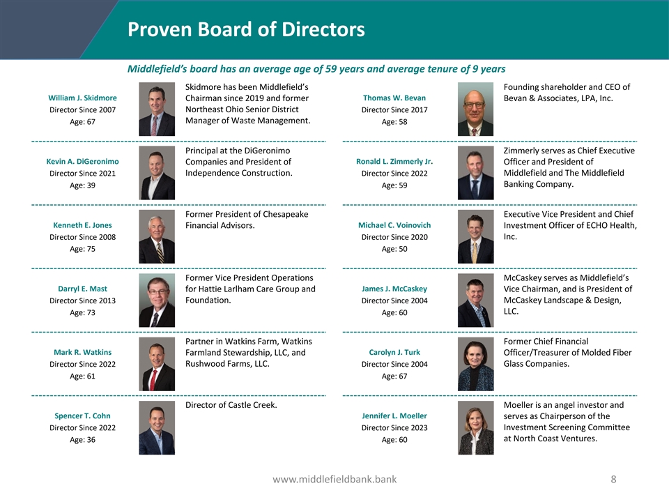 Experienced Executive Leadership Team Assembled Middlefield has focused on pursuing a comprehensive succession plan. Through the successful integration of the December 2022 Liberty Bancshares acquisition and addition of new, experienced leaders, Middlefield is well positioned to move forward with the next phase of its growth strategy. Zimmerly joined MBCN in 2022 after Ranttila has been with the Bank for Michael Ranttila Ronald L. Zimmerly Jr. the Liberty Bancshares acquisition over 12 years, beginning as a and has 35 years of banking Executive Vice President / Controller and then was promoted Chief Executive Officer experience, including 13 years as through pivotal roles within the and President Chief Financial Officer President and CEO of Liberty. Bank. Wilson joined MBCN in 2022 after Tom Wilson Michael Cheravitch the Liberty Bancshares acquisition Cheravitch joined MBCN in 2023 Executive Vice President / and has over 24 years of investment from F.N.B. Corporation and has Executive Vice President / Chief Strategy and banking, management consulting, over 35 years of banking experience. Chief Banking Officer Innovation Officer and investment experience. Sarah Winters Winters joined MBCN in 2023 from Courtney Erminio Erminio joined MBCN in 2010 from Senior Vice President / KeyCorp and has 24 years of HR Executive Vice President / Crowe Horwath and has 18 years of strategy, talent management, and Chief Human Resources audit, risk and business experience. Chief Risk Officer business experience. Officer Josh Riley Riley joined MBCN in 2023 from First Noblit joined MBCN in 2022 after the Rebecca Noblit Merchants Bank and has over 21 Liberty Bancshares acquisition and Senior Vice President / Executive Vice President / years of financial services experience has over 19 years of banking Chief Commercial Market Chief Credit Officer within the Central Ohio market. experience. Executive - Central Ohio Brenneman joined MBCN in 2022 Anna Maria Brenneman after the Liberty Bancshares Western Regional acquisition and has over 35 years of President banking experience. www.middlefieldbank.bank 7