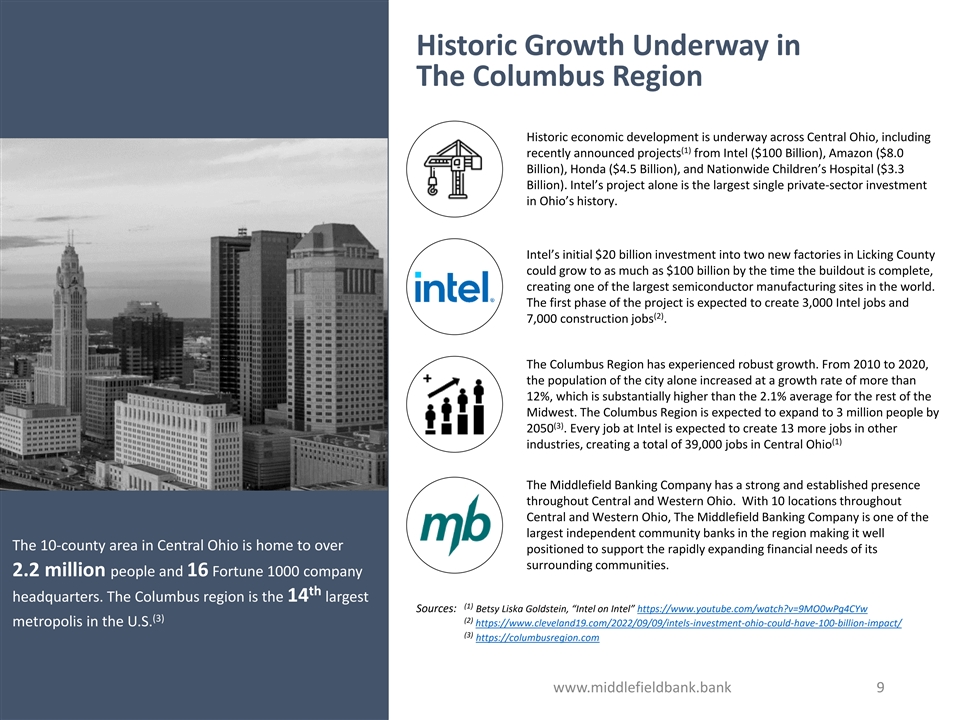 Historic Growth Underway in The Columbus Region Historic economic development is underway across Central Ohio, including (1) recently announced projects from Intel ($100 Billion), Amazon ($8.0 Billion), Honda ($4.5 Billion), and Nationwide Children’s Hospital ($3.3 Billion). Intel’s project alone is the largest single private-sector investment in Ohio’s history. Intel’s initial $20 billion investment into two new factories in Licking County could grow to as much as $100 billion by the time the buildout is complete, creating one of the largest semiconductor manufacturing sites in the world. The first phase of the project is expected to create 3,000 Intel jobs and (2) 7,000 construction jobs . The Columbus Region has experienced robust growth. From 2010 to 2020, the population of the city alone increased at a growth rate of more than 12%, which is substantially higher than the 2.1% average for the rest of the Midwest. The Columbus Region is expected to expand to 3 million people by (3) 2050 . Every job at Intel is expected to create 13 more jobs in other (1) industries, creating a total of 39,000 jobs in Central Ohio The Middlefield Banking Company has a strong and established presence throughout Central and Western Ohio. With 10 locations throughout Central and Western Ohio, The Middlefield Banking Company is one of the largest independent community banks in the region making it well The 10-county area in Central Ohio is home to over positioned to support the rapidly expanding financial needs of its surrounding communities. 2.2 million people and 16 Fortune 1000 company th headquarters. The Columbus region is the 14 largest (1) Sources: Betsy Liska Goldstein, “Intel on Intel” https://www.youtube.com/watch?v=9MO0wPg4CYw (3) (2) metropolis in the U.S. https://www.cleveland19.com/2022/09/09/intels-investment-ohio-could-have-100-billion-impact/ (3) https://columbusregion.com www.middlefieldbank.bank 9