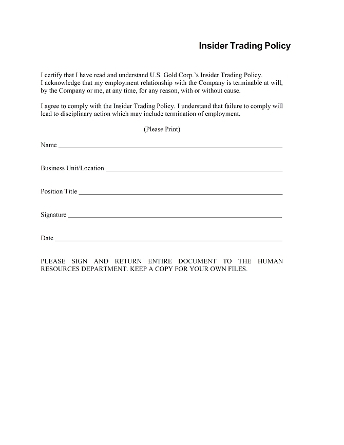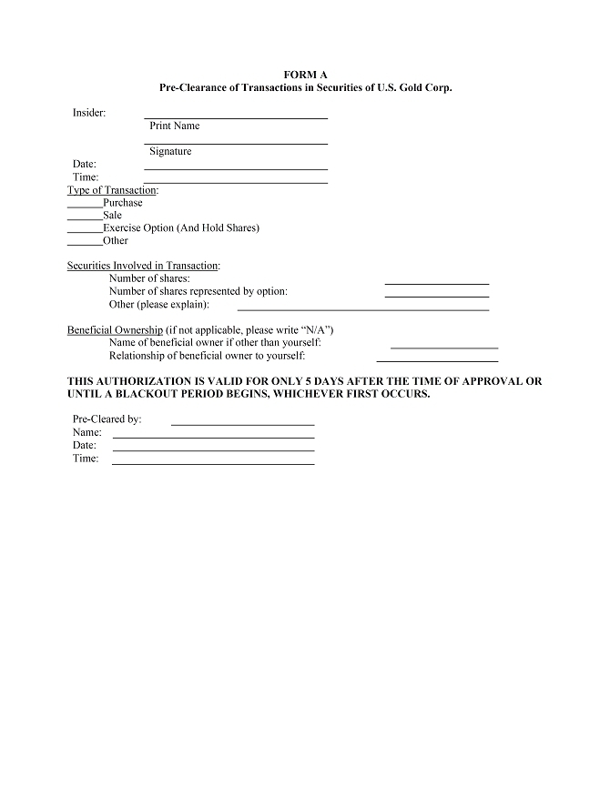 In connection with the Annual Report on Form 10-K of U.S. Gold Corp (the “Company”), as filed with the U.S. Securities and Exchange Commission on the date hereof (the “Report”), I, Eric Alexander, the Principal Financial and Accounting Officer of the Company, certify, pursuant to 18 U.S.C. Sec. 1350, as adopted pursuant to Sec. 906 of the Sarbanes-Oxley Act of 2002, that: