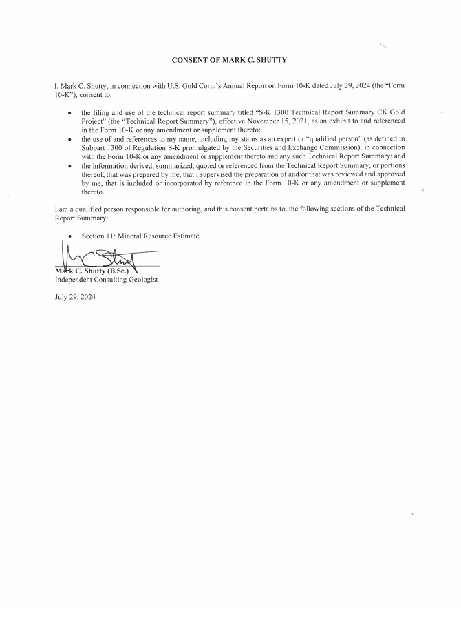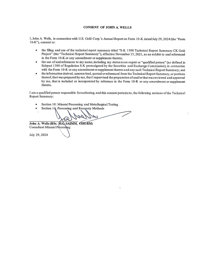 We consent to the incorporation by reference in the Registration Statement of U.S Gold Corp. and Subsidiaries on Form S-1 (File No. 333-253168) and Form S-3 (File No. 333-262415) of our report dated July 29, 2024, which included an explanatory paragraph as to the Company’s ability to continue as a going concern, with respect to our audits of the consolidated financial statements of U.S. Gold Corp. and Subsidiaries as of April 30, 2024 and 2023 and for the each of two years in the period ended April 30, 2024, which report is included in this Annual Report on Form 10-K of U.S. Gold Corp. and Subsidiaries for the year ended April 30, 2024.