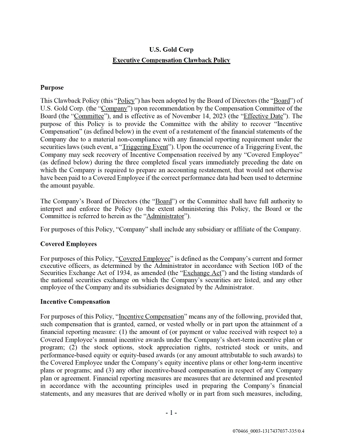 | 1) | I have reviewed this Annual Report on Form 10-K of U.S. Gold Corp. (the “registrant”); |